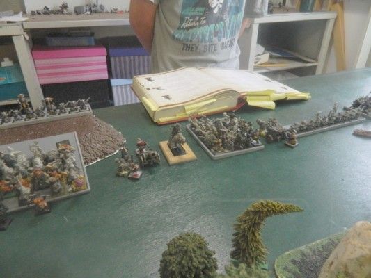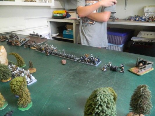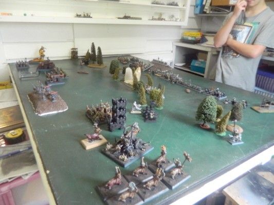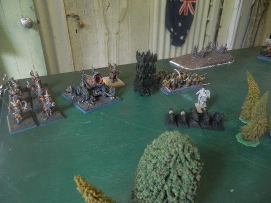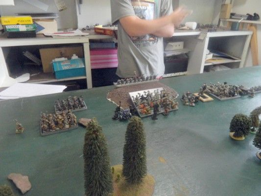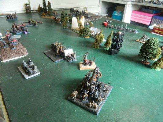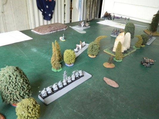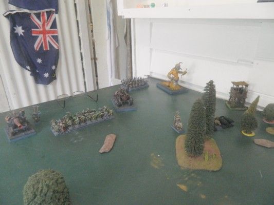 My son (Liam) set up the terrain whilst I was occupied elsewhere. He’d placed clumps of trees across the centre-line of the table and one hill in each deployment zone. The thing in the centre is the beginnings of a portal he is building. But as no one went through the object, it did nothing except scare people from going through it. There was also a watchtower on the western edge and a pig-sty in the northeast corner.