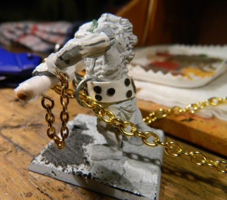 He is obviously a BFSP Troll. The bar he is pushing is a chuppa-chup lollipop stick. His belt is cardboard or plastic. The belts rivets are “railway nails”. The chains from cheap jewelry and any other rivets either small nails or metal pins