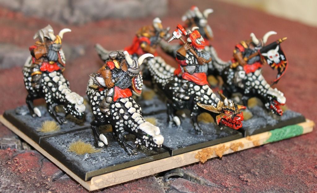 Lavizard Riders! Nice! :hat off A unique take, and I like it a lot. And I definitely agree that they fit your army. I see no reason why there would not be reptilian creatures lurking in the lava fields. Definitely a spot where cold blooded creatures might find some warmth.