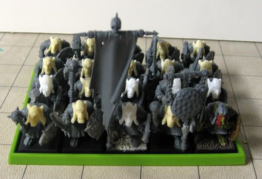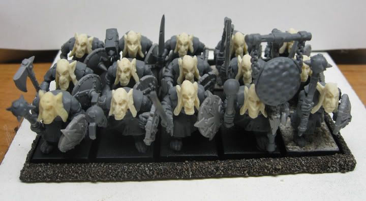 So here is my basic unit of hobgoblin Warriors. Trying to figure out a paint scheme for them. Should I go black robes like the Sneaky Gits or a more brown/burlap color? Maybe something else. I want them to be grimy and dirty looking.