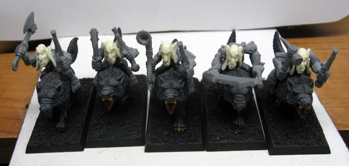 Here are my wolf riders (well, just placed on wolves right now, will be glued on when done). In m counts-as list, they are pistoleers. Otherwise, they have bows. I think blackpowder i more appropriate for a CD army, even for the hobgobs. More metal, more technology. Same deal with the color.