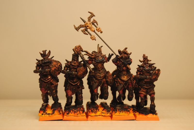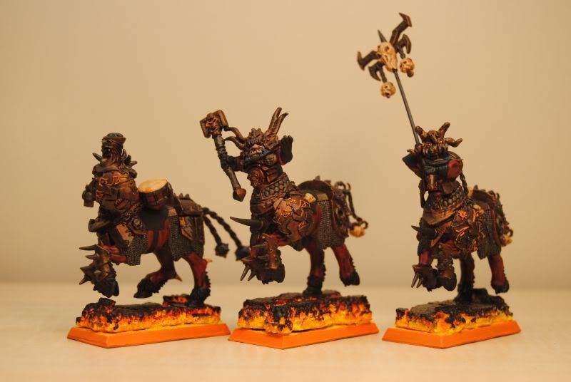 Nice rich colours on the wardens and neatly done. I do have an unhealthy love for dwarfs. The bull centaurs are also very good: just the right amount of contrast for chaos dwarfs to fit the theme without looking like they’re out of a disney cartoon (like most of my stuff does). I’m quiet partial to the over the top bases too.