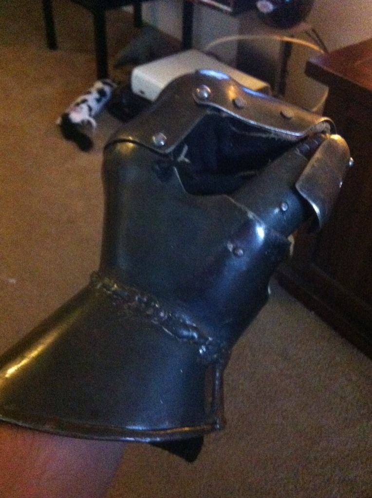 Lastly, I wasn’t going to show this one, because it’s a hideous picture, but this is something I was working on early last year. It’s called a Corazina, and is shaped plates of steel attached to a dyed leather fronting. I promise, it looks far better in person, and I’ll endeavor to get some snapshots of it sometimes soonish.