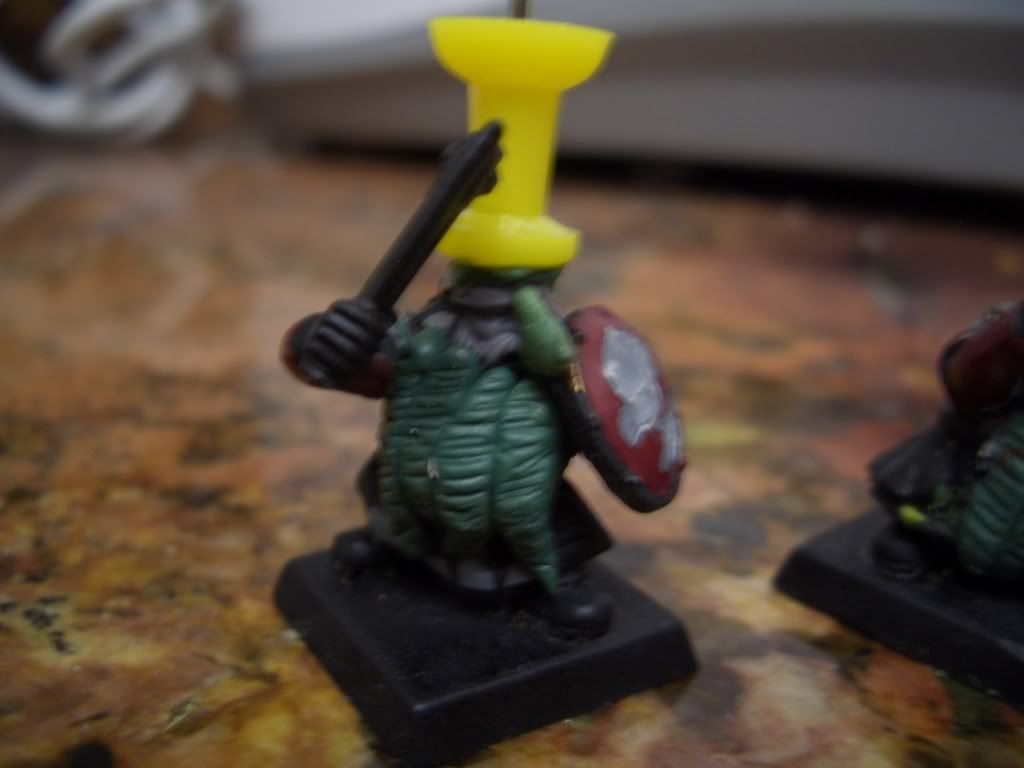 Pin hats are nice. I turned mine upside down from yours and drilled a hole in their heads so the pin is inside the Dwarf as shown below.
