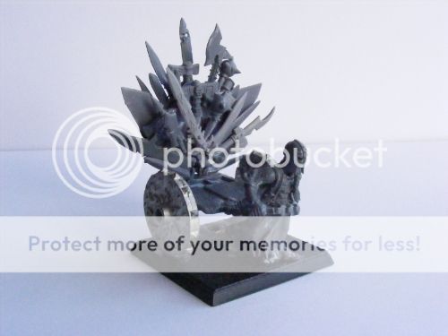 While Ashur himself hasn’t surfaced, his ride has. It’s just a unit filler as far as rules go, but I think it’ll get the point of “this is the guy in charge” when he’s on top. It’s completely kitbashed, with the blades all being from previous armies. This is clearly what happens when you watch too much GoT while modelling. The flatbed is just big enough to hold a model on a standard infantry base for Ashur, but I’ve also got a chest with some manner of dread relic within for small battles.