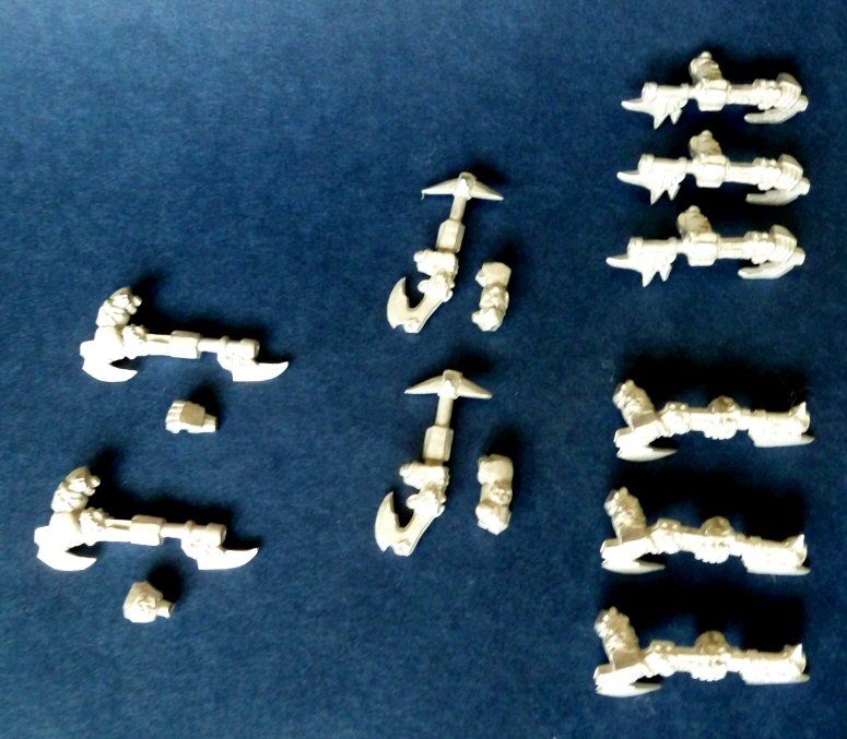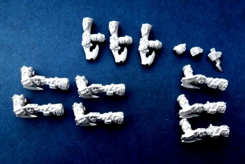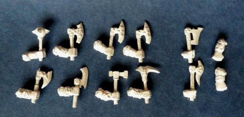 This set contains: Bottom left. 1 x Great Weapon held two handed (both with lower arms sculpted) Bottom middle. 1 x Great Weapon held two handed (only one lower arm sculpted) Bottom right. 2 x Great Weapon held one handed in left hand (no lower left arm sculpted, but comes with right arm) Top row. 5 x Great Weapon held one handed (lower arm sculpted, comes with left hand). There are 2 versions of this that I will have multiples of. So the 10th arm will be a random one of these two