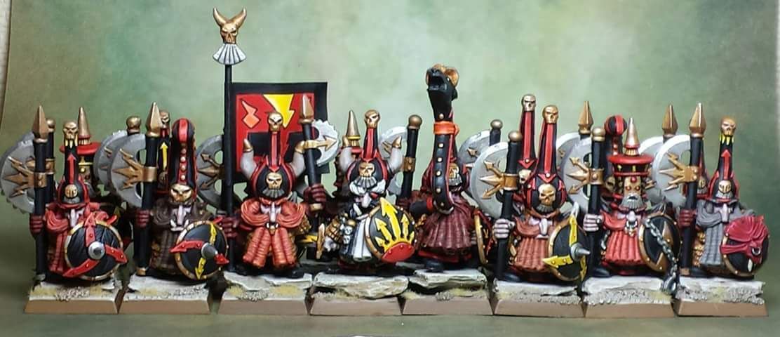 Love the standards! Great design and color! Also very well done on the black armor, and as it has been said before its great to see more grey skin Dawi-Zharr around.