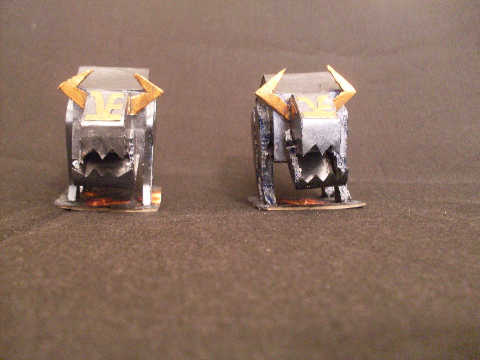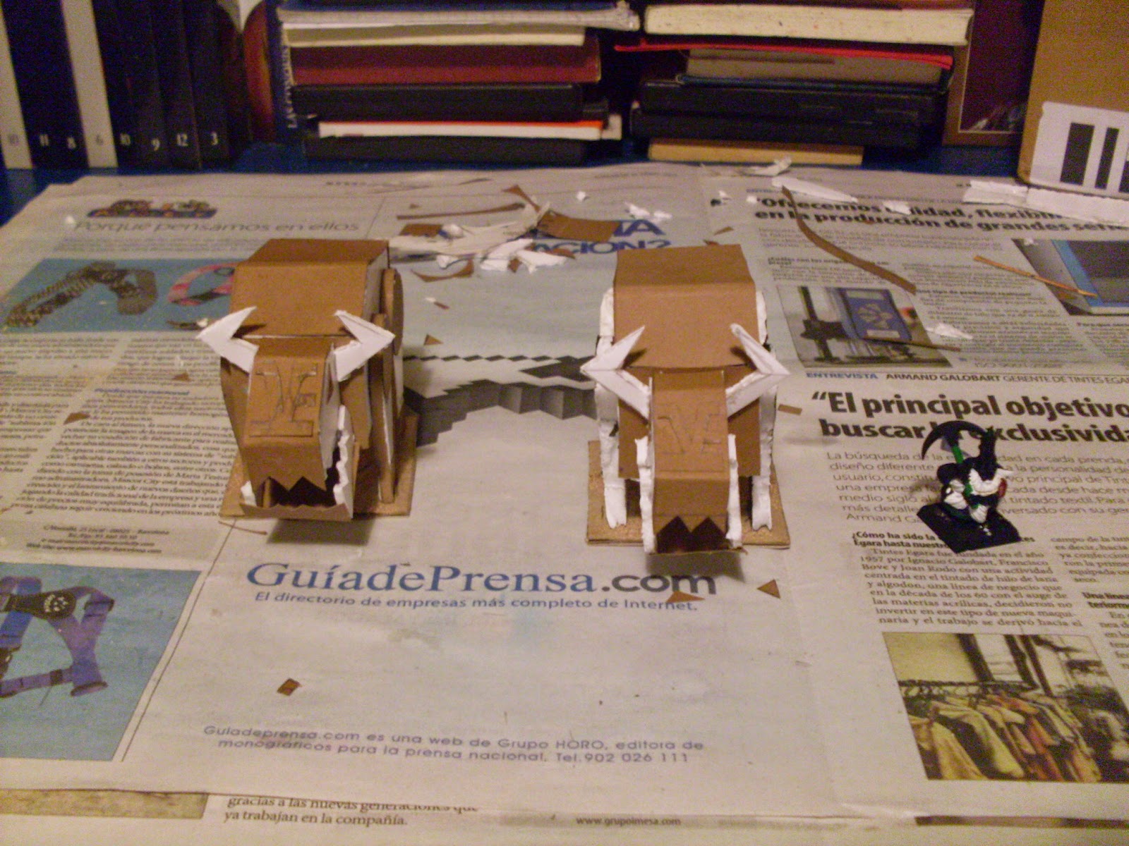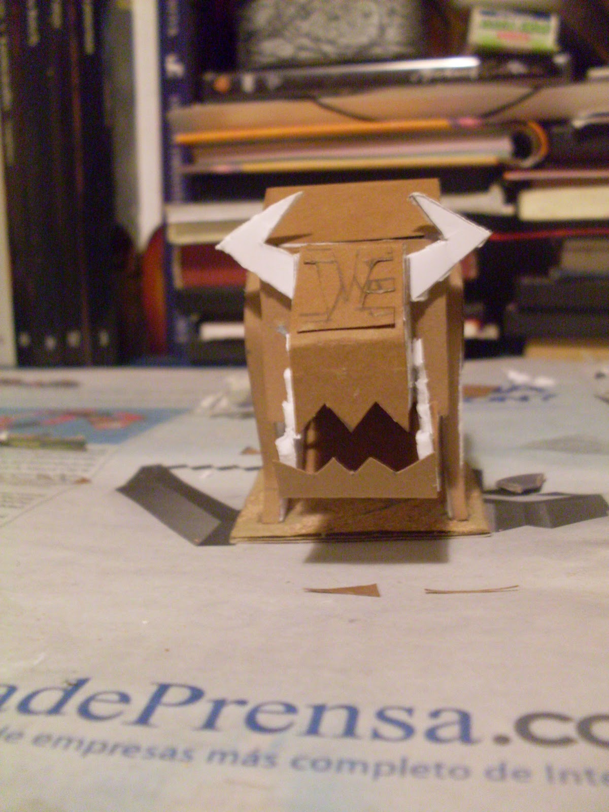 I wasn’t convinced with the legs of the first model that I made, so in the second I added a layer of cardboard along the sides of them, I also included a circular gear in the connection with the body of the construct to make it look like an articulation around wich the leg would turn. In the foots I added a hoof-looking plate to increase the bull aspect of the lot.