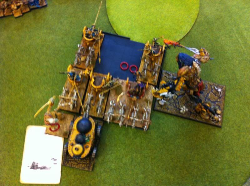 This is my Destroyer flanking Settra, and getting help from an Iron Daemon in the front - who in turn got flanked by a Bonegiant.