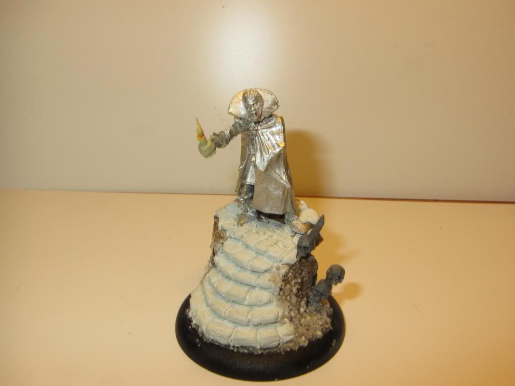 Last up is some scenic base work on Dracula for the Cinemassacre’s Monster Madness Warband. Wen’t for the most Bela Lugosi Like Vampire model I could find in the bitz arsenals of my friends: