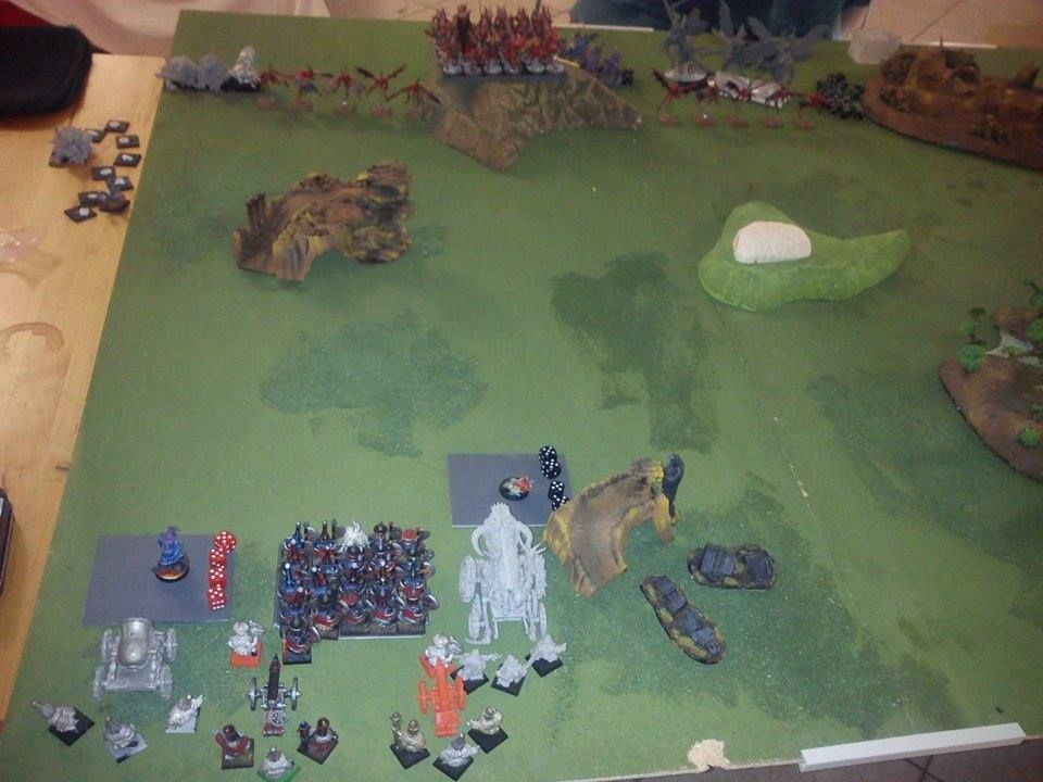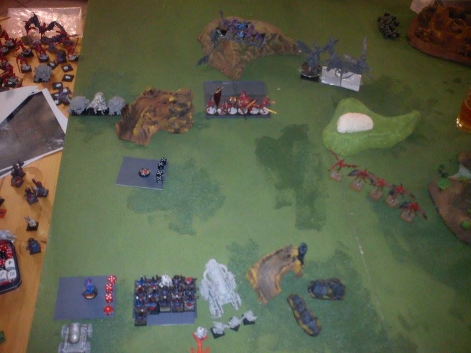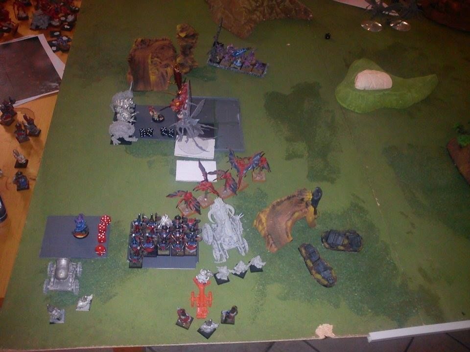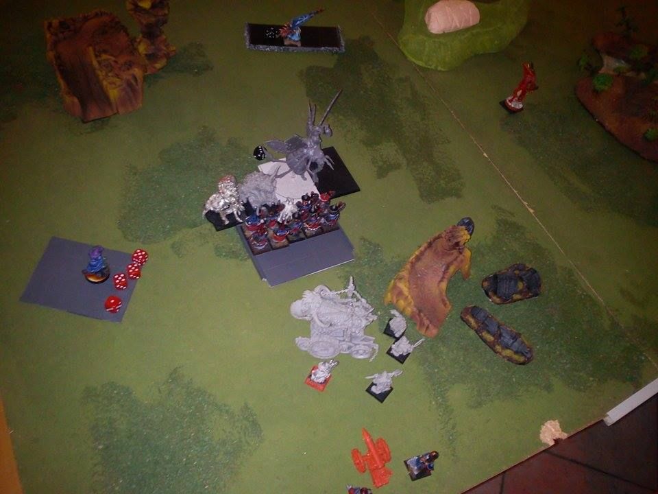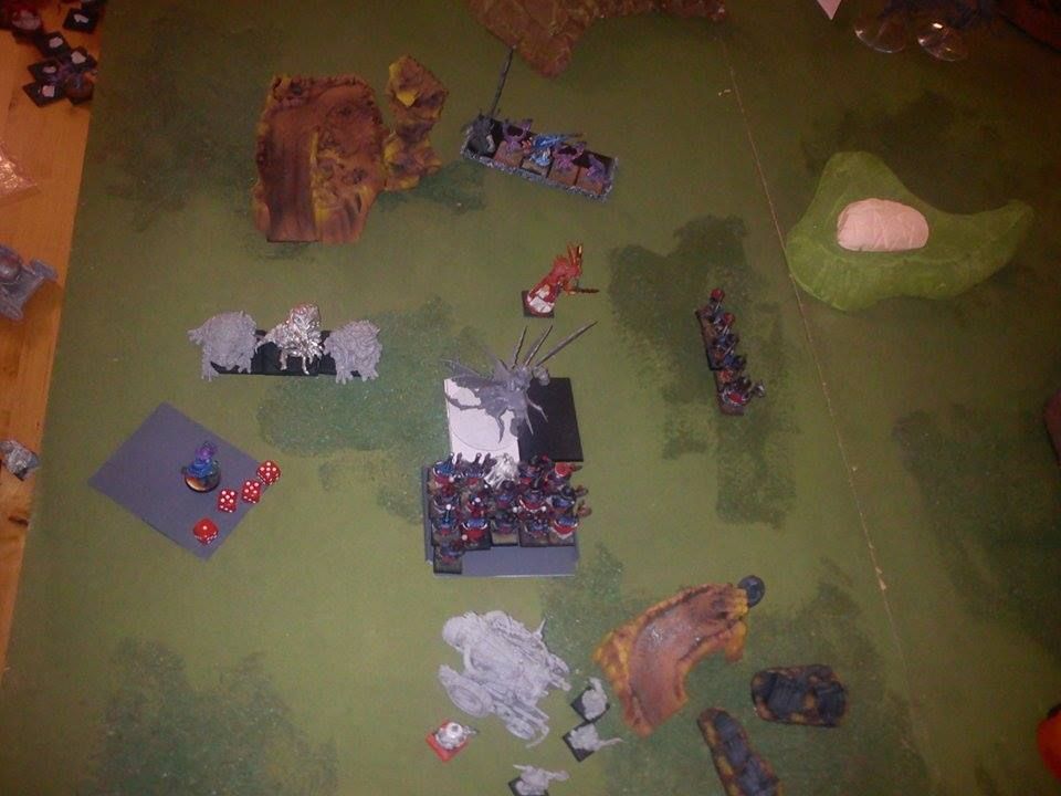 He win ofc the fight vs the hobbs and they flee towards the middle of the field, he chases with khorne but doesnt reach them, instead hold 3 slugs and 3 flies in position.