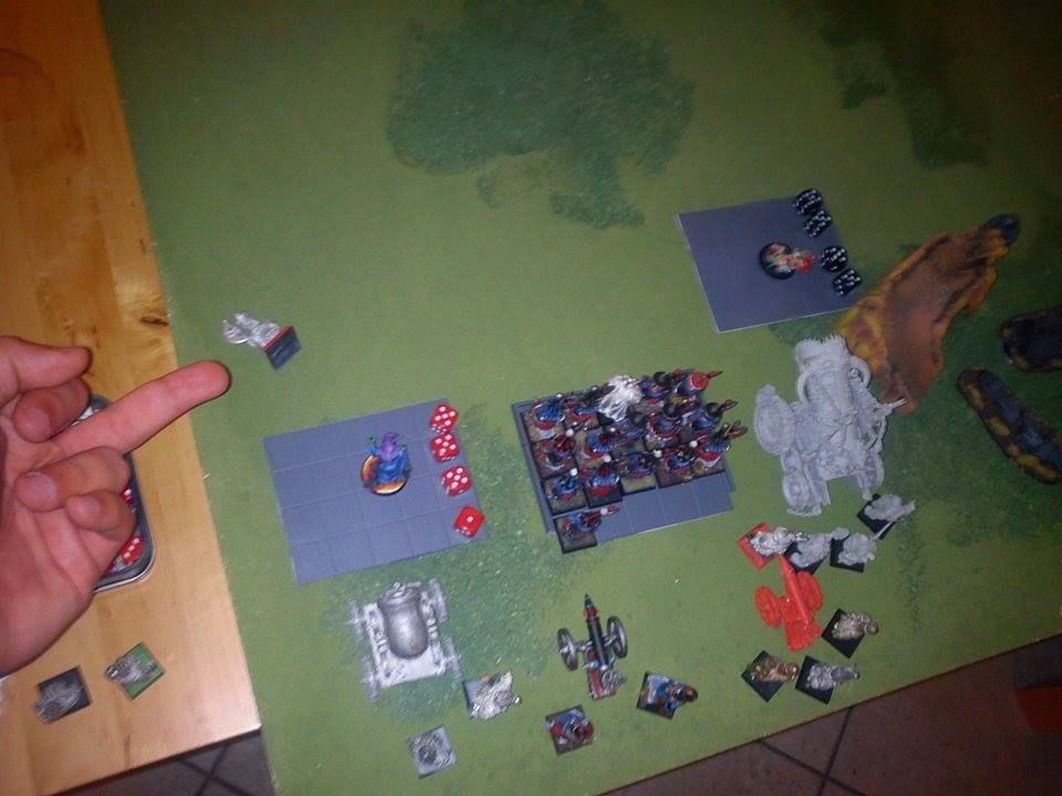 His last turn, he catches the 5 hobs with his general, charges with the slugs on the front of the IG. His magic doesnt go well and get 2 unstoppable, the 1st was a hit on the rocket that survived and his mage lost 3 lvls, the second unstoppable, much worse from the horrors unit hit my dwarves who cannot now use the benefit of BSB and rerolls.