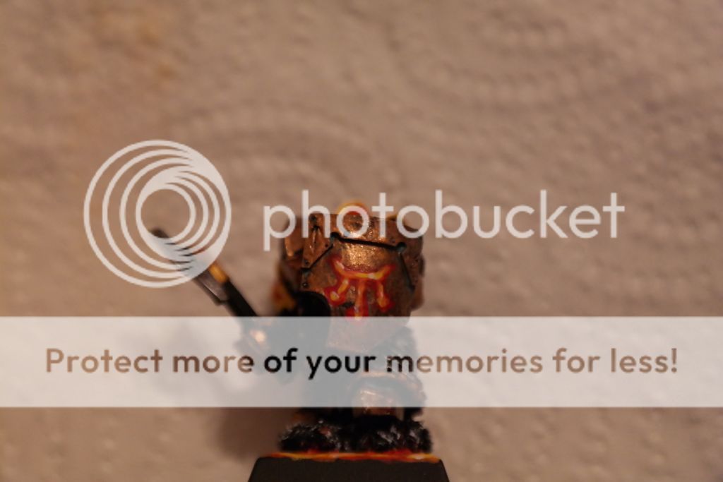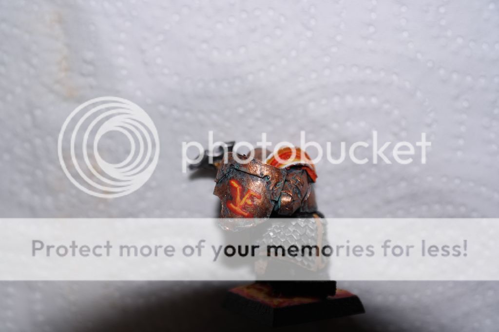 Their armour are painted differently. First one just got black undercoat, drybrushed with runefang steel at the edges. I wanted black armour effect with scratched edges. Picture may not showing it properly becouse of the flash. Again it was test ground before iron daemon. Second one got it the same like rest scale armours in the army. Boltgun metal -> badab black wash -> runefang steel highlight.