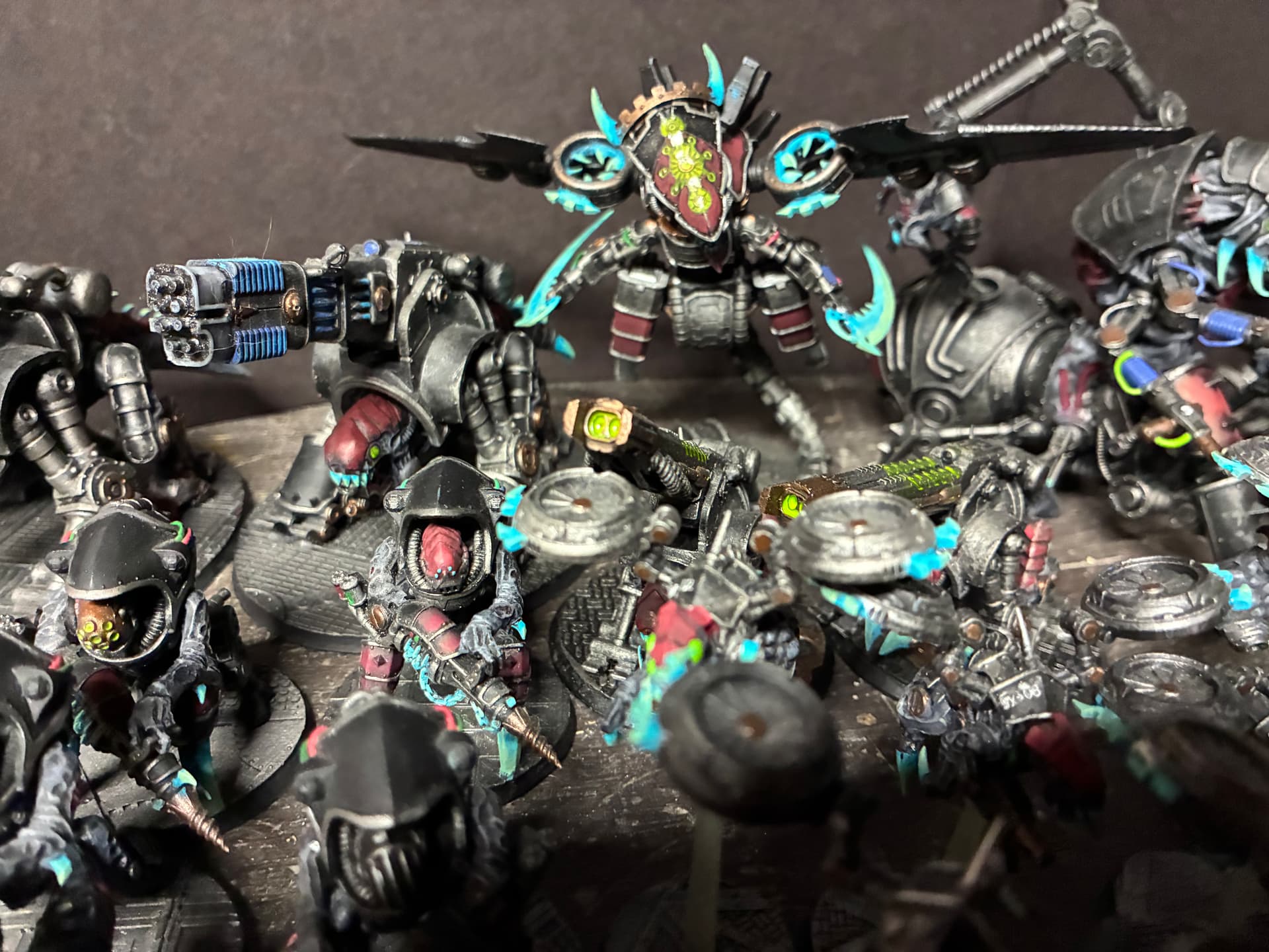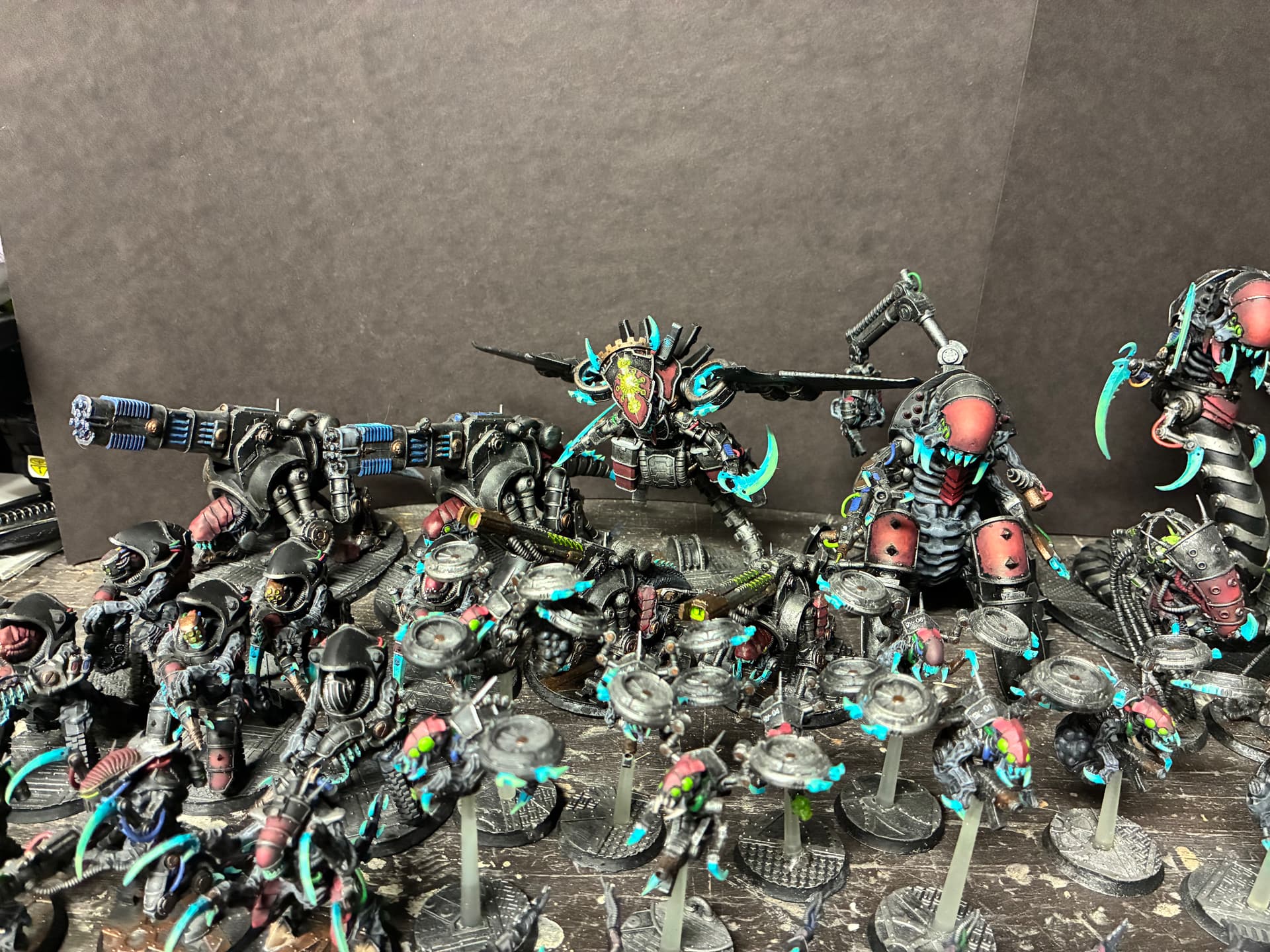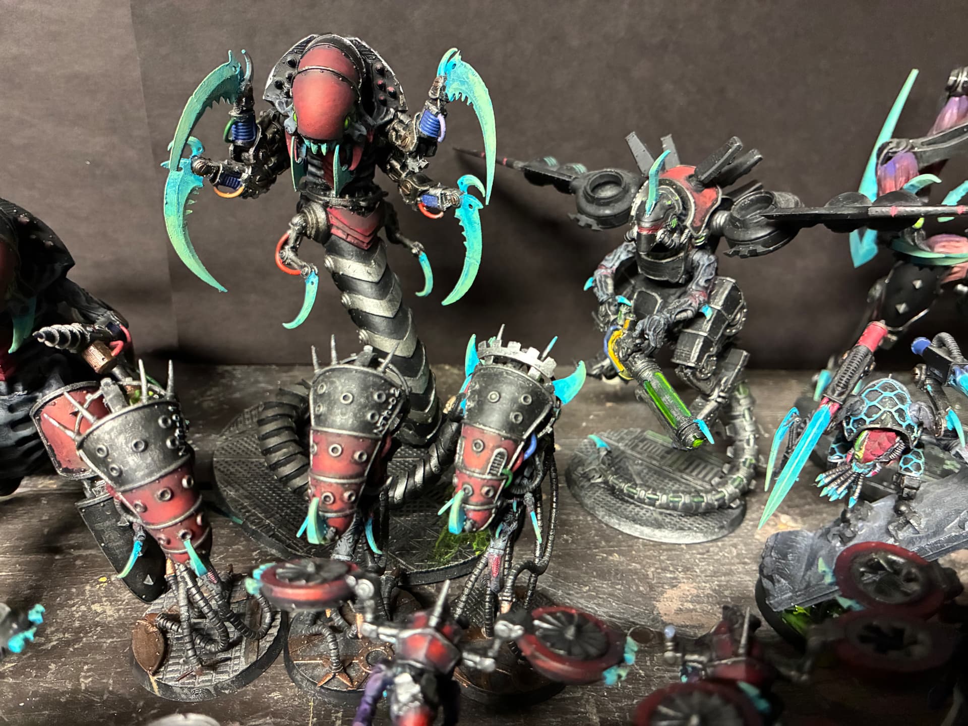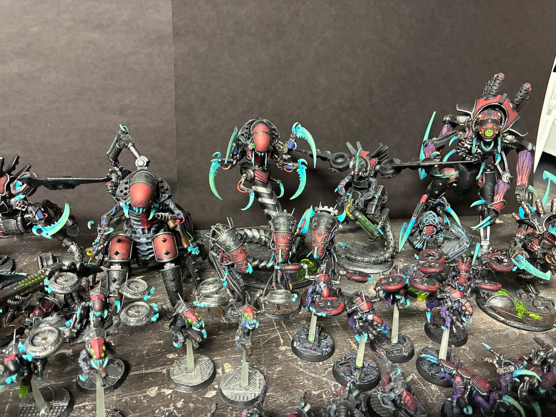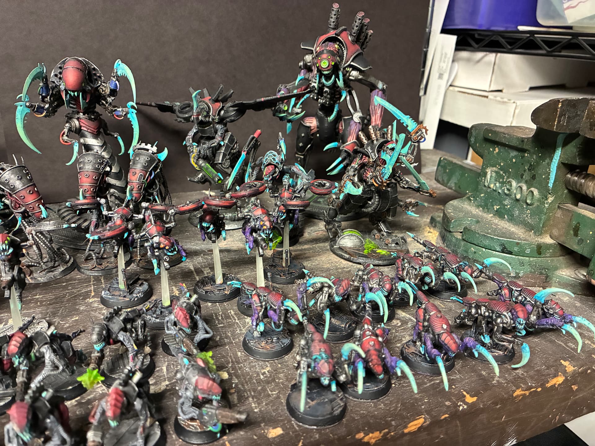 I started collecting a 3D printed Iron Hive army 3rd quarter of last year. These STLs are made by the Makers Cult, and I’ve wanted to build an army since the first time I saw these mechanically reanimated zombie nids. I acquired approximately 45 small infantry models (mostly hormagaunt aand gargoyle equivalent models) on eBay, 15 of which I painted in full Nov-Def 2025. Late Dec, I found another lot that was largely painted in primarily black and gunmetal with some detail work. The project was to do a partial re-paint to bring them in line with the models Inhad already painted. Jan to early Feb, I worked through all of this second set. 56 models reworked added the blue green teeth, claws and spikes, red armor plates, and some other specific details. Been a fun project and I am quite happy with the fast work, and the resulting look: