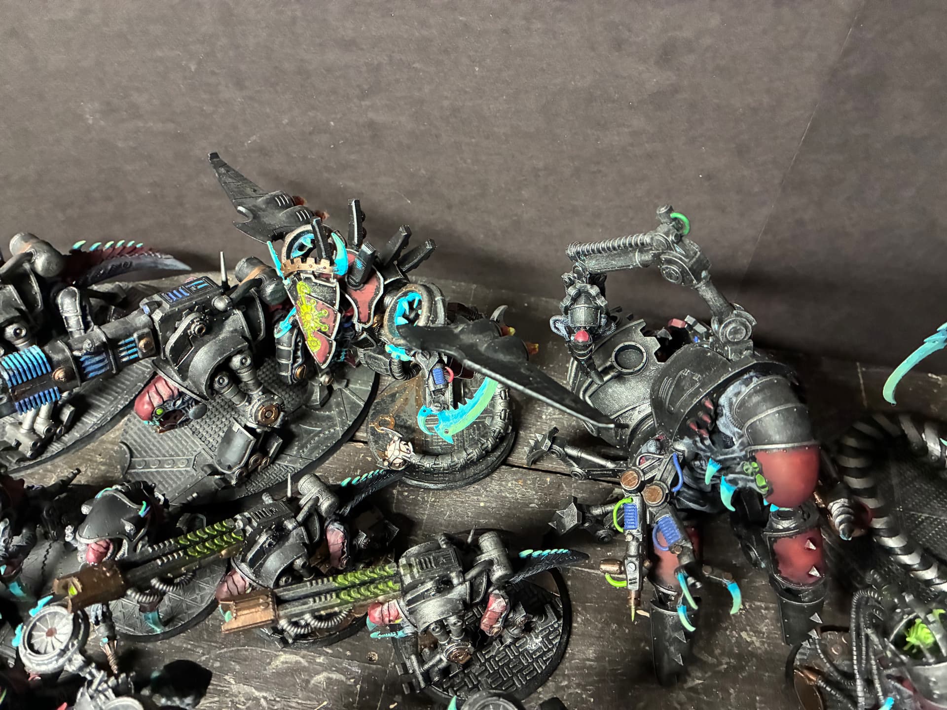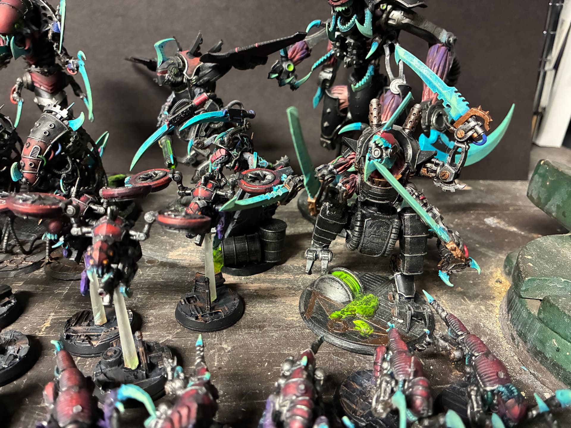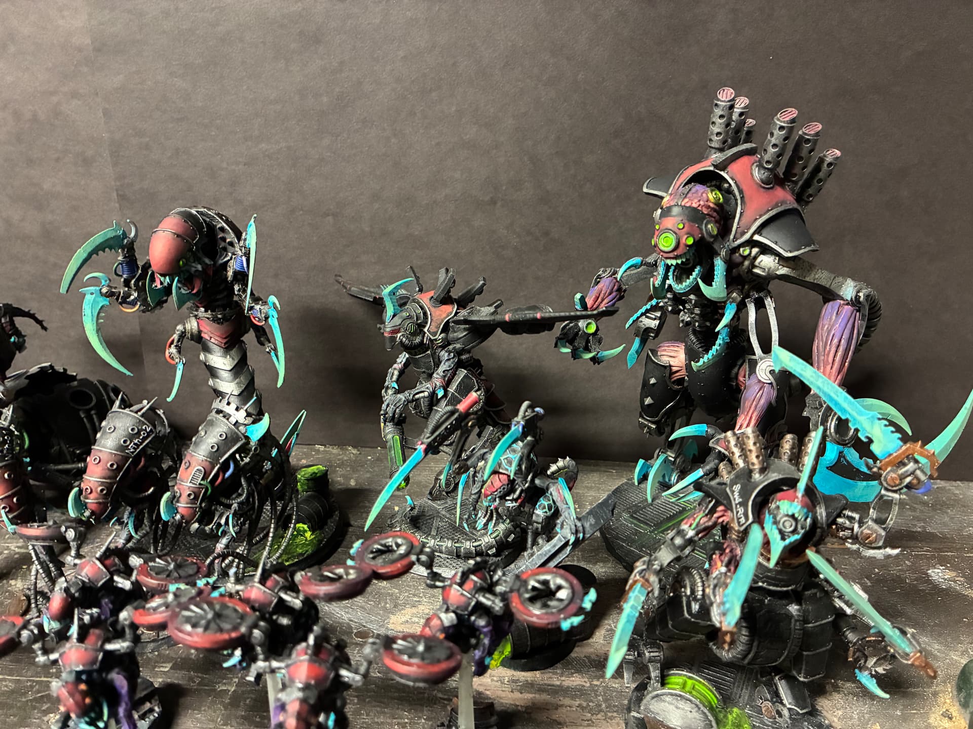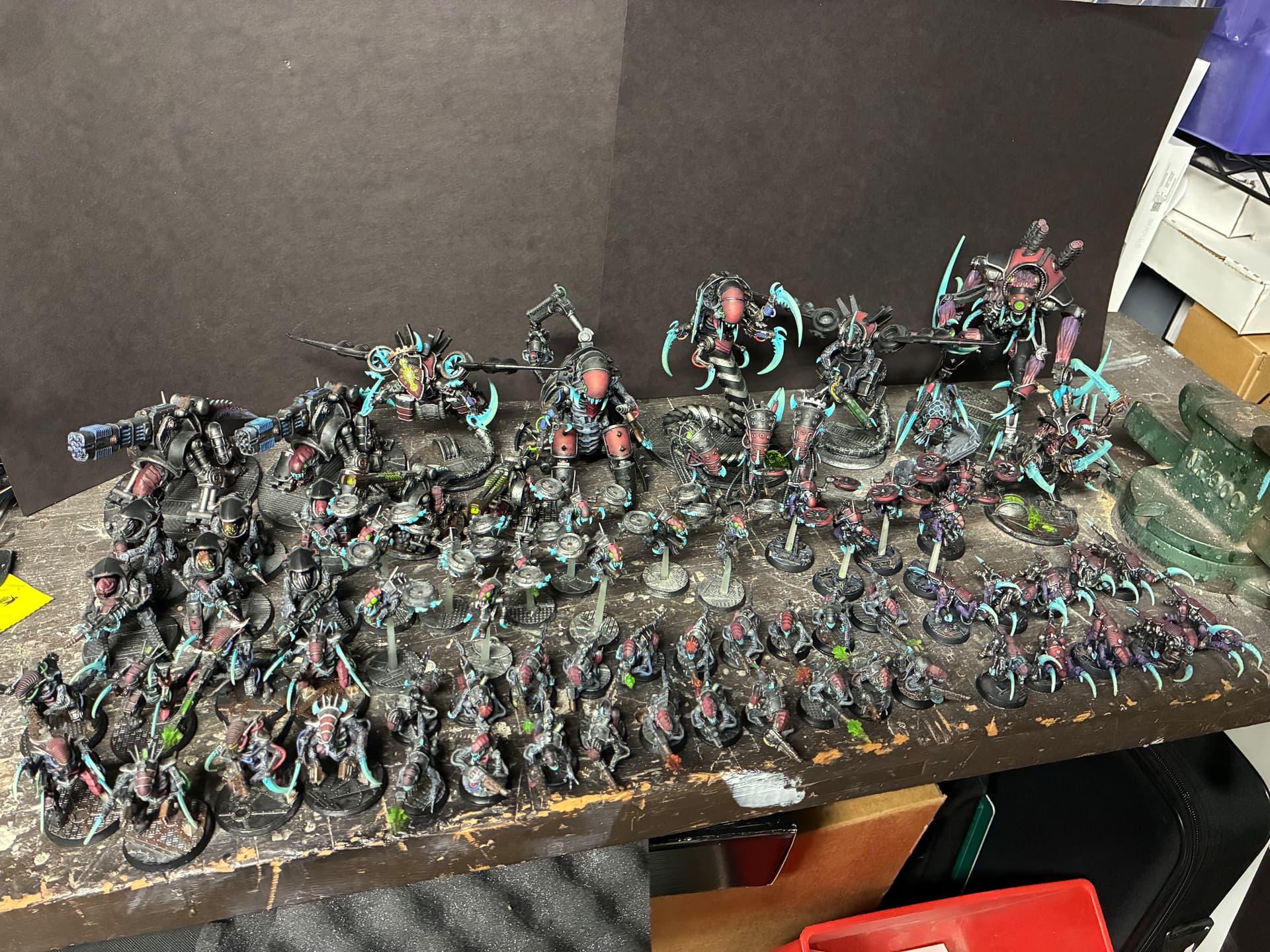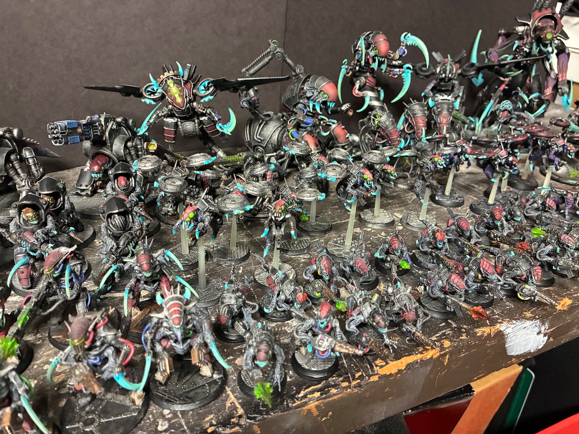 I started collecting a 3D printed Iron Hive army 3rd quarter of last year. These STLs are made by the Makers Cult, and I’ve wanted to build an army since the first time I saw these mechanically reanimated zombie nids. I acquired approximately 45 small infantry models (mostly hormagaunt aand gargoyle equivalent models) on eBay, 15 of which I painted in full Nov-Def 2025. Late Dec, I found another lot that was largely painted in primarily black and gunmetal with some detail work. The project was to do a partial re-paint to bring them in line with the models Inhad already painted. Jan to early Feb, I worked through all of this second set. 56 models reworked added the blue green teeth, claws and spikes, red armor plates, and some other specific details. Been a fun project and I am quite happy with the fast work, and the resulting look: