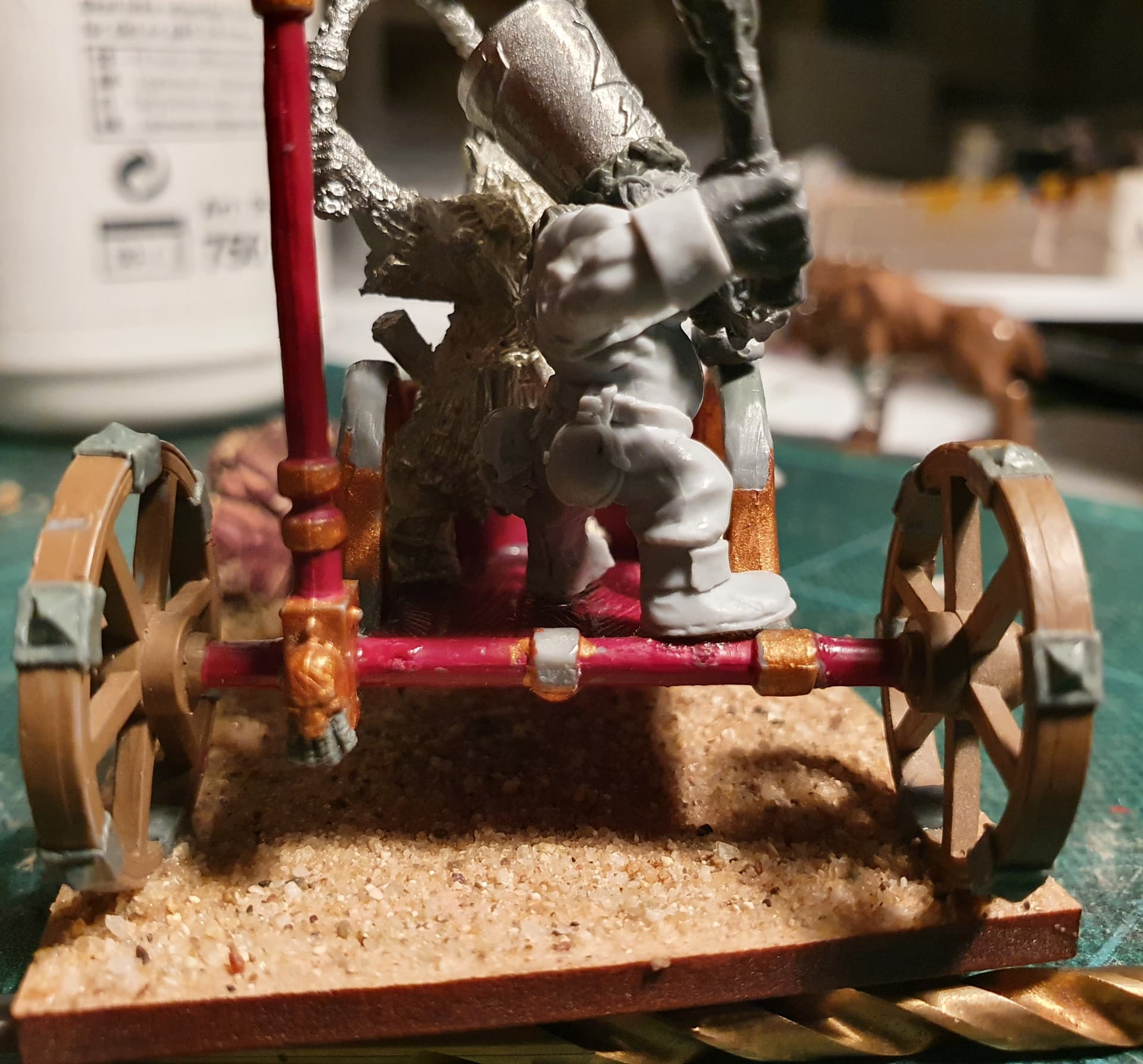 So, I’m calling the Chariot done (except painting). Added some buckles to hold the shakes in place and put on som bark and sand: