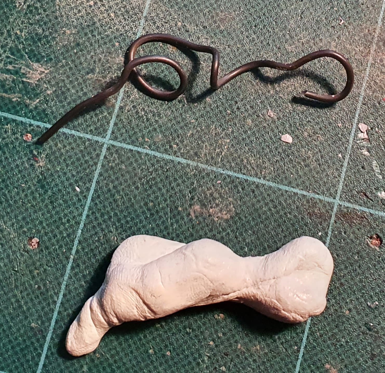 I started by making a mock up from blue (white) tac and made an armature to generally fit its shape: