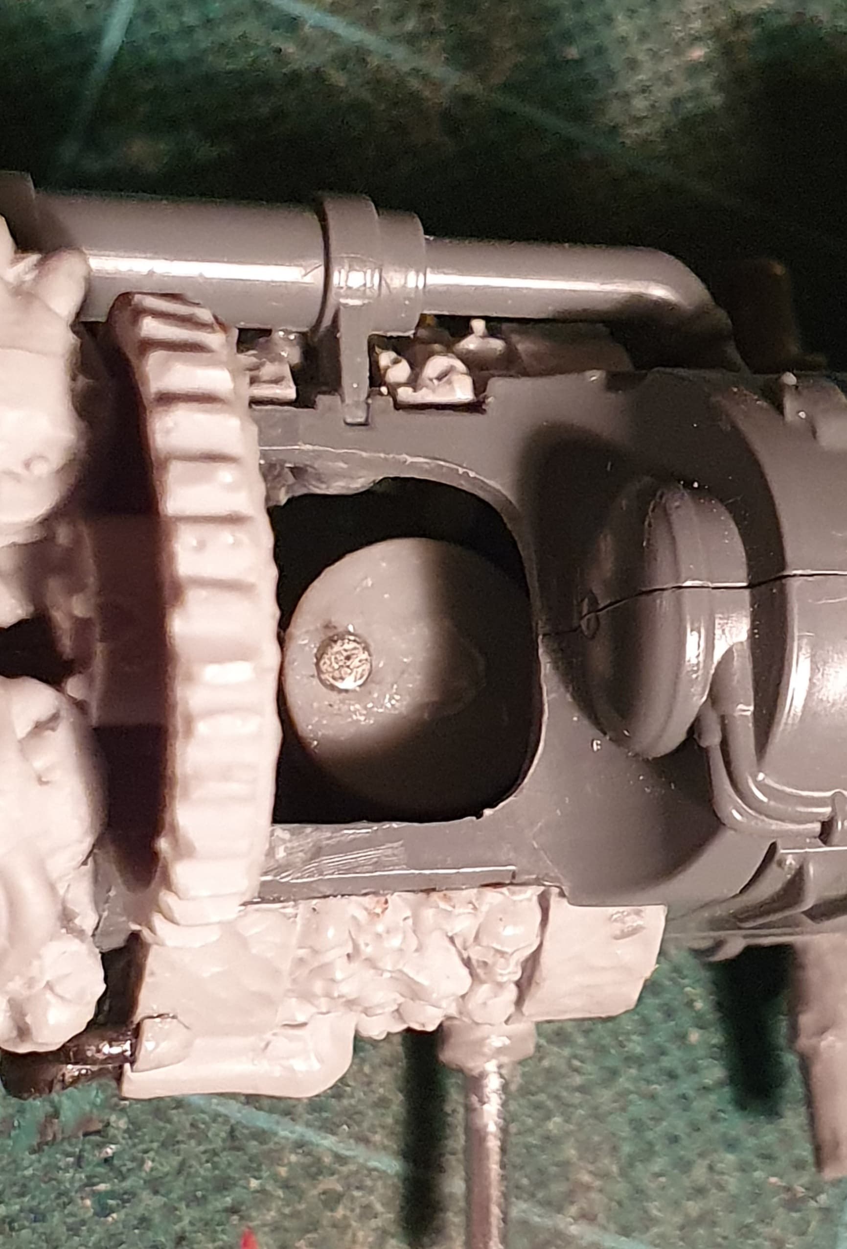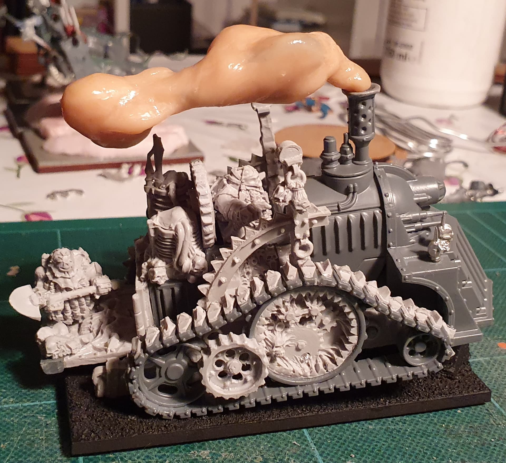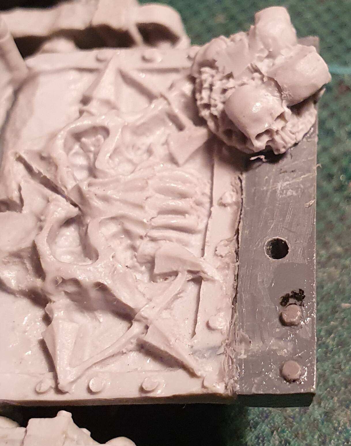 I added some connecting pipes using wire and went to work with Grey Stuff to fix some gaps and resculpt some of the anguished faces. I also added some distances/axels for the Hellcannon sides: