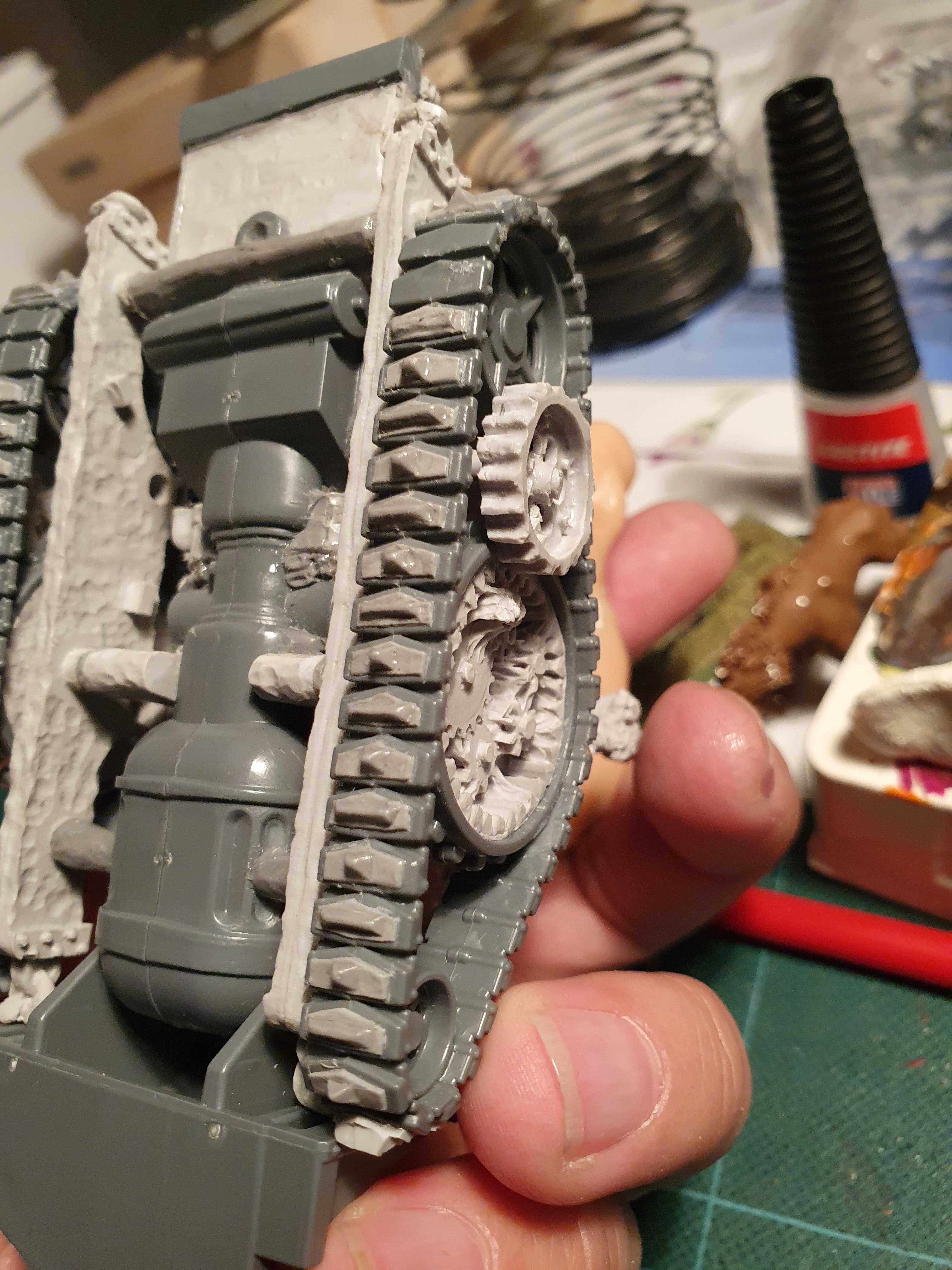 I had kept the track parts of the Hellcannon wheels and decided to add them to the tractor tracks, mostly because I felt a responsibility to use as much of the original model as possible. The result would probably have been faster (and possibly better) had I sculpted them myself: