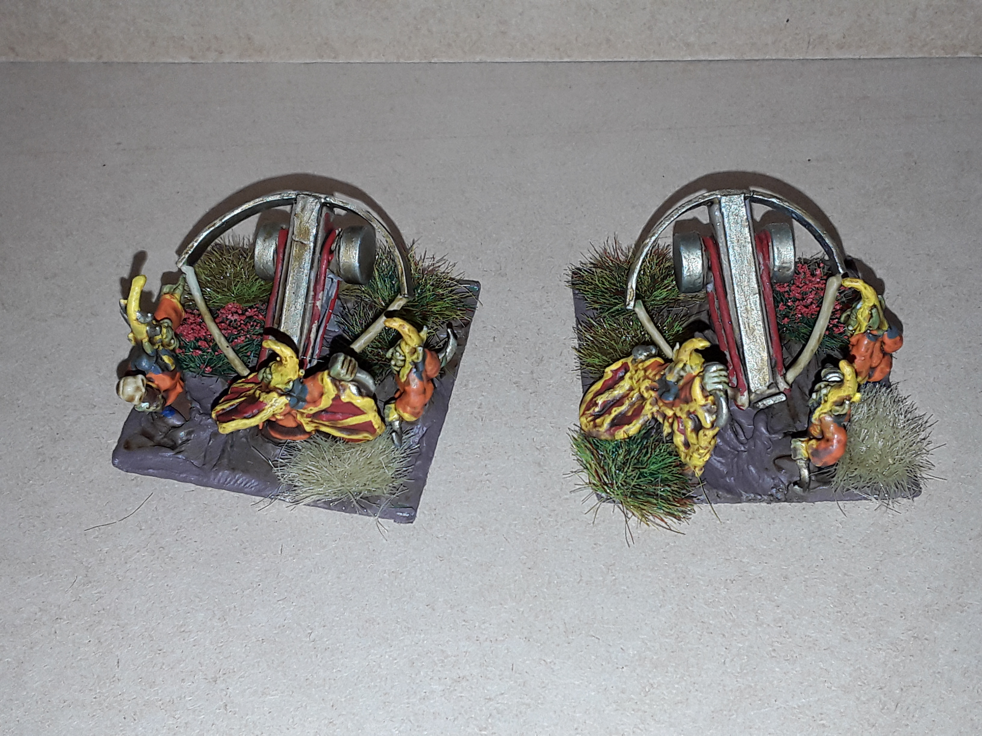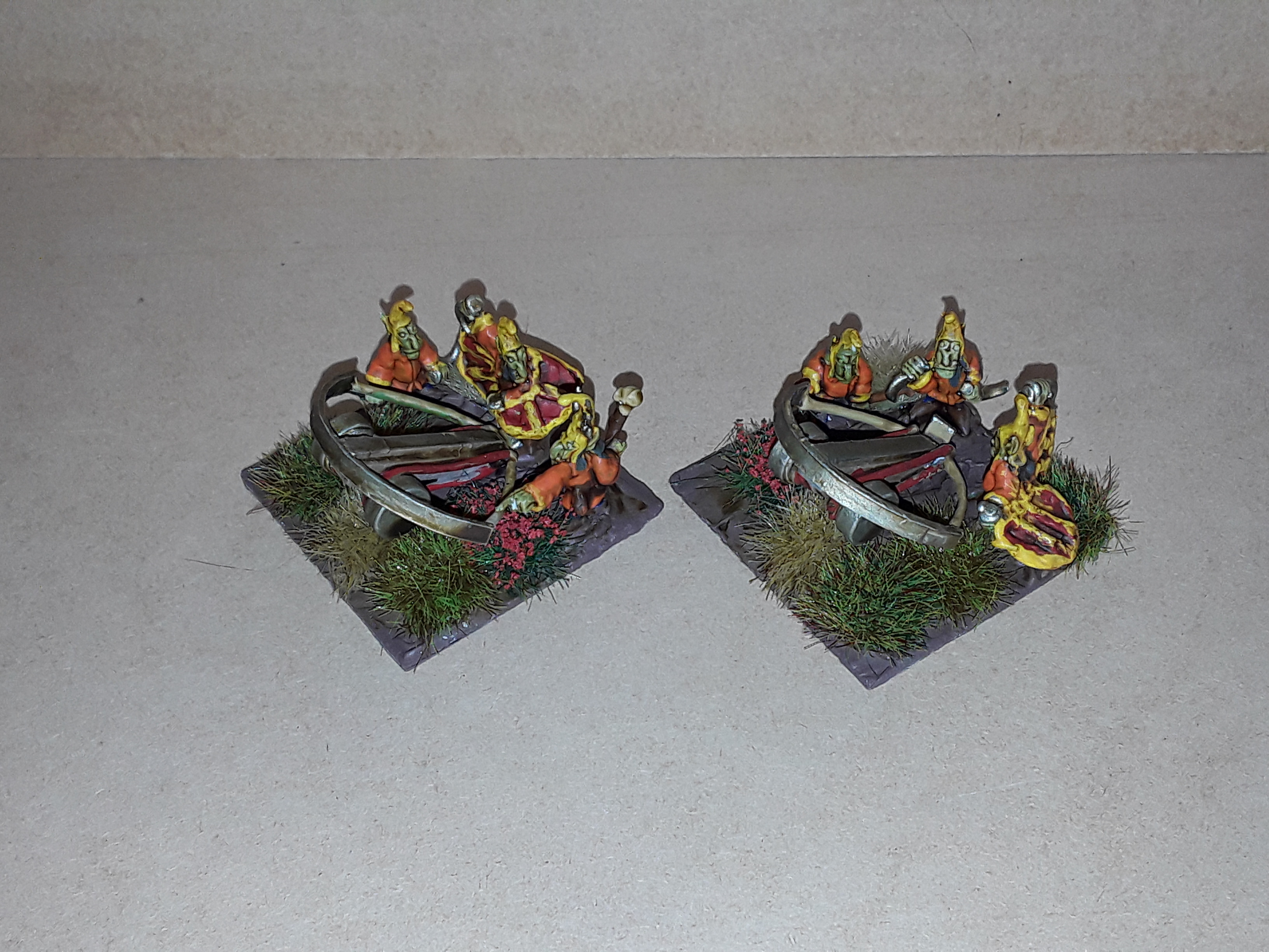 I have finished the Doom Diver catapults. The two of them have a Tjubgob preparing to get onto the device in order to be propelled into the sky and rain doom on some unsuspecting foe, or himself! I would like to get another character set at some point in order to make another flying Tjubgob.