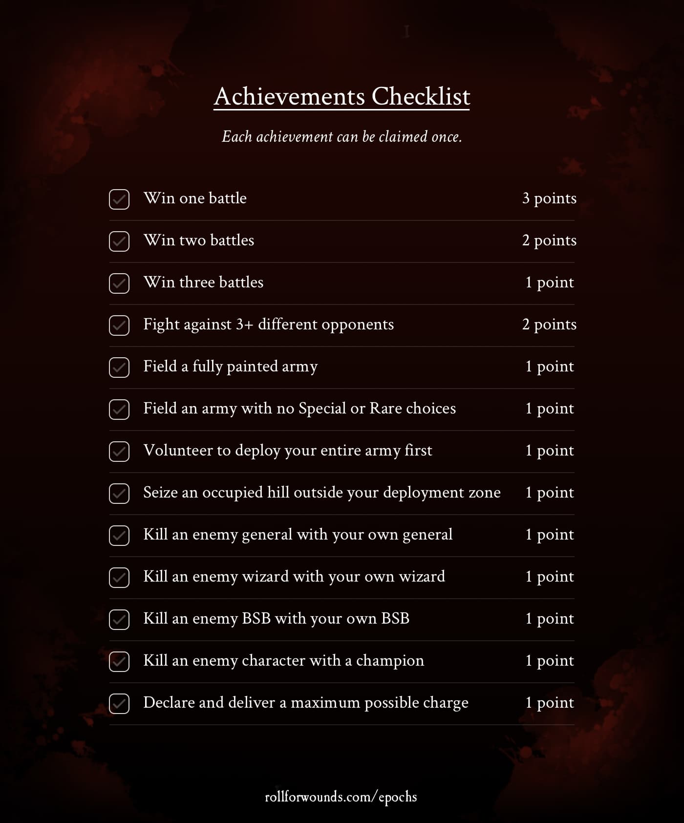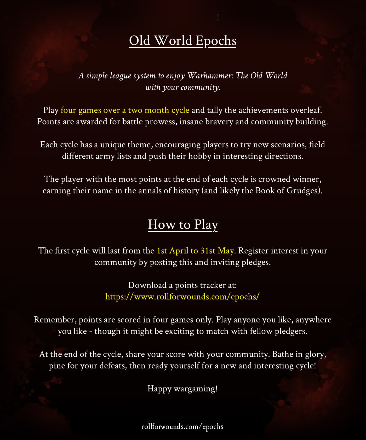In a nutshell: play 4 games over a 2 month period with anyone. Track what you do in those games and tally with the scoresheet below. Every 2 month cycle will have a different flavour commensurate with ToW fluff and the seasons: new scenarios, trying out allies, snow battles in winter etc