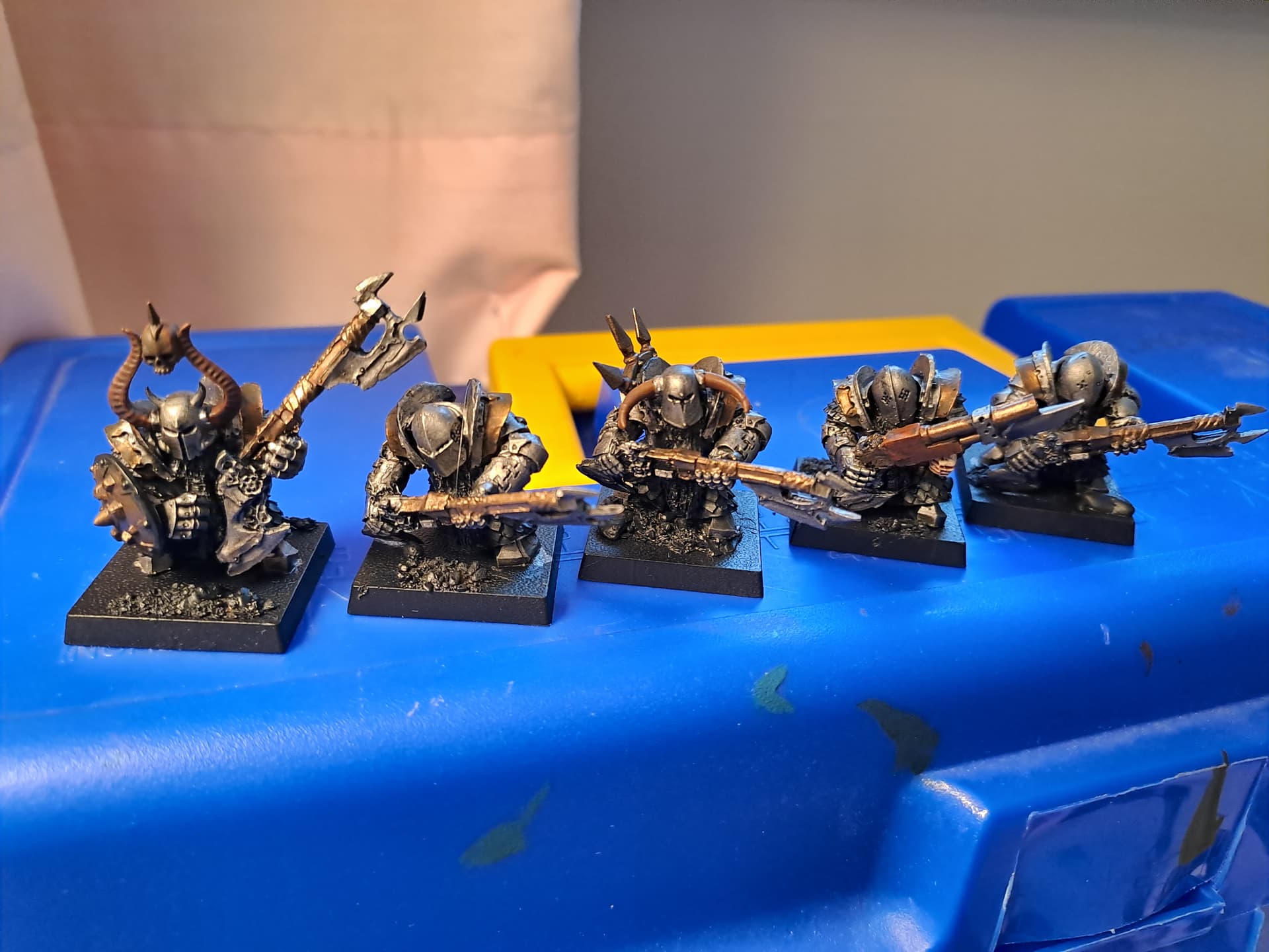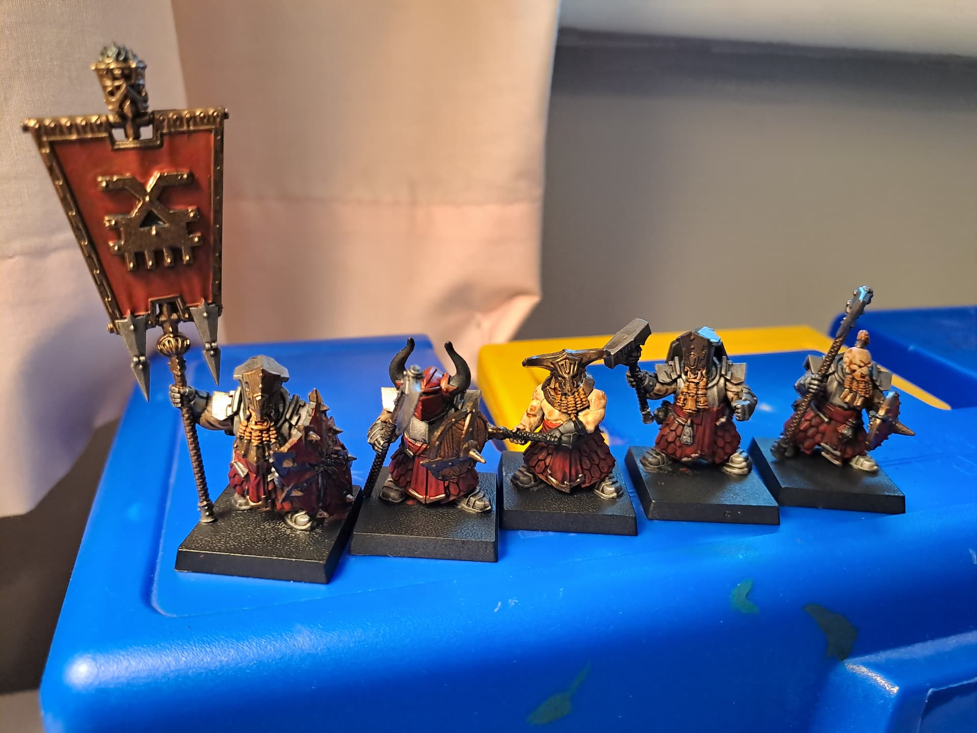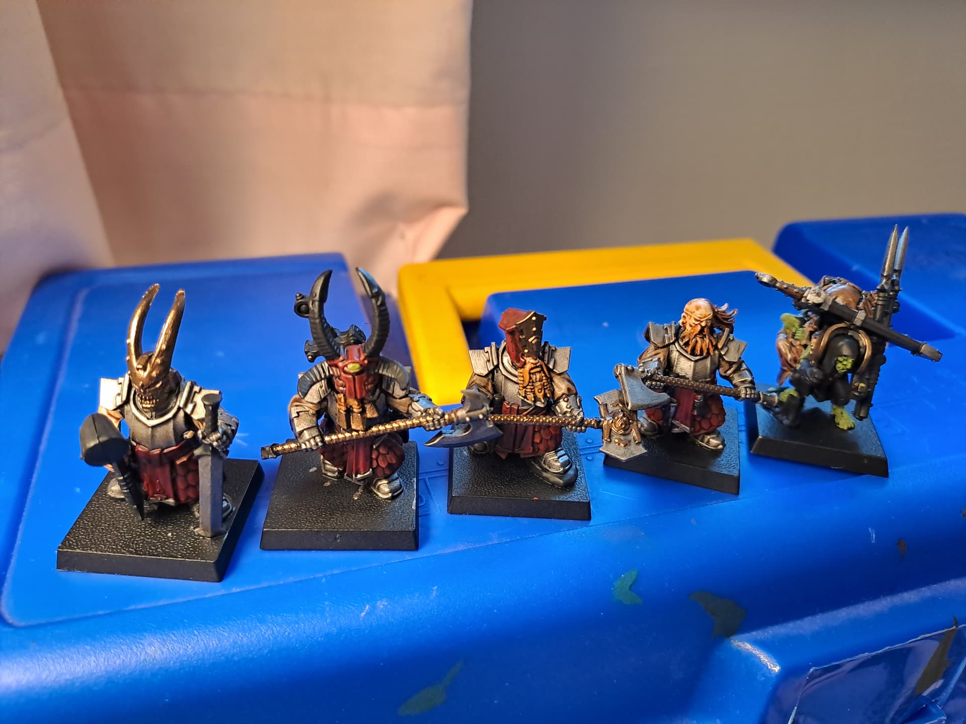 Progress on unit 3. I really wanted there to be a Khornate inspired old stool feel. Fluff wise my general is an outcast up in the North seeking redemption and has ‘true’ Chaos Dwarf allies / mercenaries from the wastes.