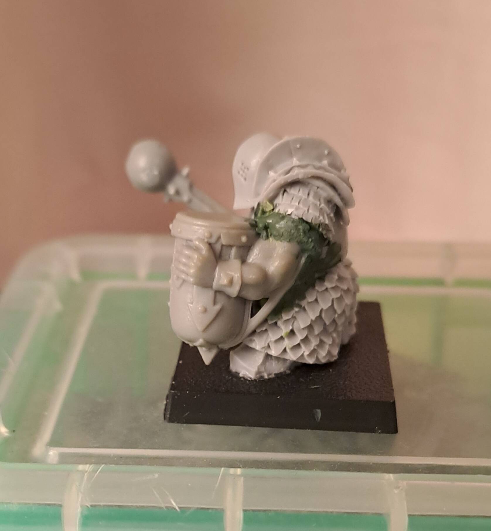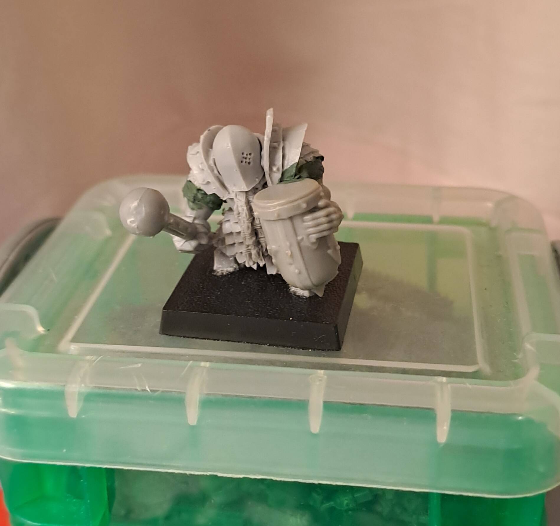 Musician done. Just need to tidy up the greenstuff. Used an old Marauder drum and what I think is a really old chaos warrior arm with mace, spikes cut off.