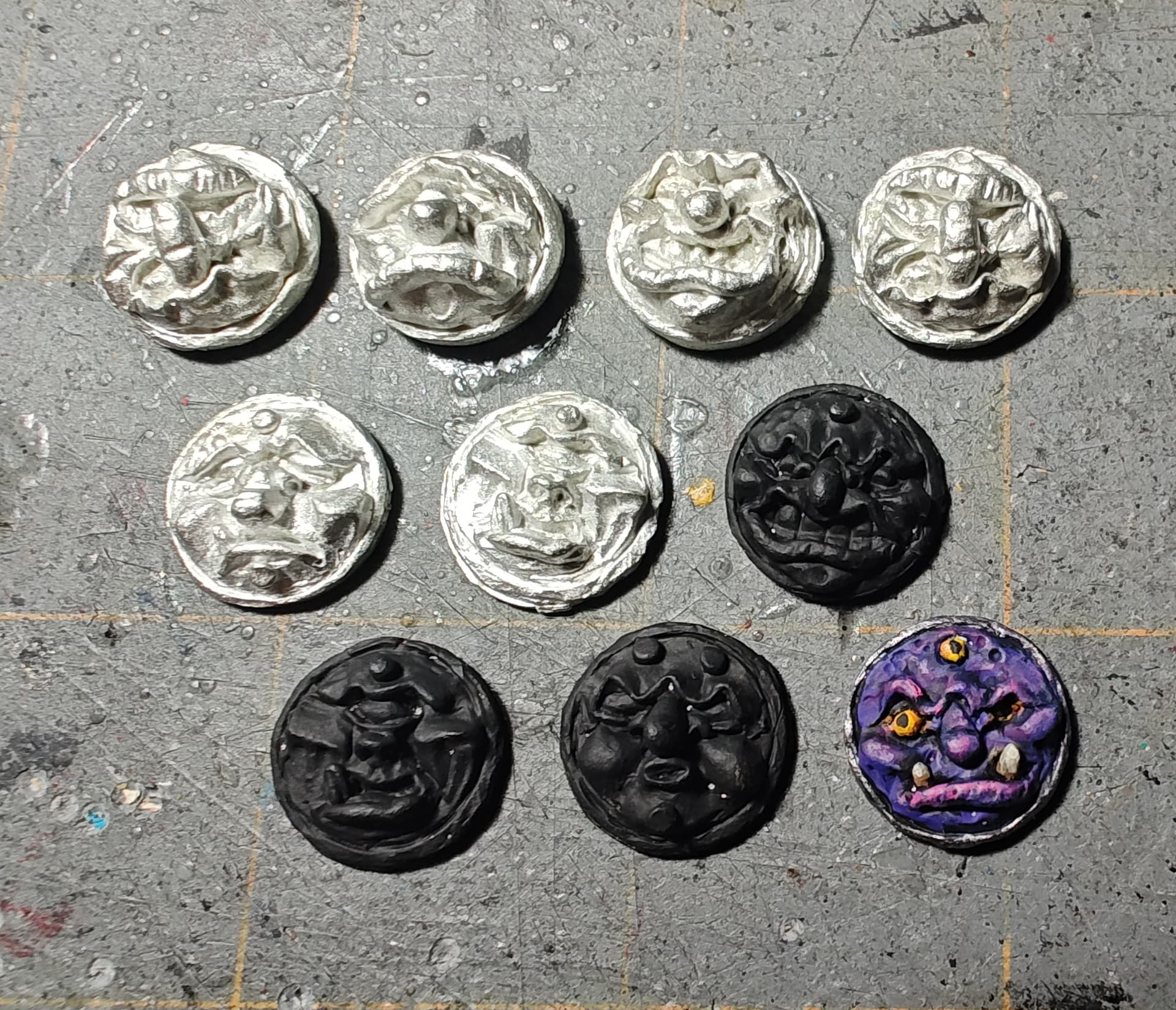 Armor was added including the shoulder pad front the other hill giant, and a plethora of shields from all over the place, I can probably ID most of them if anyone is curious. The chains are from the hell cannon, the instrument keys are paper-clip wire and round bits from a thin metal sheet for detailing mechs, and the bolts are model train bits. The axe head comes from that Titan Forge infernal golem. Torches are from click pen workings, and the flames are random curvy pieces from bones models.