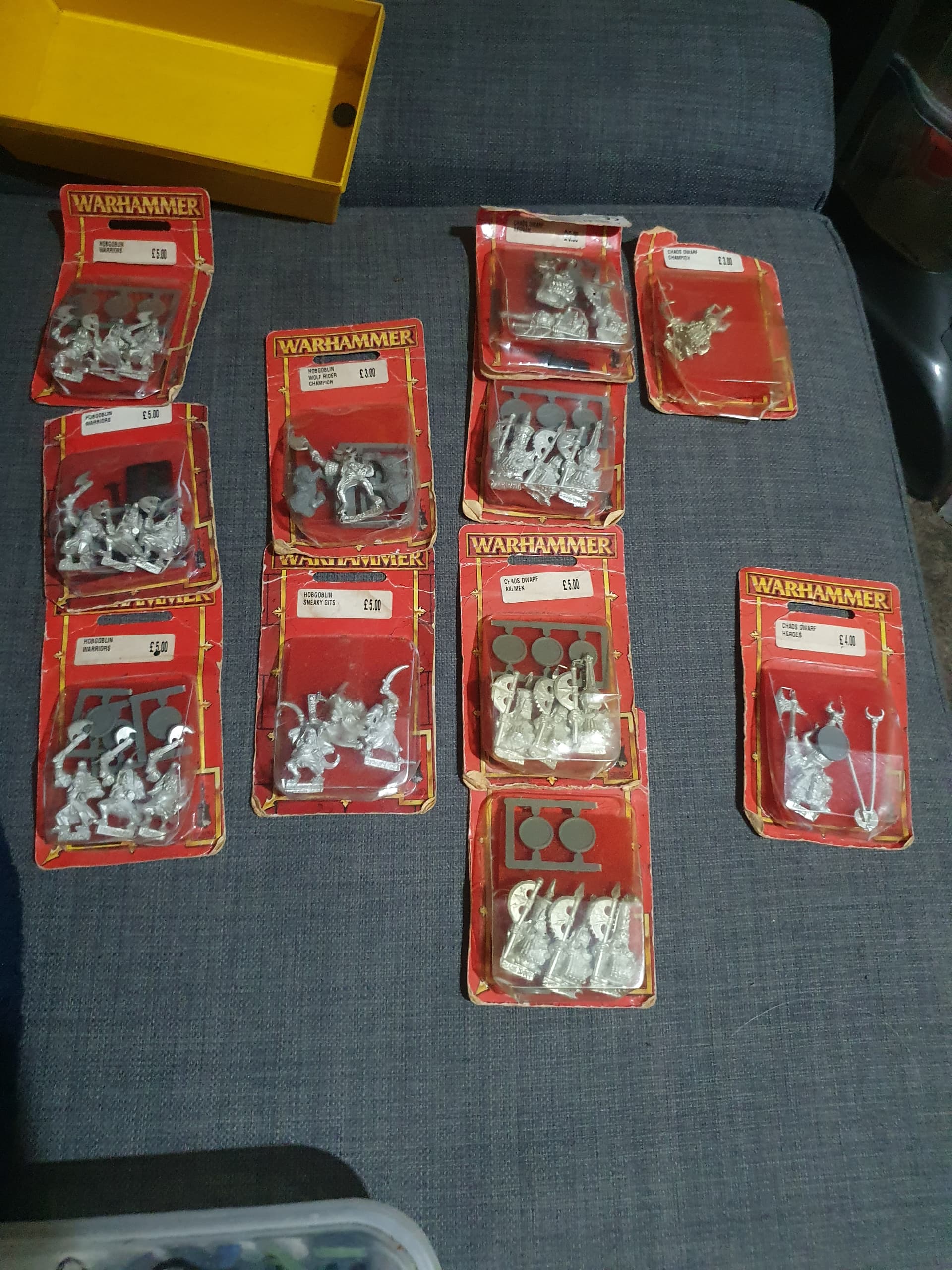 Ive a load of chaos dwarves and hobgobins I’m not really sure what the value of it is from 20+ years ago. Half still in blister packs. Wondering if anyone would be kind enough to help me value them as I’d like to sell them. I beli e i have in blister packs chaos dwarf: hero, champion, 4 packs of axemen, 3 packs of hobgoblins warriors, hob wolf rider champion and a pack of sneaky gits. Then loose i have 18 plastic axemen, 4 sneaky gits, hobgob comander, boss, wolf rider champ, wolf rider cheifden, and standard bearer. Hobgob muscian from command group, choas dwarf lord for turas but missing bulls body head, but got its wings and lord. Earth shaker cannon crew, top of rocket launcher and crank wheel, half the body of a wolf rider, parts of hobgob bolt thrower. Back standard for the magican, and chaos dwarf commander standard bearer and drummer.