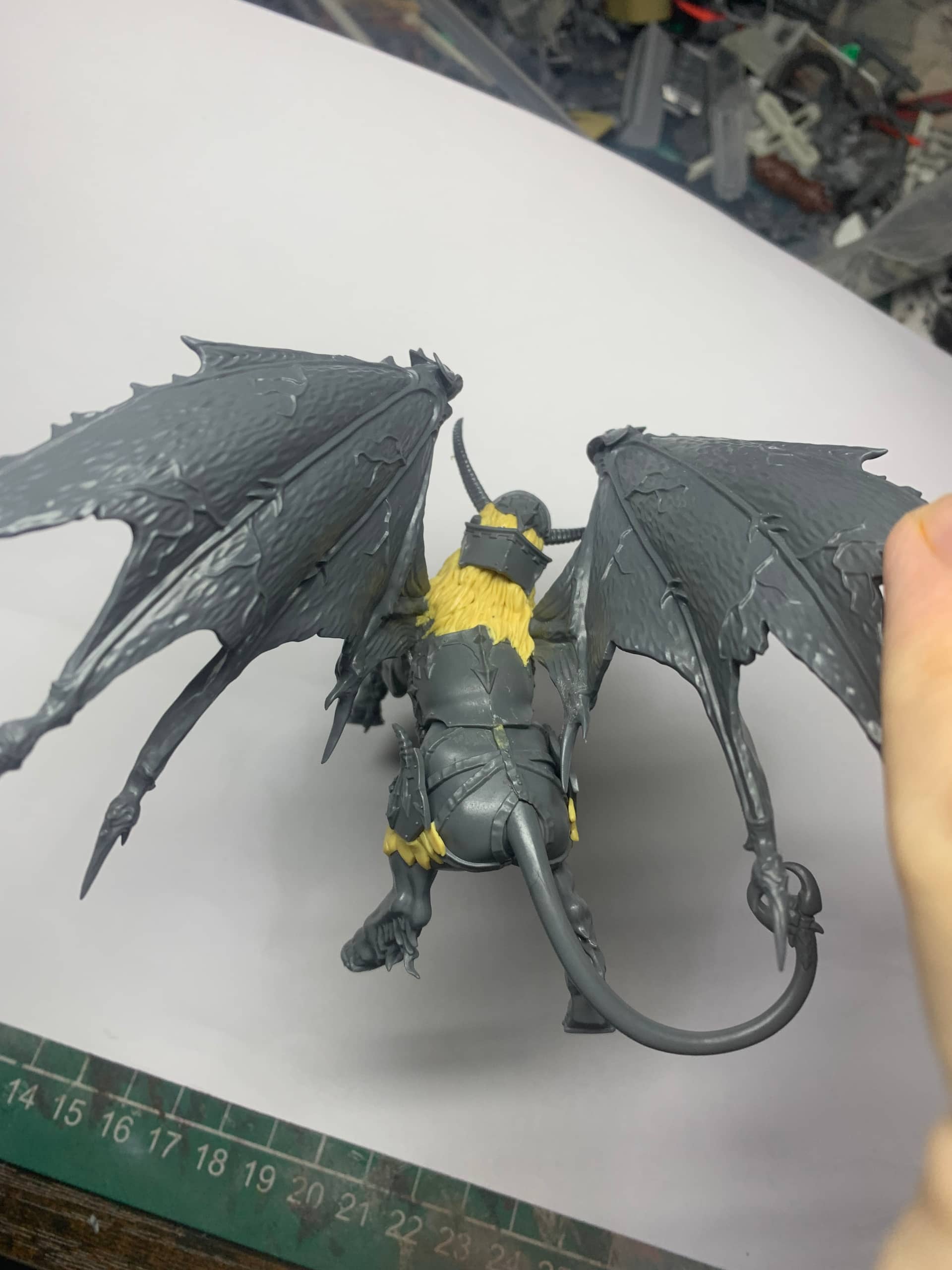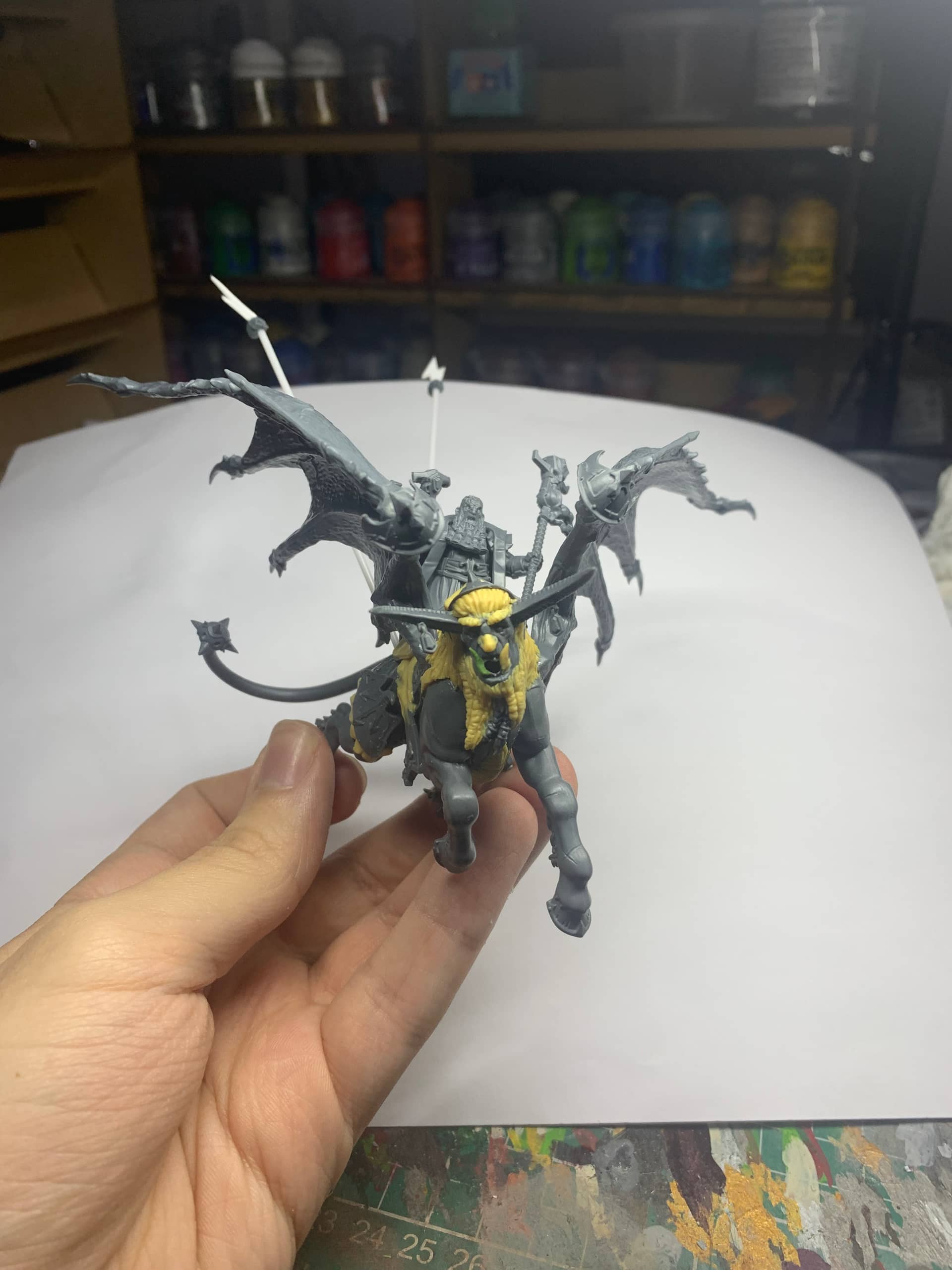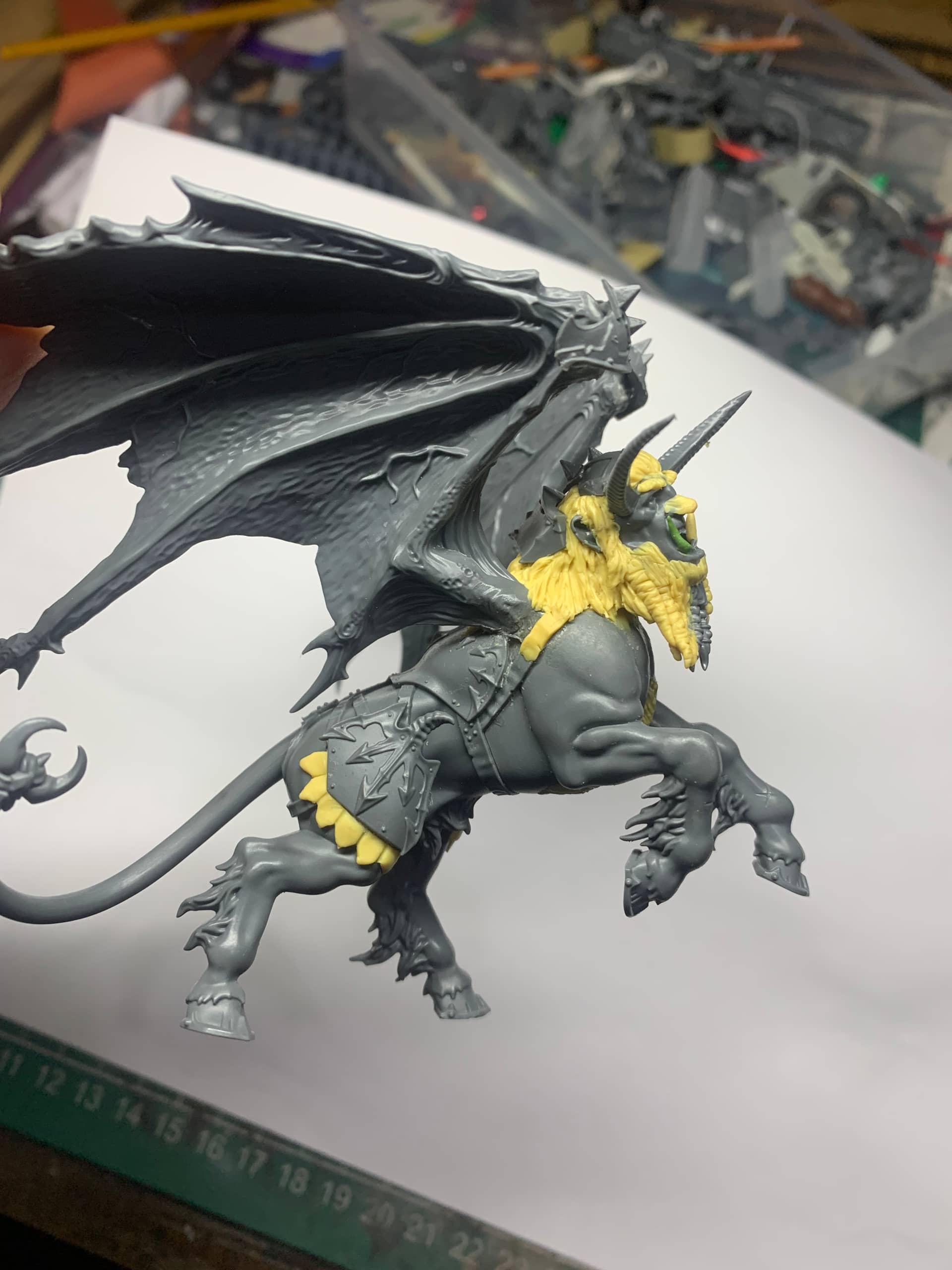 He is currently still sitting on my shelf half-done. I mean to sculpt a mane for him and a proper saddle for the rider, then I can paint. I have kept putting this off though… I also need to paint figure out a blue paint scheme for his skin.