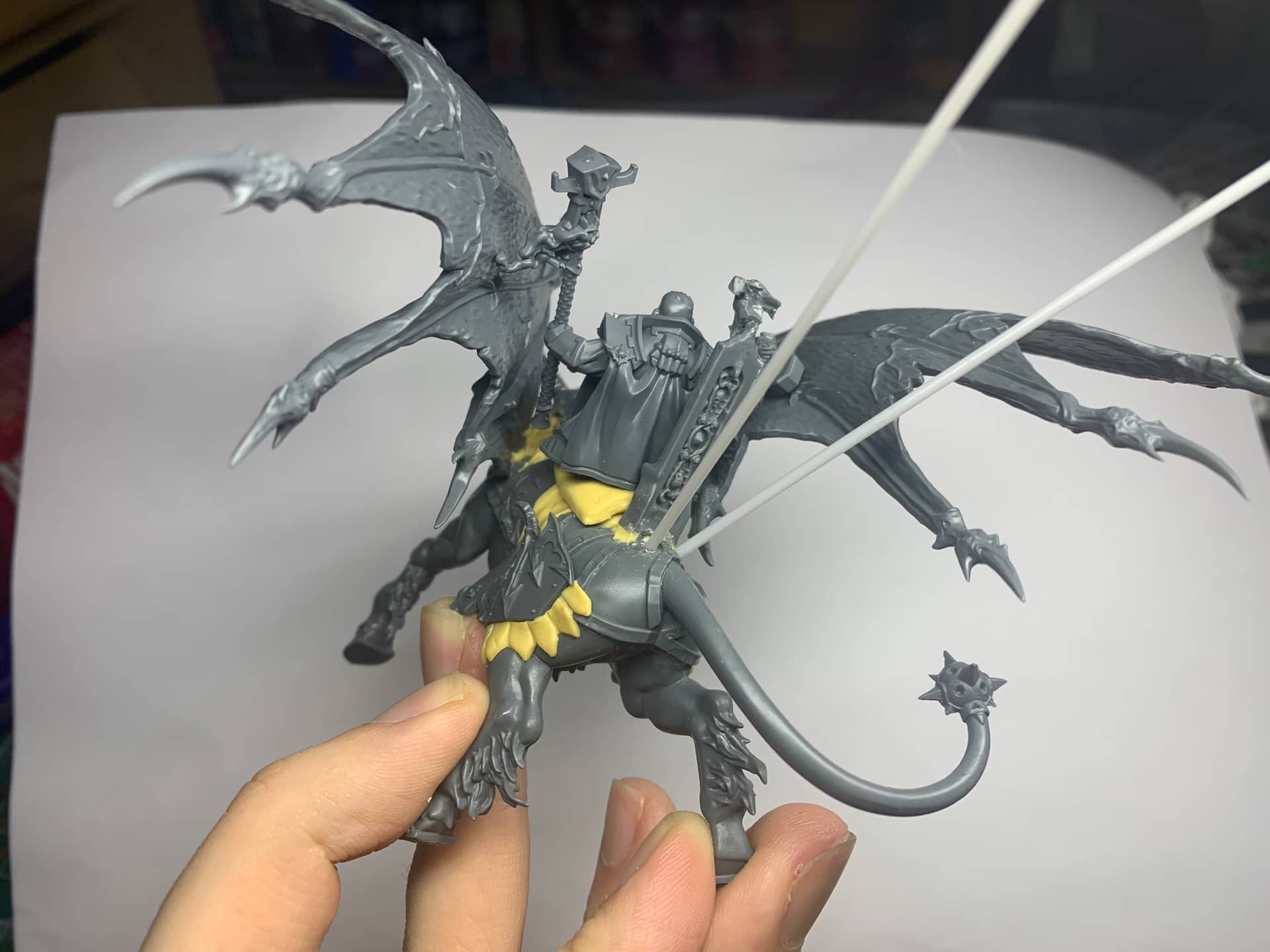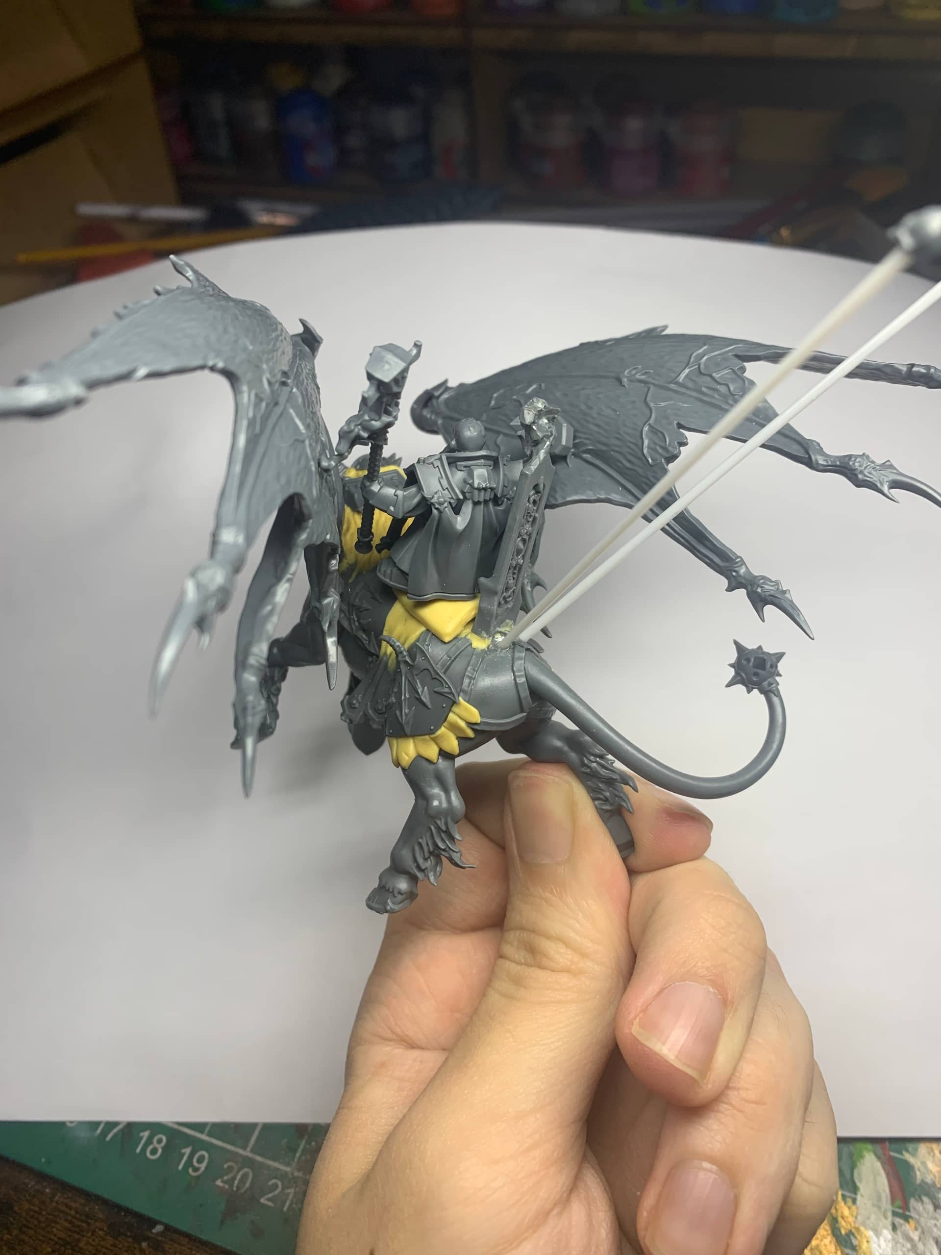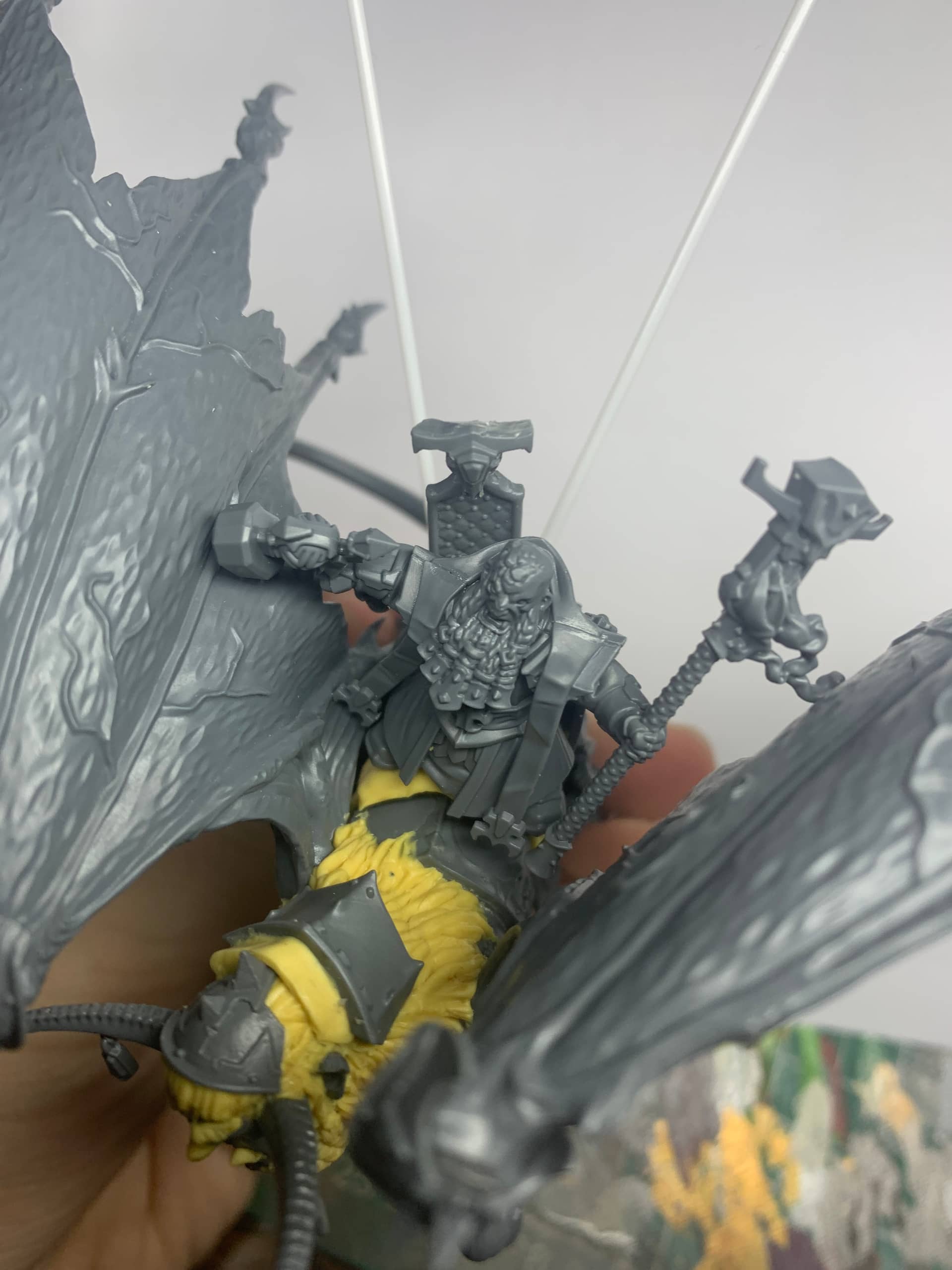 I’m very happy with the final result. The rider is fairly tight and a bit awkward so if I were to do it all over again I’d have the wings hang lower. Originally I was going to have him rearing but I think I will now have him on a stick to be mid-flight. Since the last post I’ve added some fabric on his back plus a riders pillow. A mace tail from the skaven plague monks kit, some gems on his horns, and minor adjustments. I’ve also added the flag poles and toppers nodding to the old model.