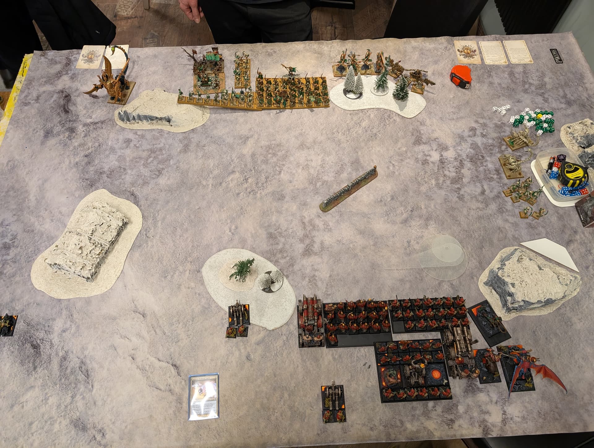 As you can see, I was facing a very defensive list, probably made to deny VPs while capturing objectives using mainly small ambushing skeleton units. The objective in this round, however, besides the baggage trains, was to kill scoring units. So 72 points of hobgoblins were now worth 272 VPs. So I made a mistake putting them in front during deployment.