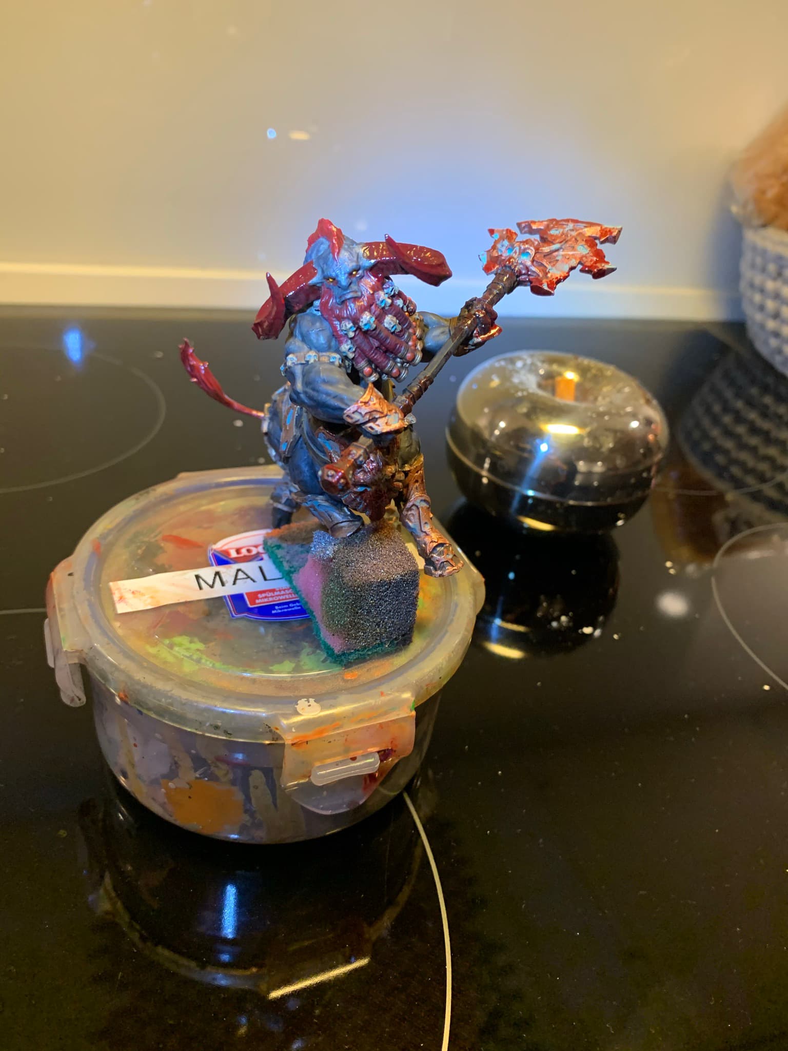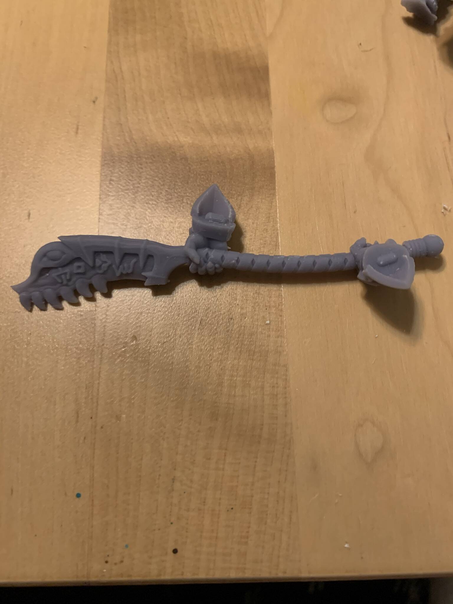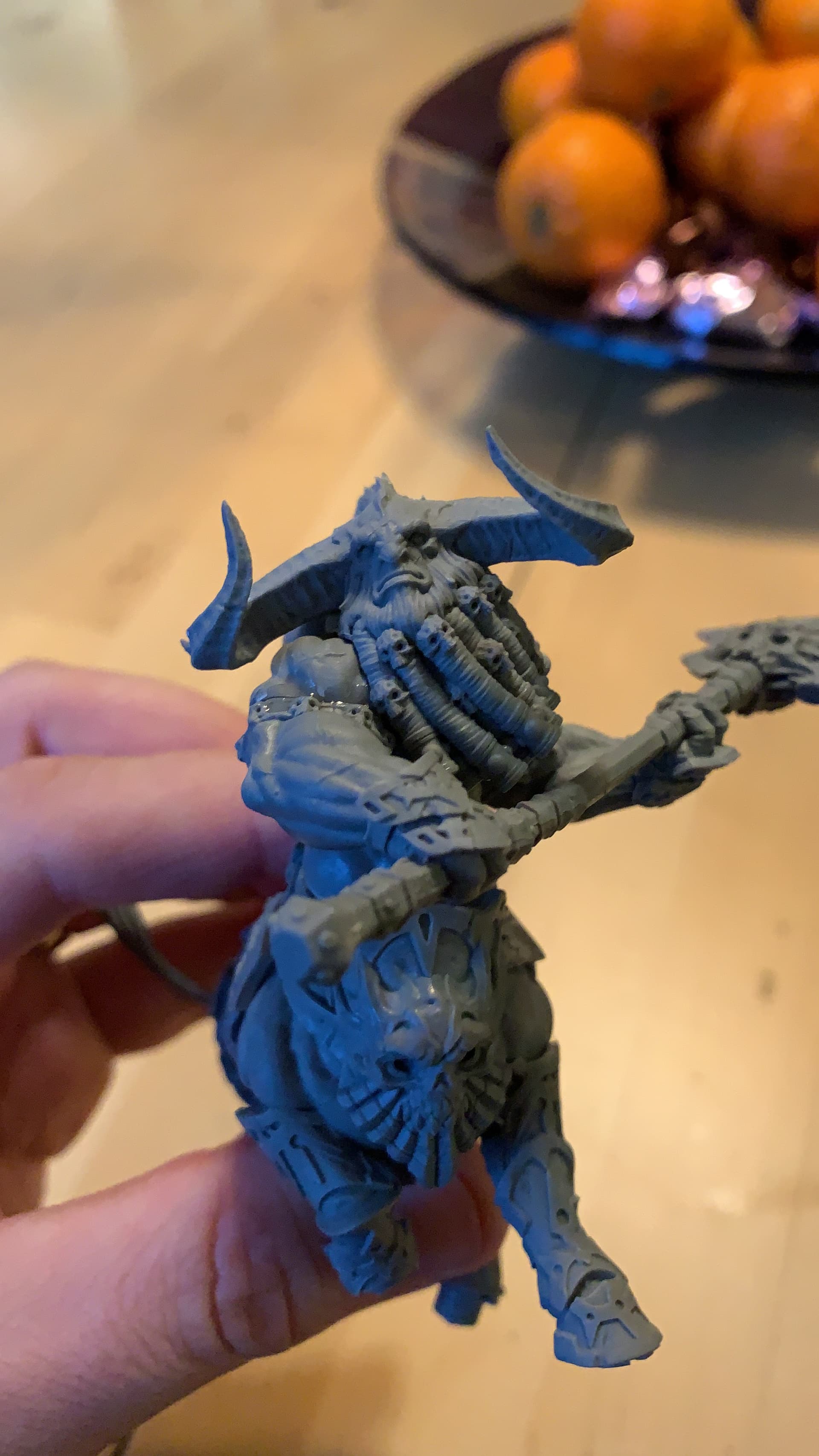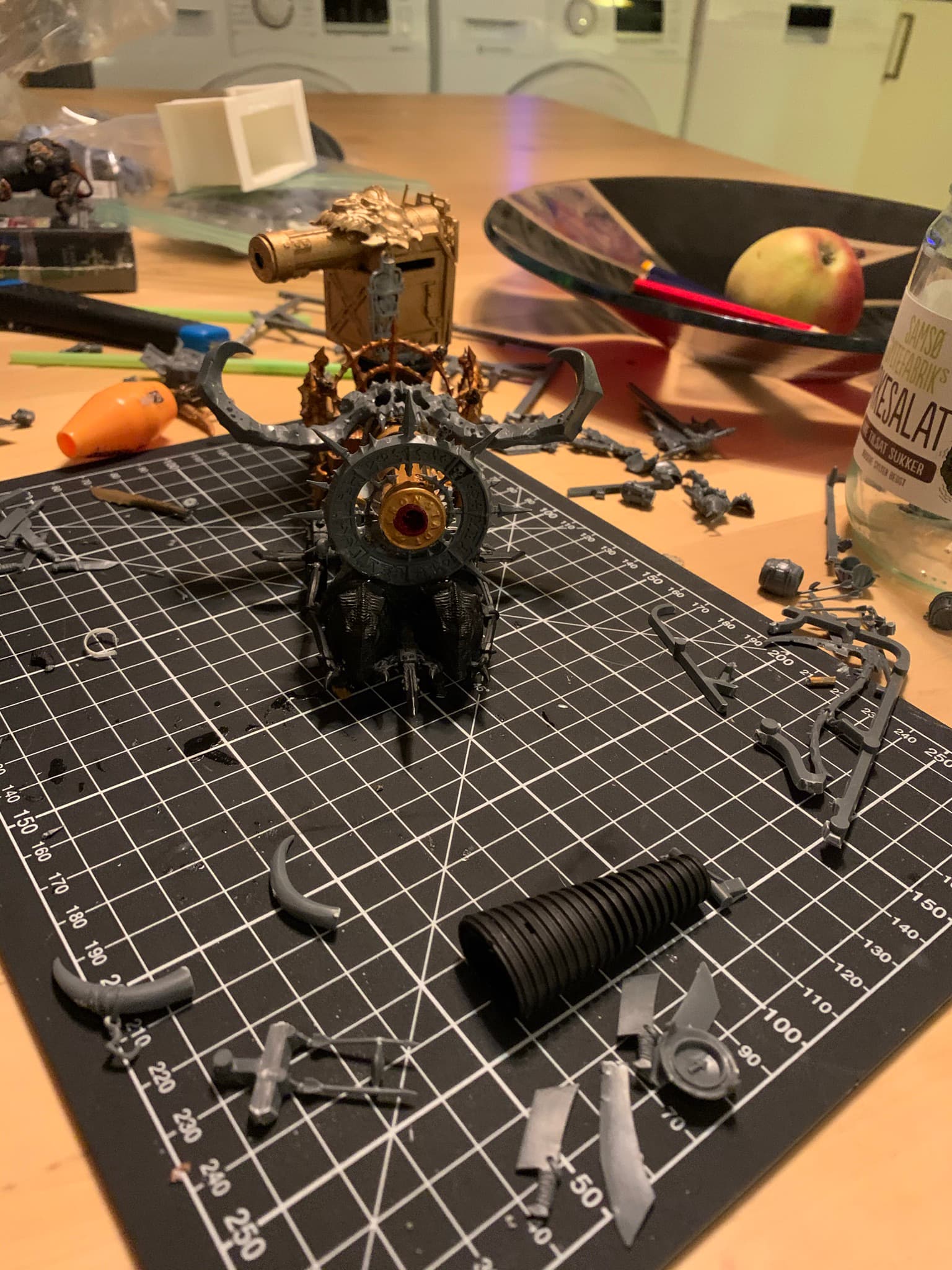 So ive started to coat the train a Lil bit it’s a slow progress cause after i was hit by a car a test SFO ive only just recently been able to get back to The Viby and i Can only sit at The Viby desk for a Good 45 min but enough about that, back ti The train, i Think it will end up looking fine, also i Found This ork “slave” im gona make him a shovel so he Can shovel the heads from the pile info the Canon so it’s shooting slave heads instead of canonballs also ive made a minor conversion a take on a deamon Smith duno if he is an abortion or keeper yet cant deside and then i gluede the 2nd out of 3 Bull-thaurs together