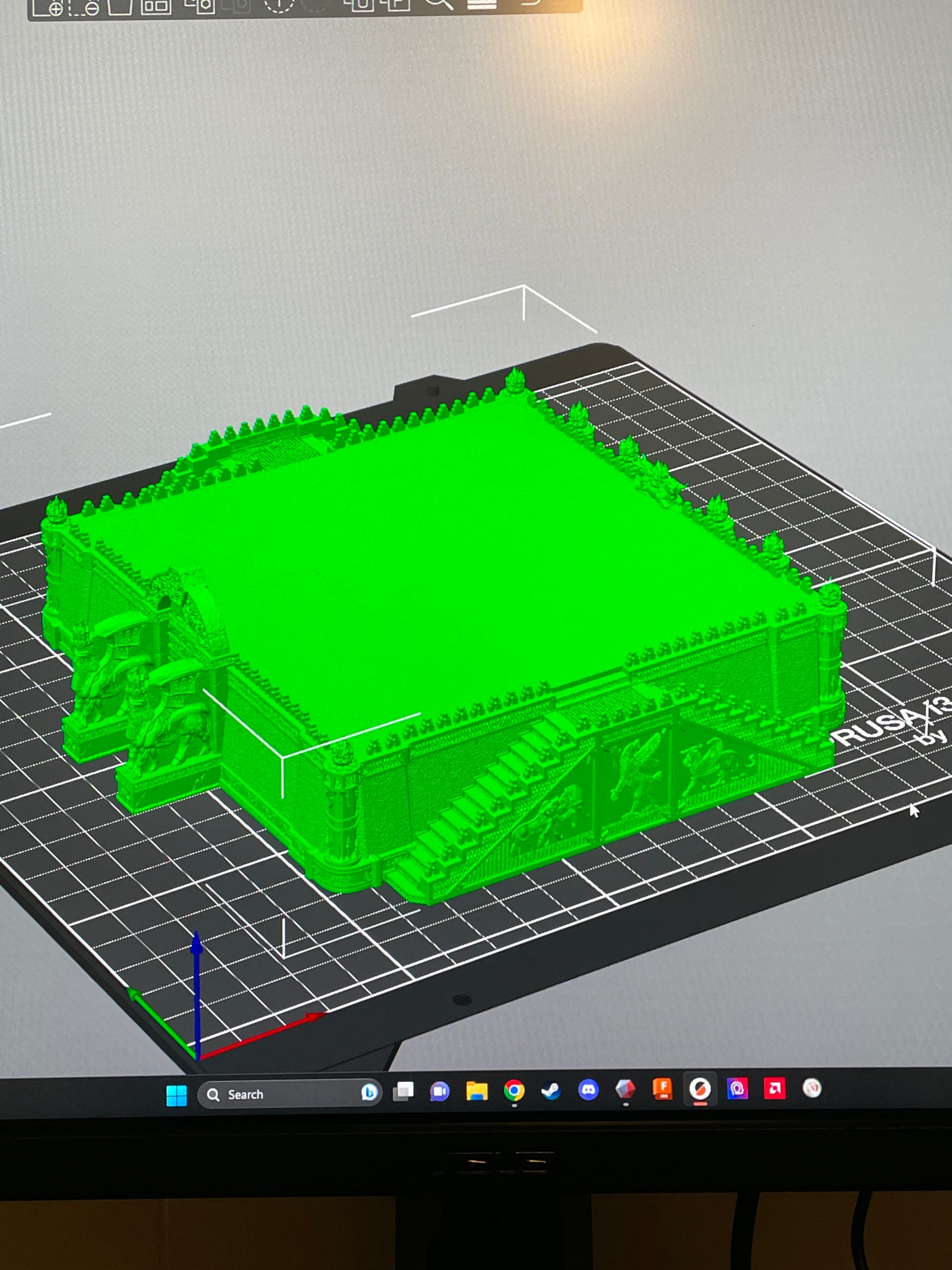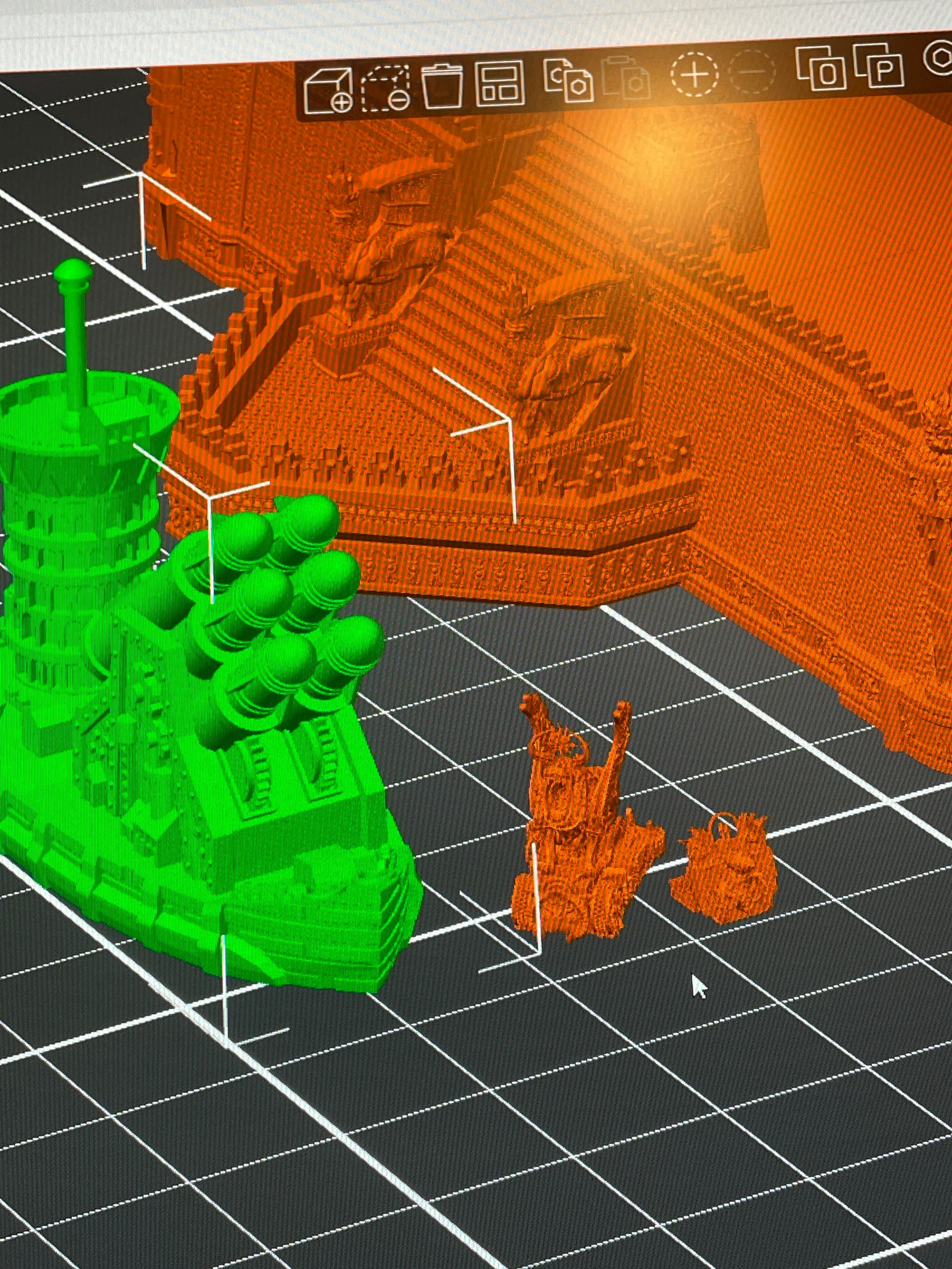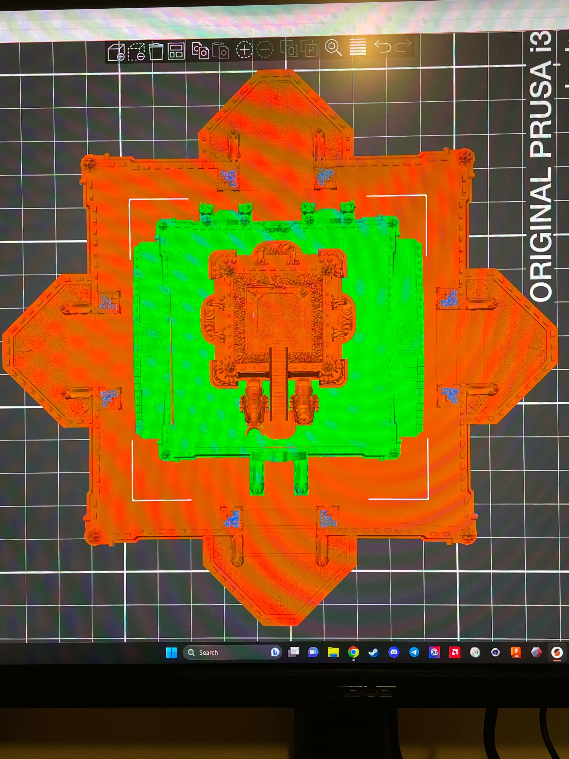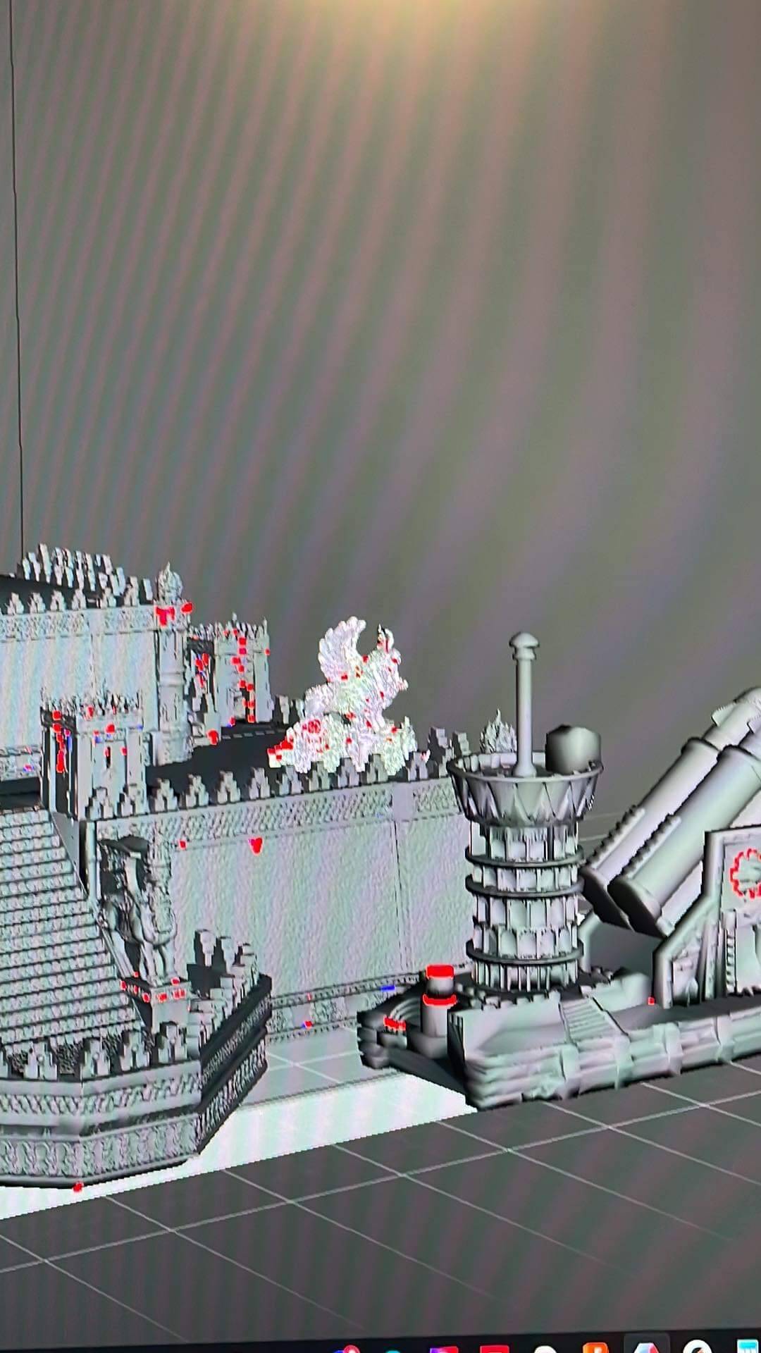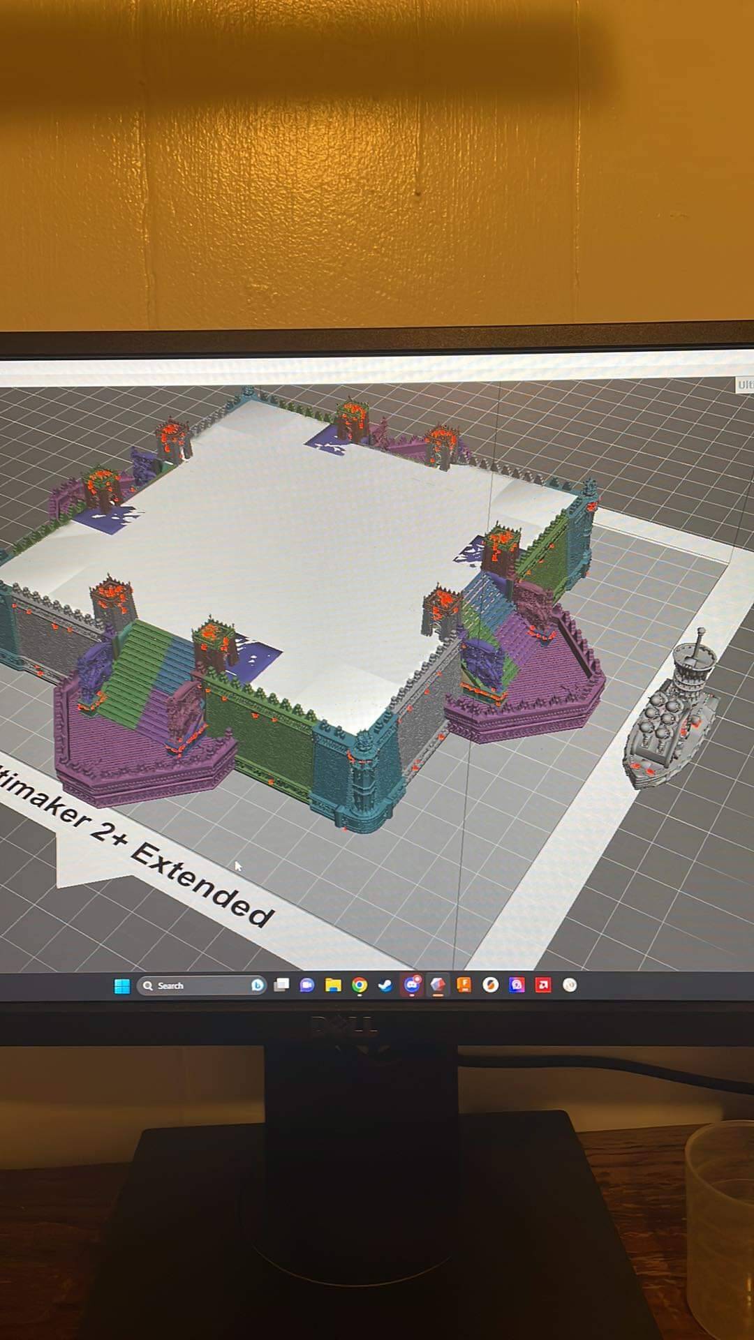 Excuse the crappy WIPs that definitely could’ve been screenshots but instead you have to deal with pictures of a monitor. How exciting, it’s like you’re right there with me doing this agony by symmetry and pixel alignment ANY% speedrun. Each wall section, corner piece, brazier, etc are all very detailed pieces, kudos to LKM. Meshmixer is a bit of a clumsy program in my opinion and I definitely had to split this into 3 cake layers for sanity, as well as printability (more on that later). Scale is a little nebulous in games like Man 'O War but I did my best to strike a happy medium between Admiral’s reference, the Chorf fleet sizing, and what I figured would be feasible to print/paint.