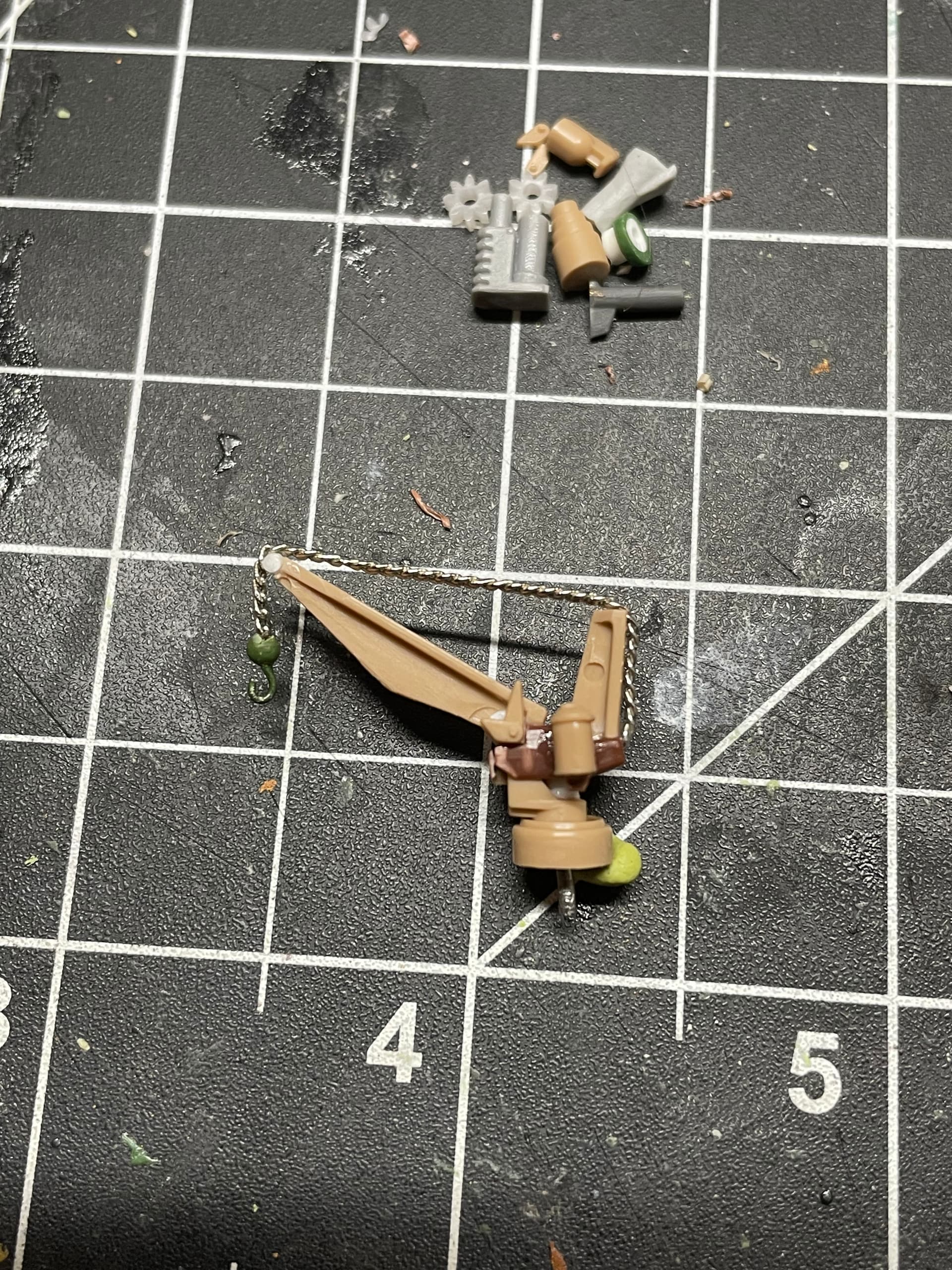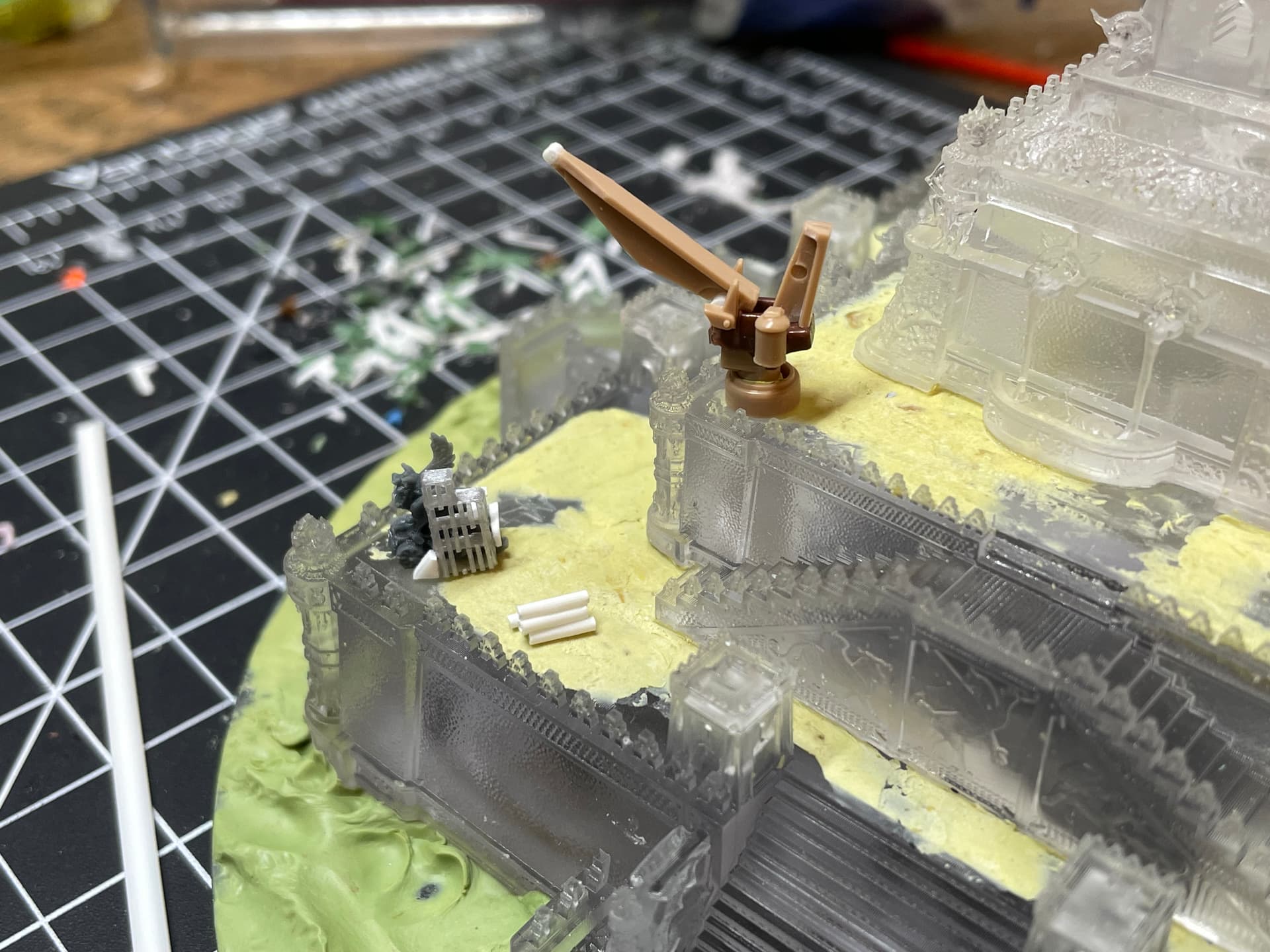 Decorating was a true joy. This micromachines crane was made using itty bitty bits from a large scale Merkava tank kit. Don’t ask how long it took to get that crane right. One of the Anzu cannons had broken wings so I leaned into the skid with a little construction scaffold made of FDM support refuse. Tau and Ork grenades and ammo proved useful as well as some other greeble bits to add a bit of industrial seasoning to the dish. A little rubble and loose rock added more visual interest (anyone who hears those in a Rock Raiders voice is a true champ in my book).