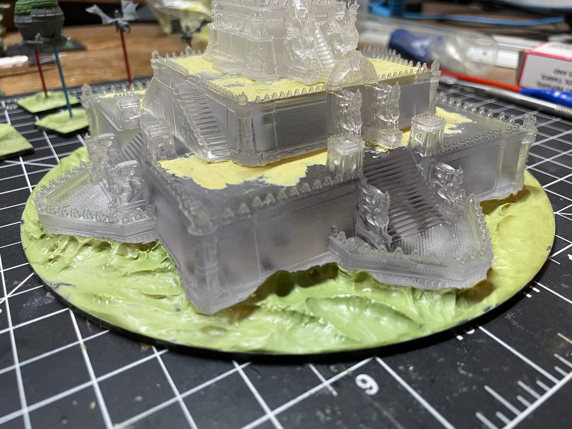 Fortunately I had the unintended foresight to put a thumb hole in the center of the base which served as a painters palette style holder and a true lifeline during the entire process. Doubtless I would’ve dropped the thing at some point without it. Really I was just being cheap and saving plastic by making the base a donut.