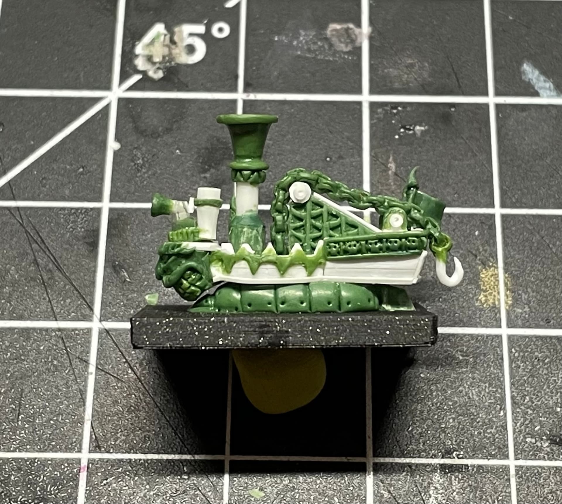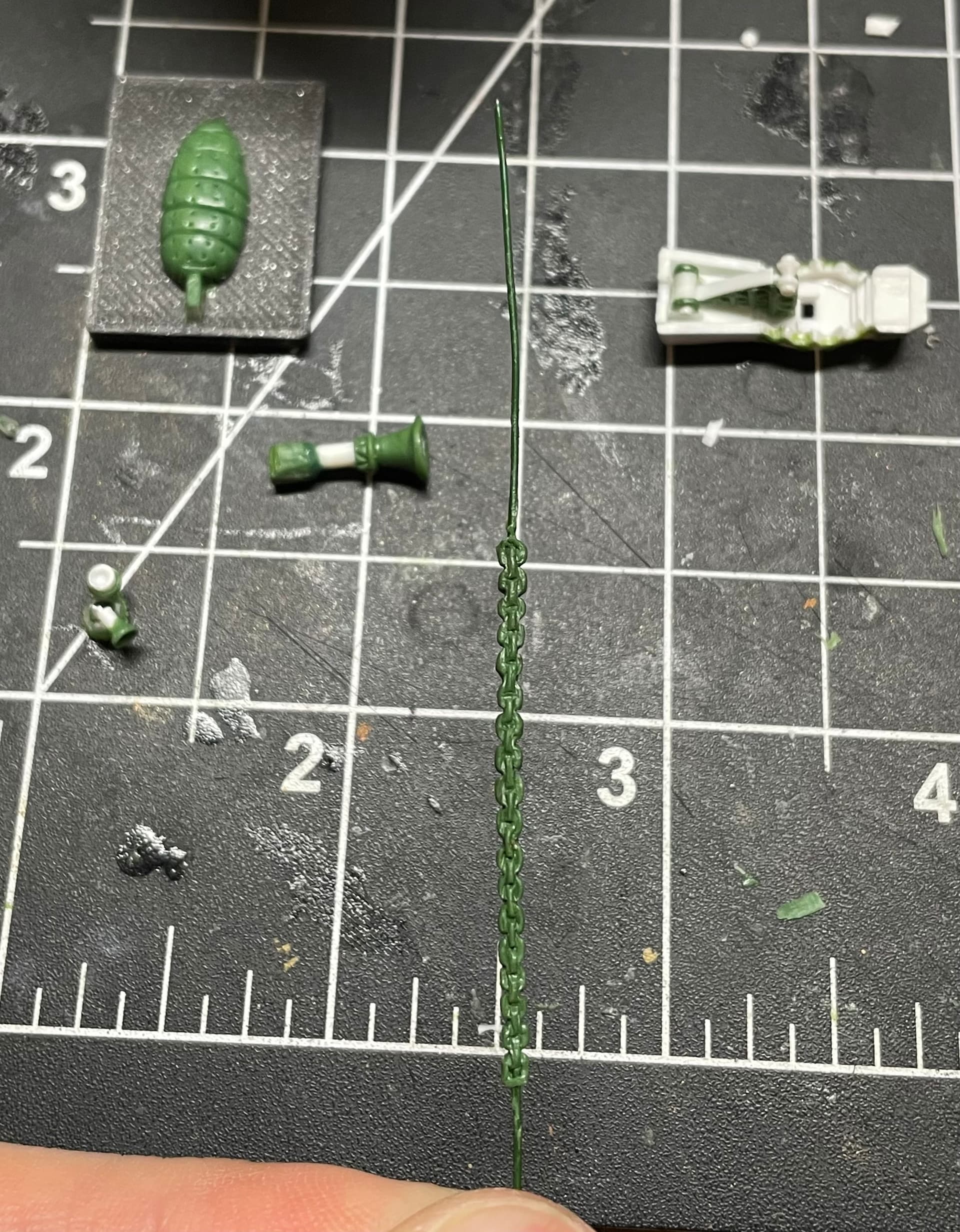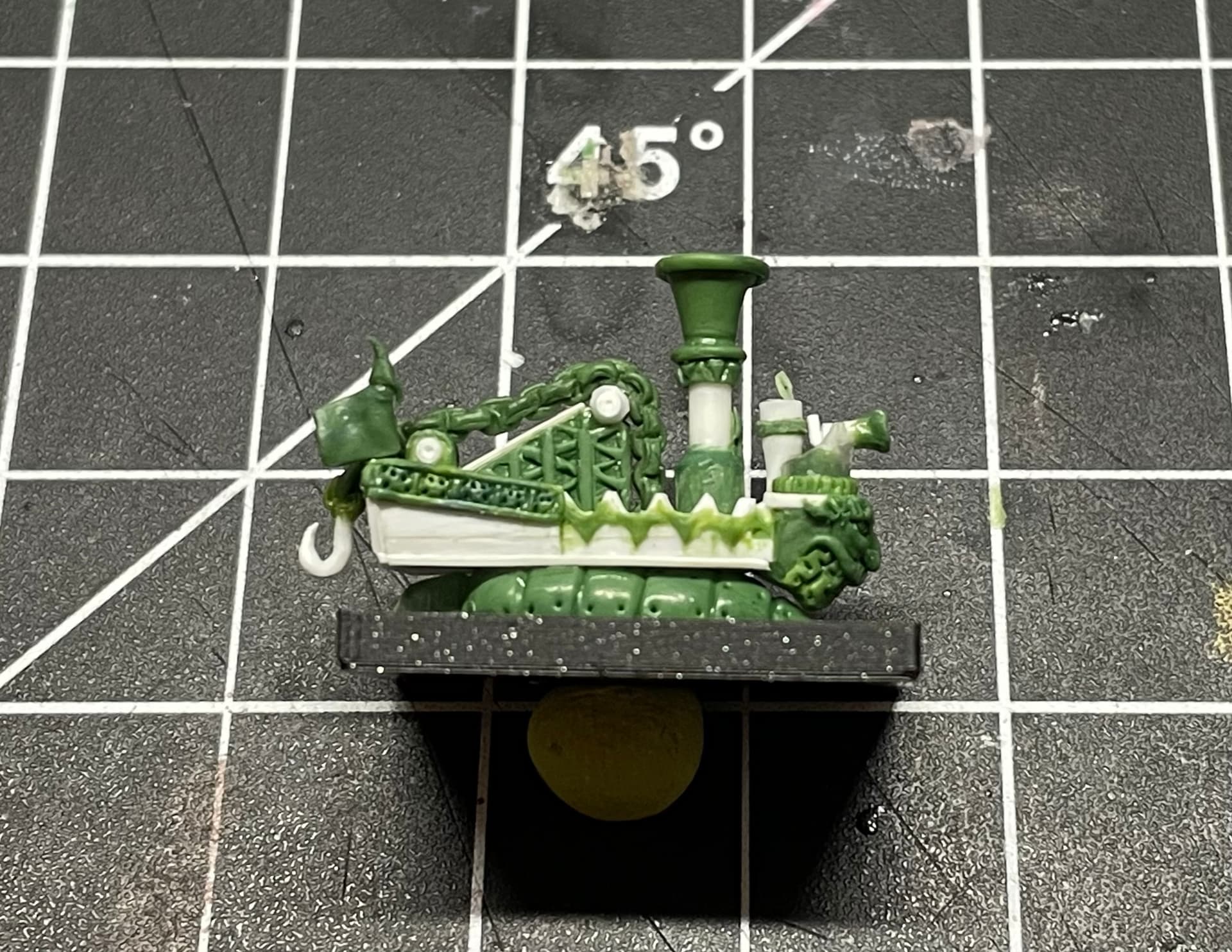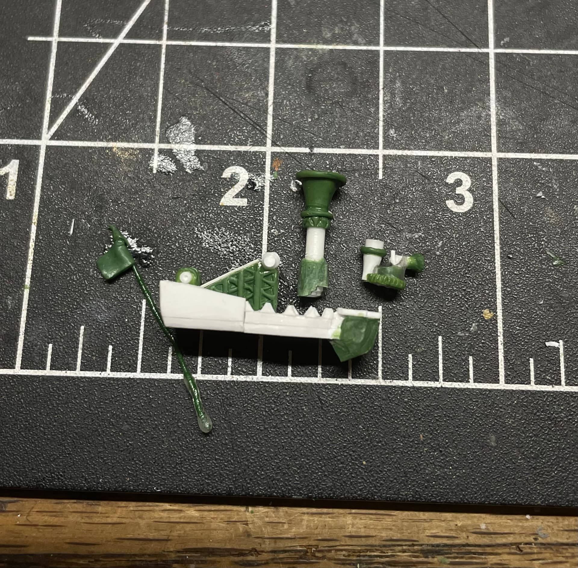 Decorating was a true joy. This micromachines crane was made using itty bitty bits from a large scale Merkava tank kit. Don’t ask how long it took to get that crane right. One of the Anzu cannons had broken wings so I leaned into the skid with a little construction scaffold made of FDM support refuse. Tau and Ork grenades and ammo proved useful as well as some other greeble bits to add a bit of industrial seasoning to the dish. A little rubble and loose rock added more visual interest (anyone who hears those in a Rock Raiders voice is a true champ in my book).