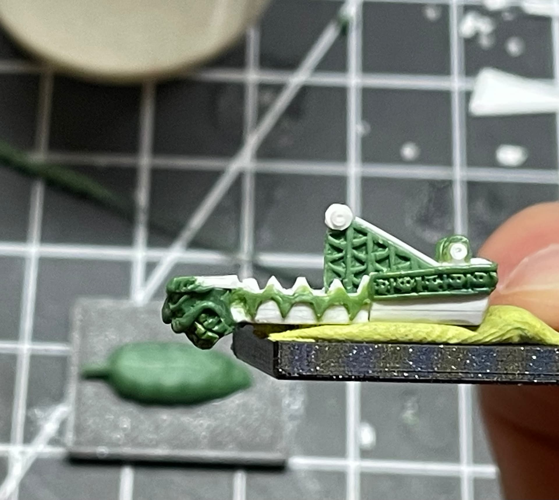 Cleanup was difficult but well worth the time, trying to find the tiny supports on the clear. Milliput covered up and added some variety to the flat surfaces. Milliput (2/3) and green stuff (1/3) mixture and smooth sculpting tools proffered smooth sailing on the wave texture.