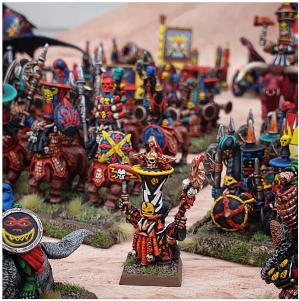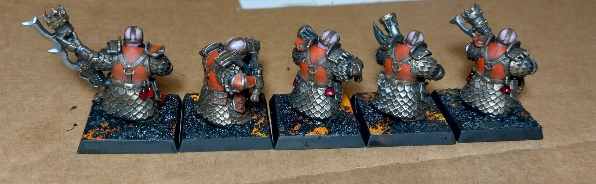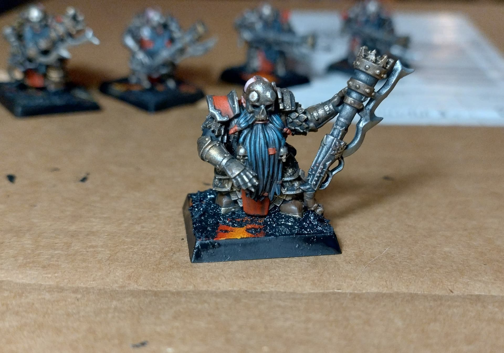 So wanted to know what people have been doing, and if there are any funky colour schemes out there? I honestly love the classic red/gold/black, but have seen glimpses of yellow/black, purple/black, and even all orange beards!!! So… anyone want to share their Chaos Dwarf armies in their fancy wears?
