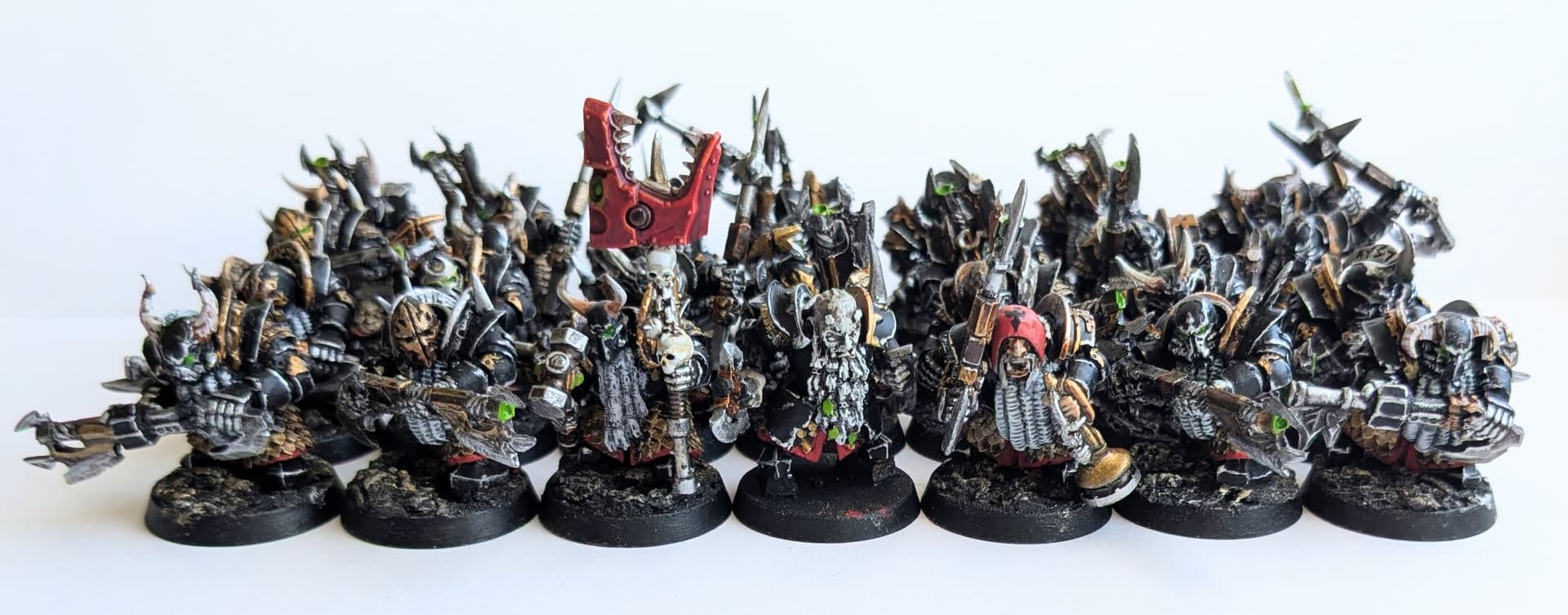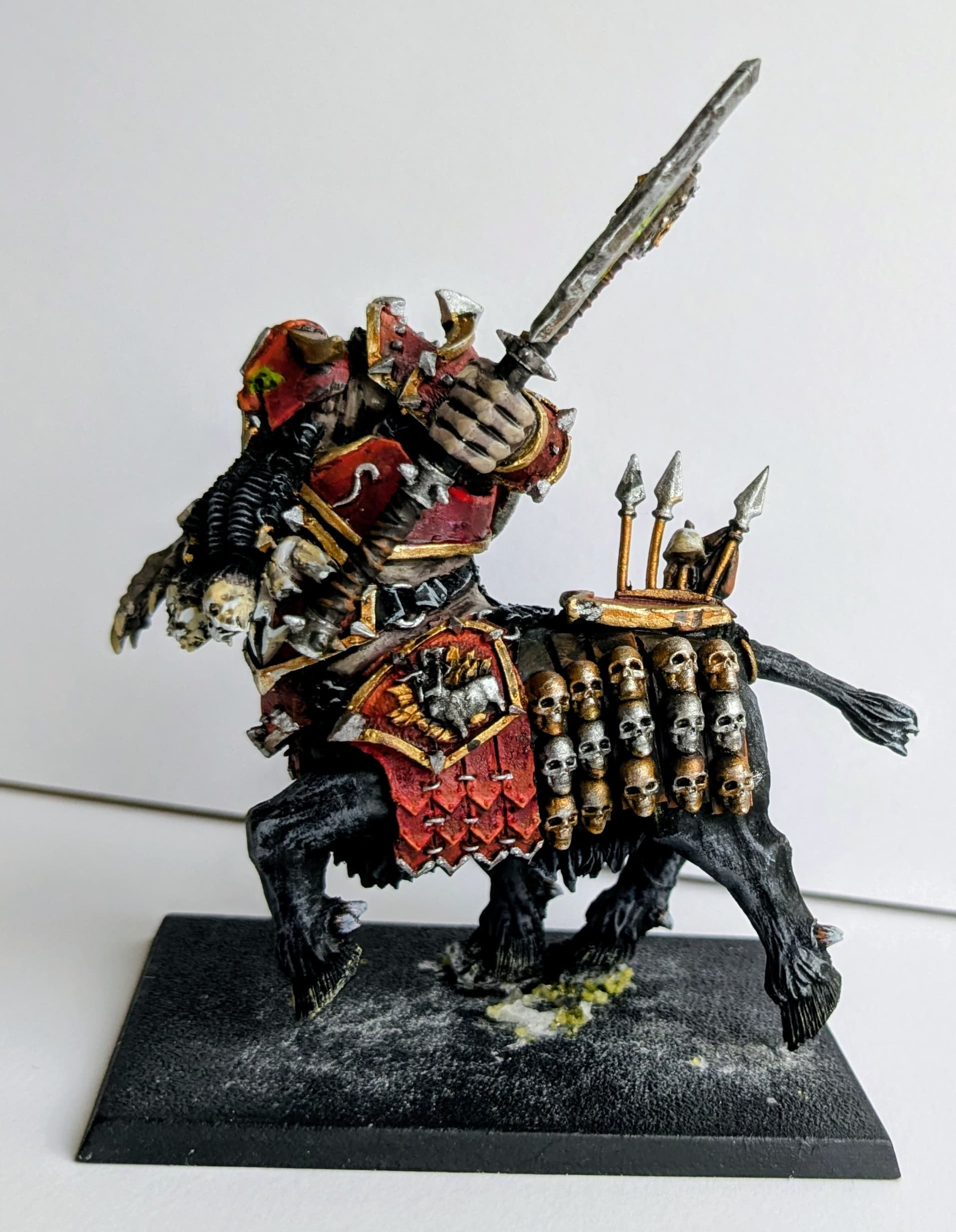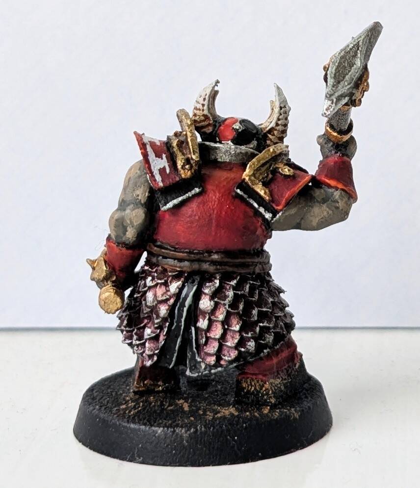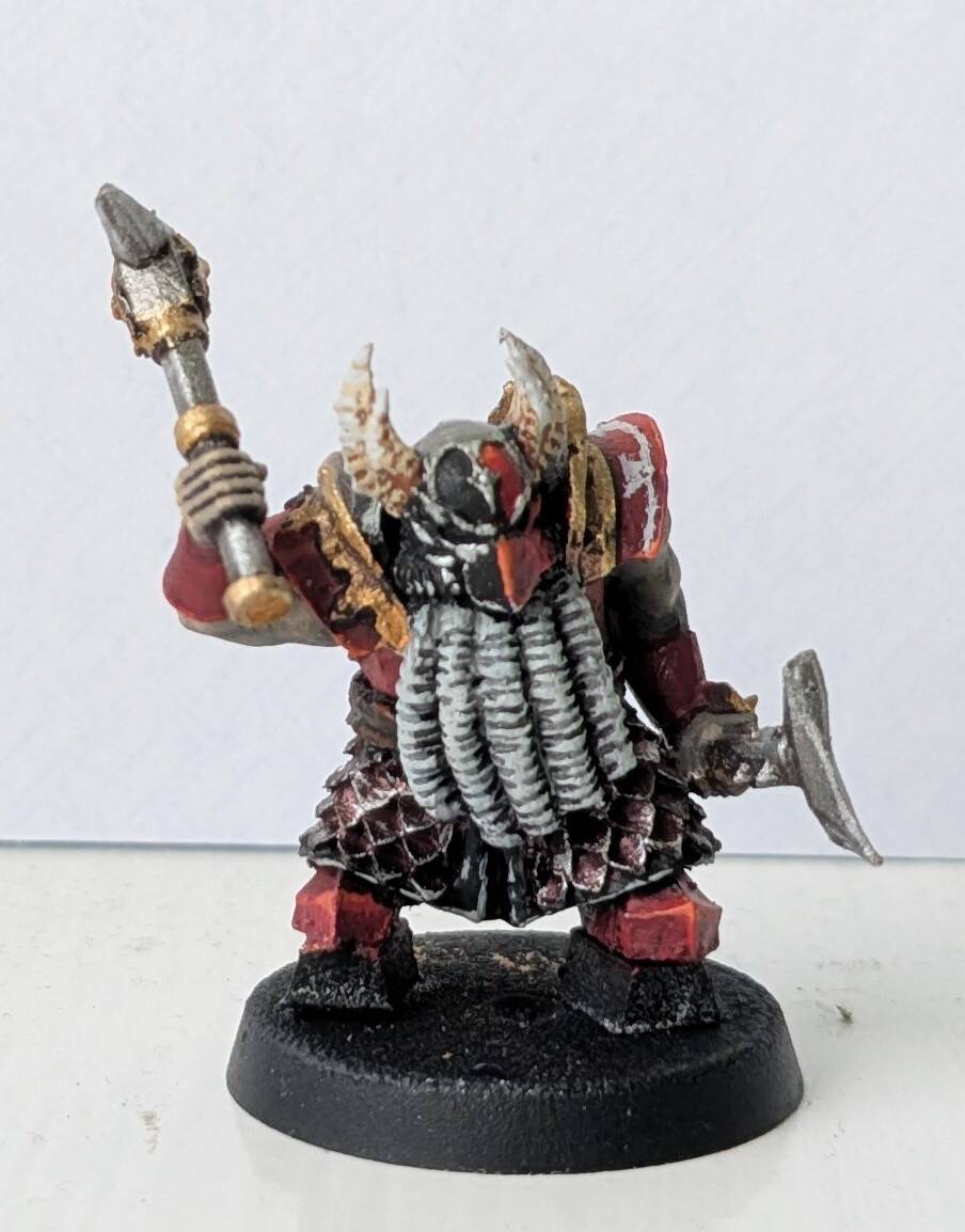 Quite pleased with how they came out, however the black has no highlight other than the silver. So it’s quite flat looking really. And the red trim has no shading. So I may revisit. I’ll add a shield from the Helsmiths kit to the champion.