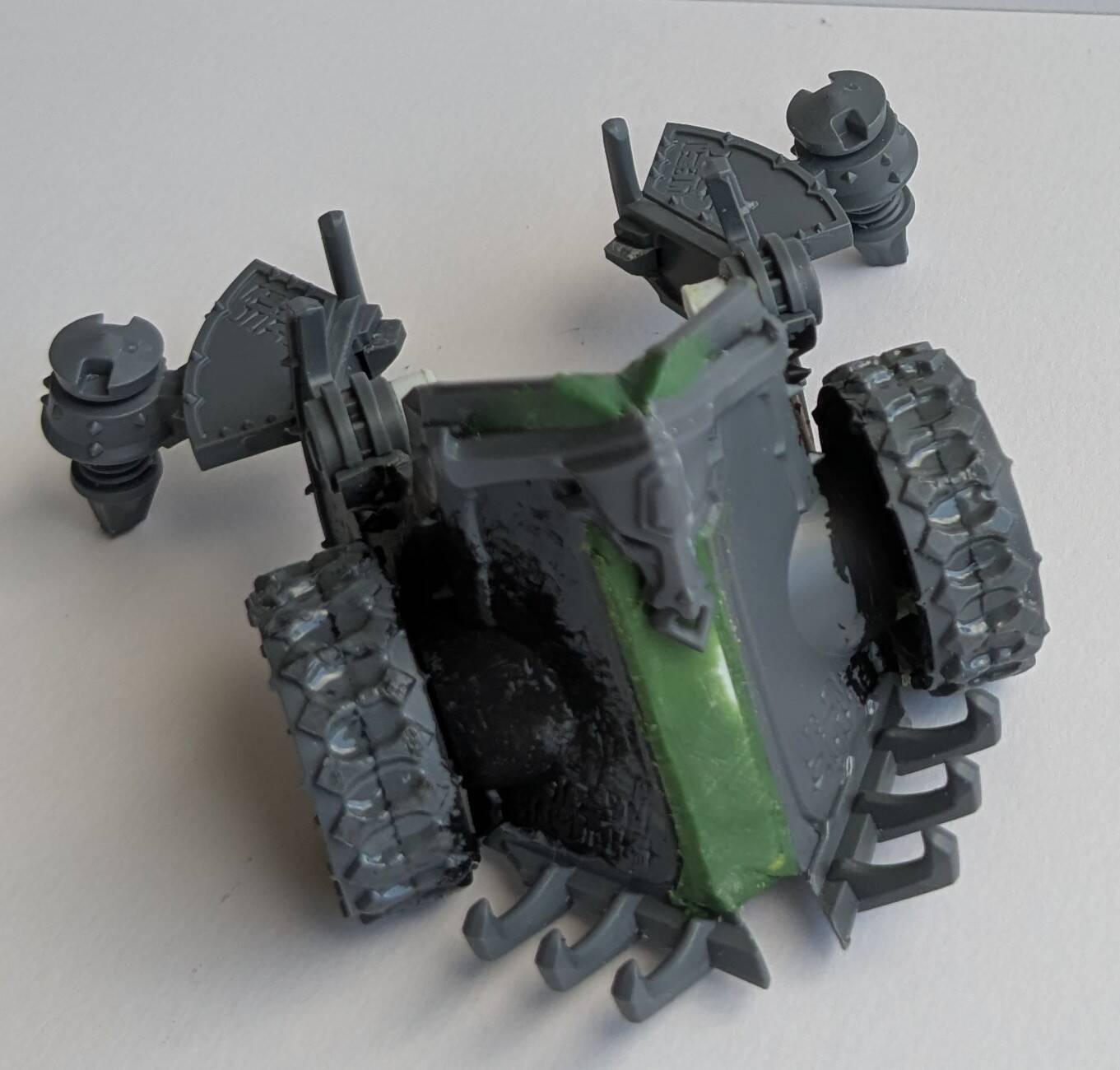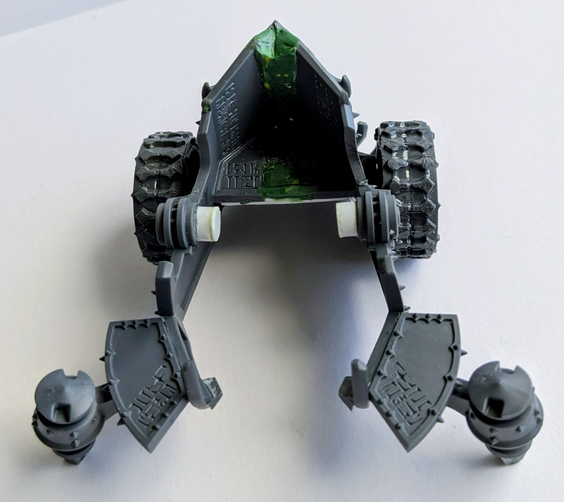 The hardest part was trying to make the wheel halves level after filing, as there would be big gaps. I flooded the gaps between the tread with poly cement to try and blend it. Generally worked.