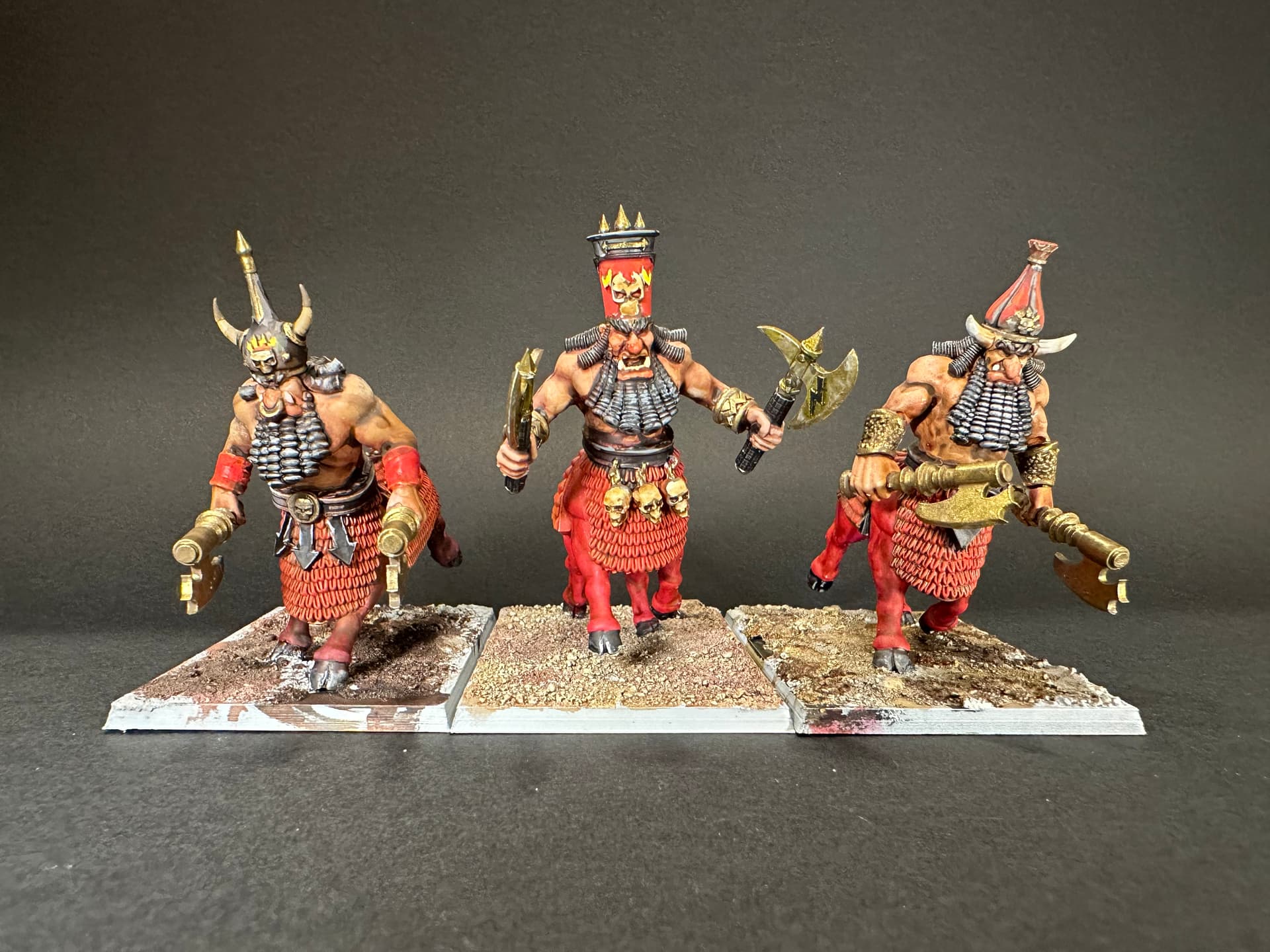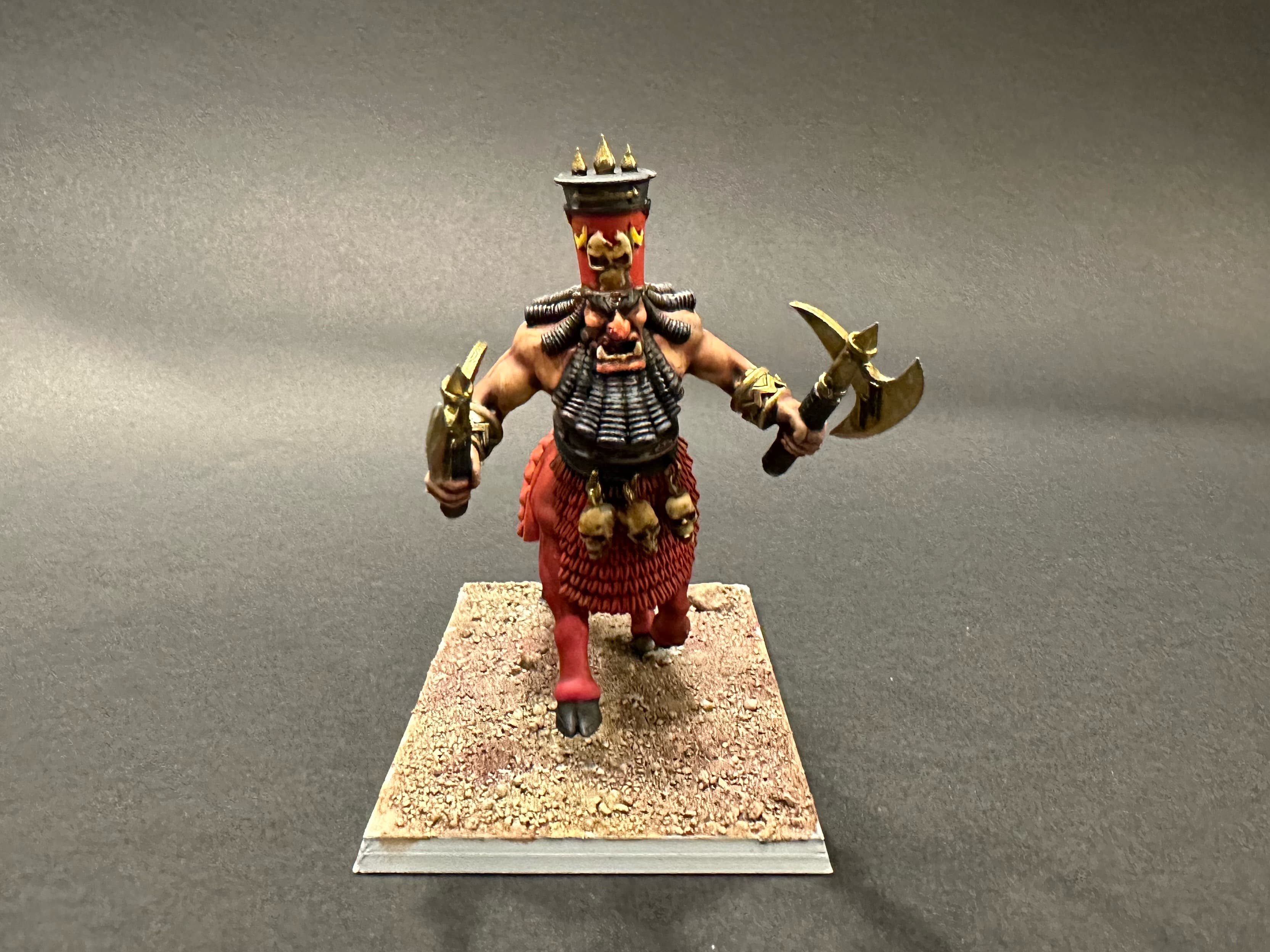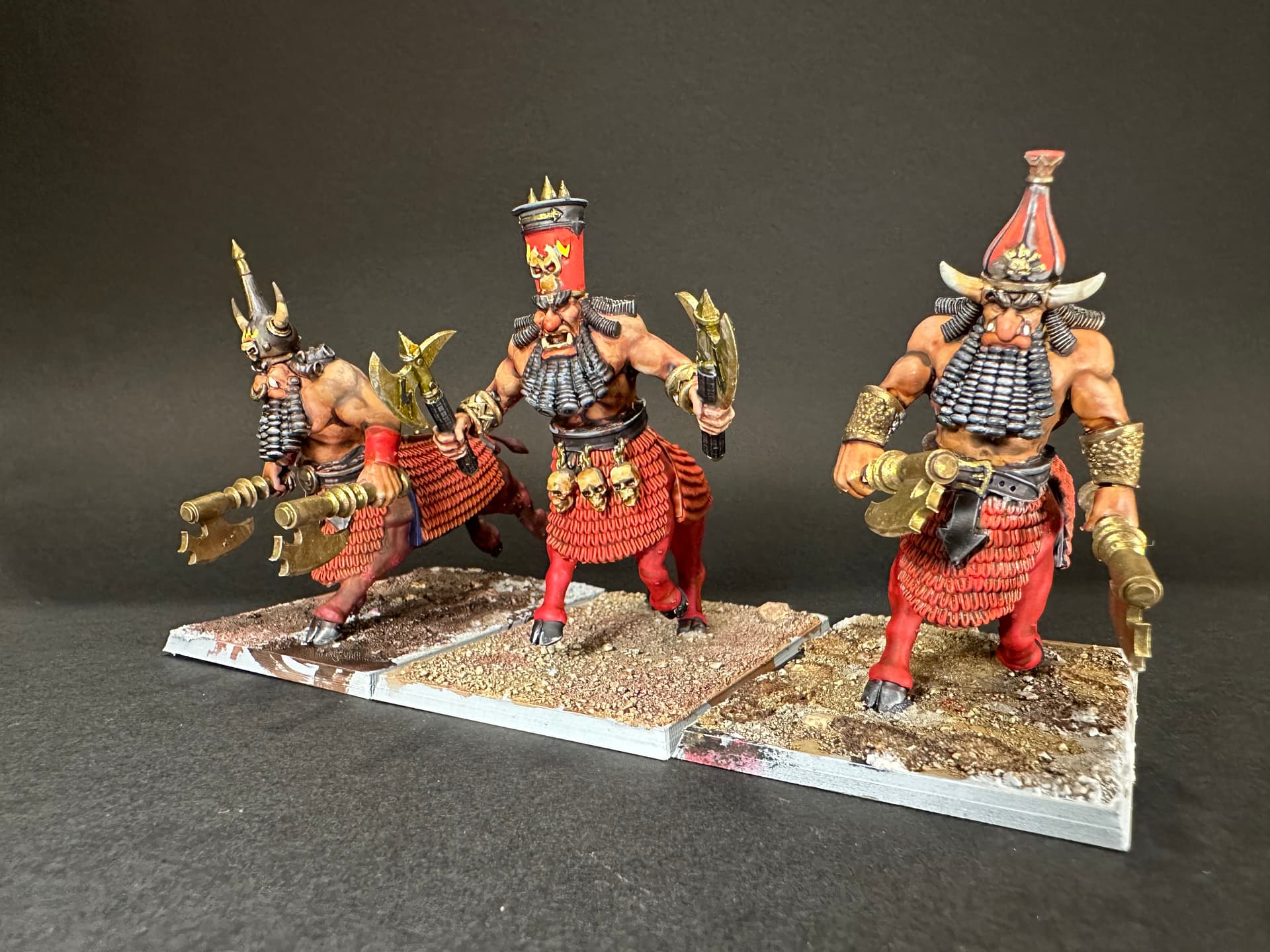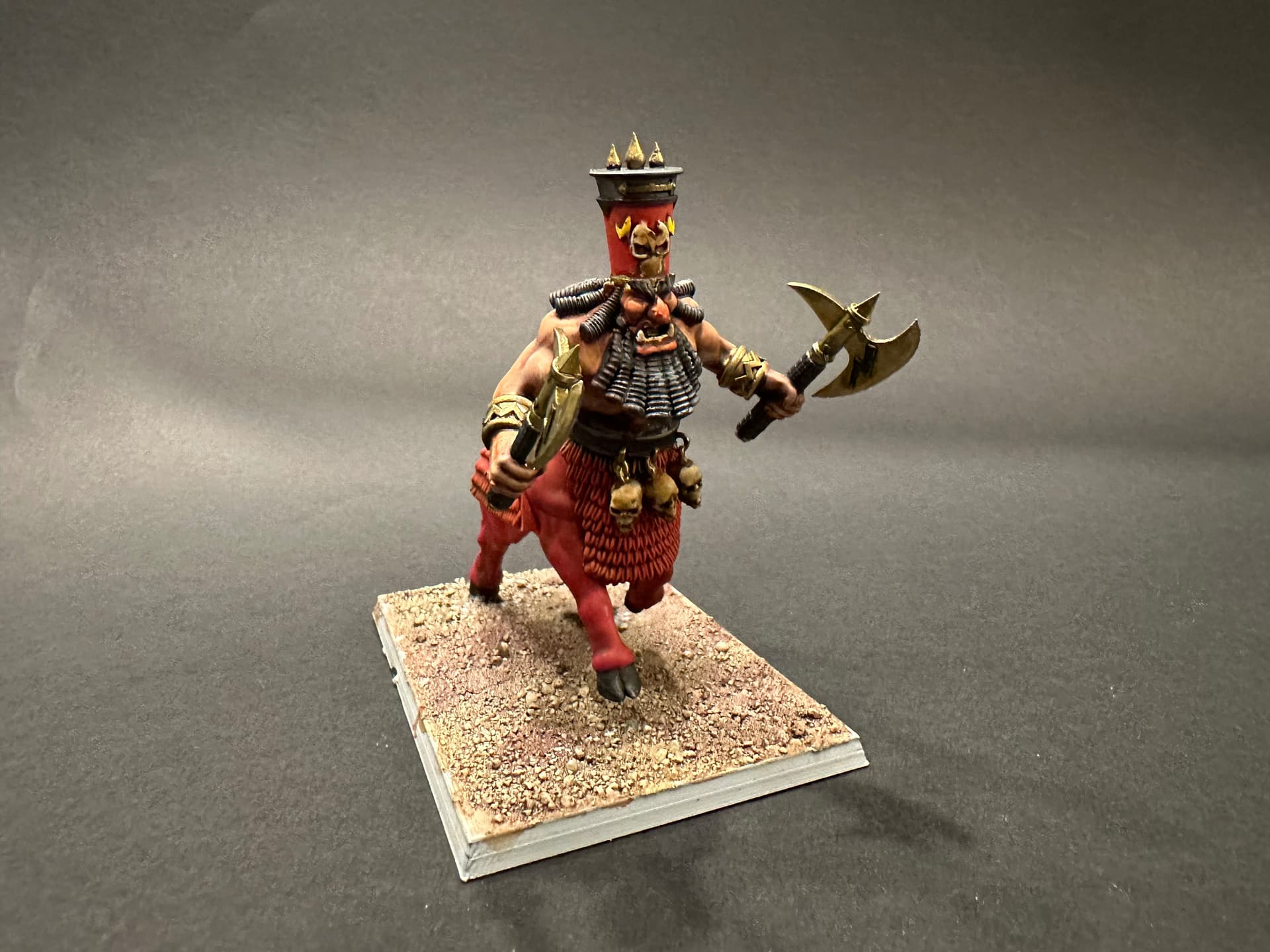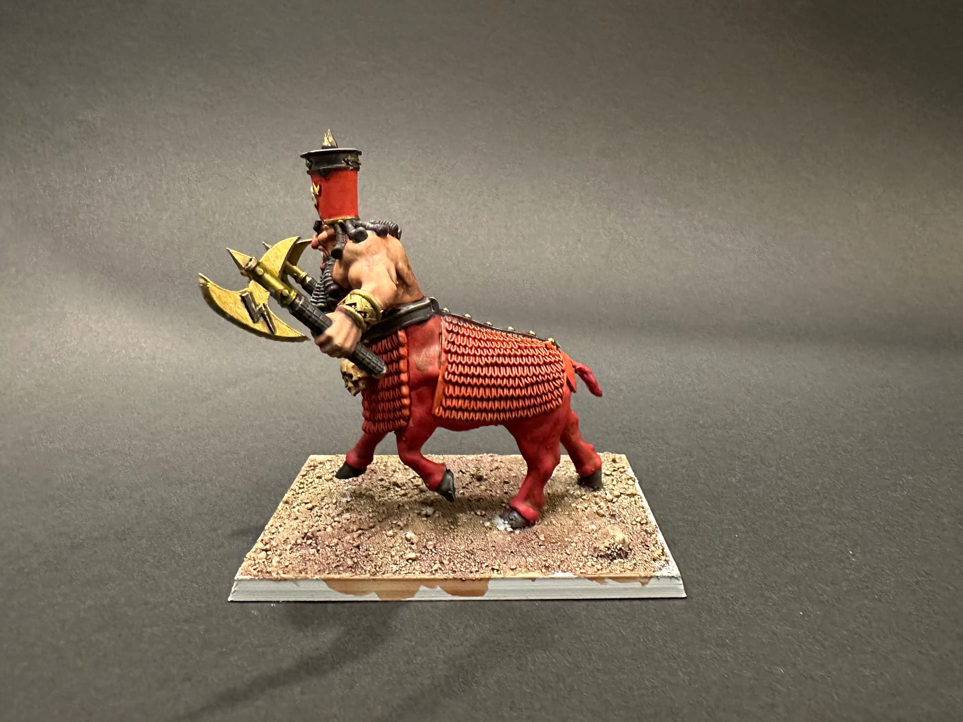 First of three of Brawn’s noble half-bulls. Really love these models. I fooled around with several techniques for getting that much skin to look nice before falling back on sponging on a few colors and then applying successive washes to get a natural feel. What do you guys do for big patches of skin?