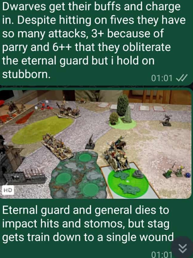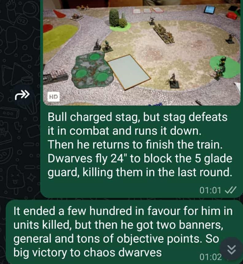 My brotherās thoughts. In the end the chorfs came out on top, looking quite like the victors, and having scored many objective points as opposed to the wood elvesā 0.