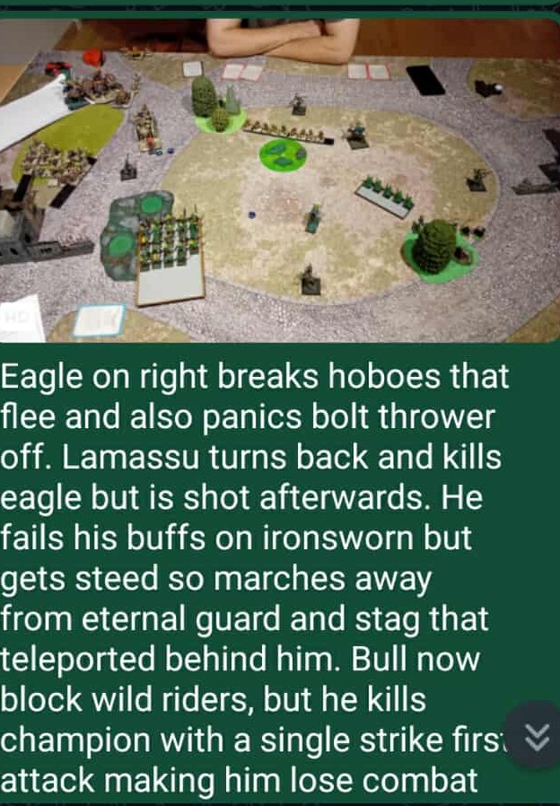 I lose a lot of points here in the final round. Unfortunately I roll an 11 on my bully castellanās break test, and low on the flee. As mentioned, that allows the wood elf stag to mop up both bull and weakened iron daemon in rapid succession. Unfortunate.