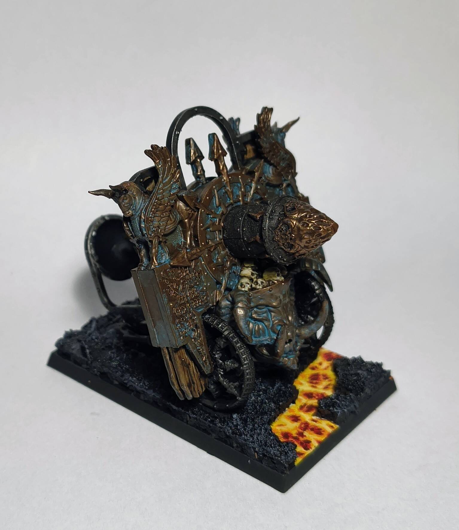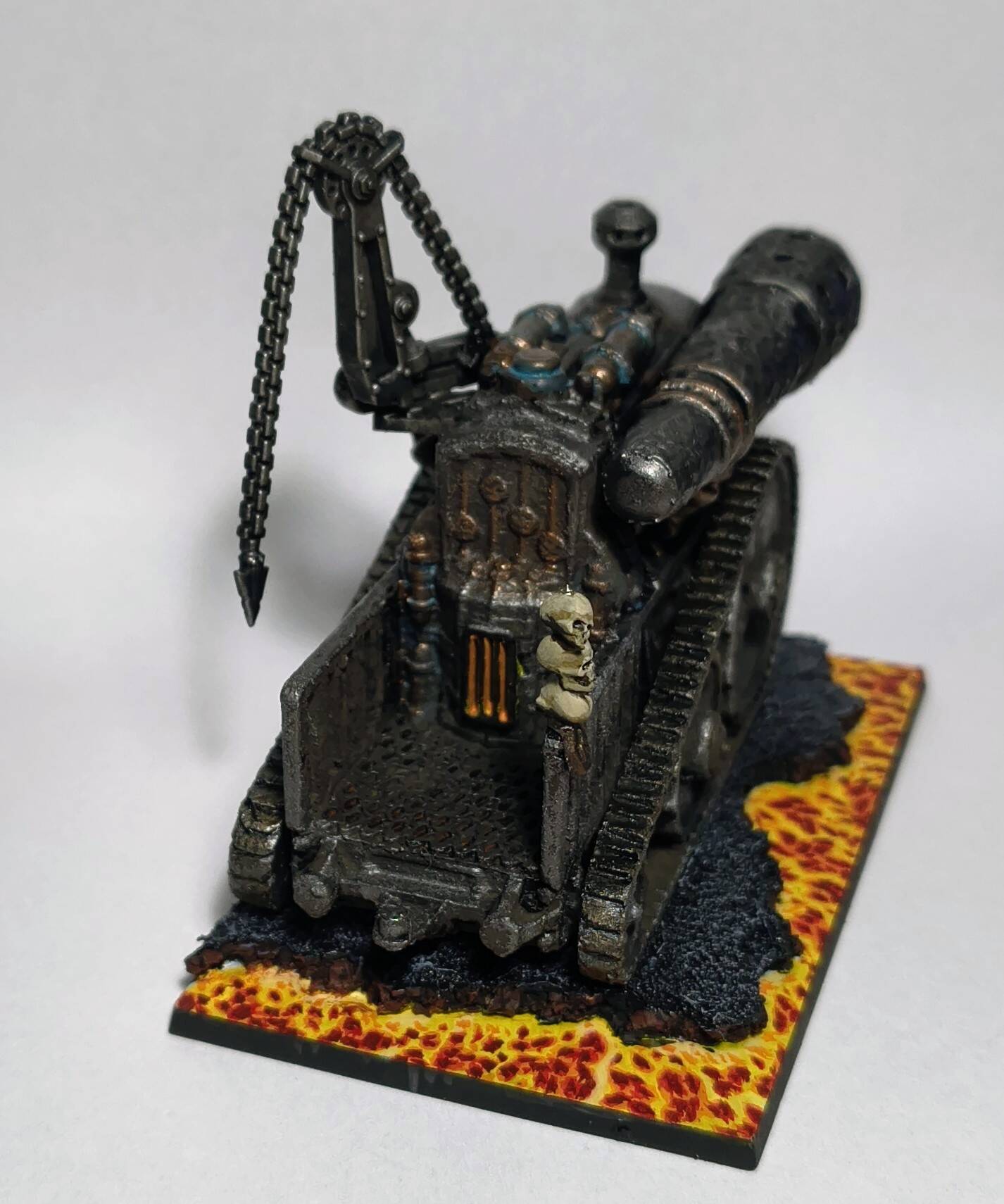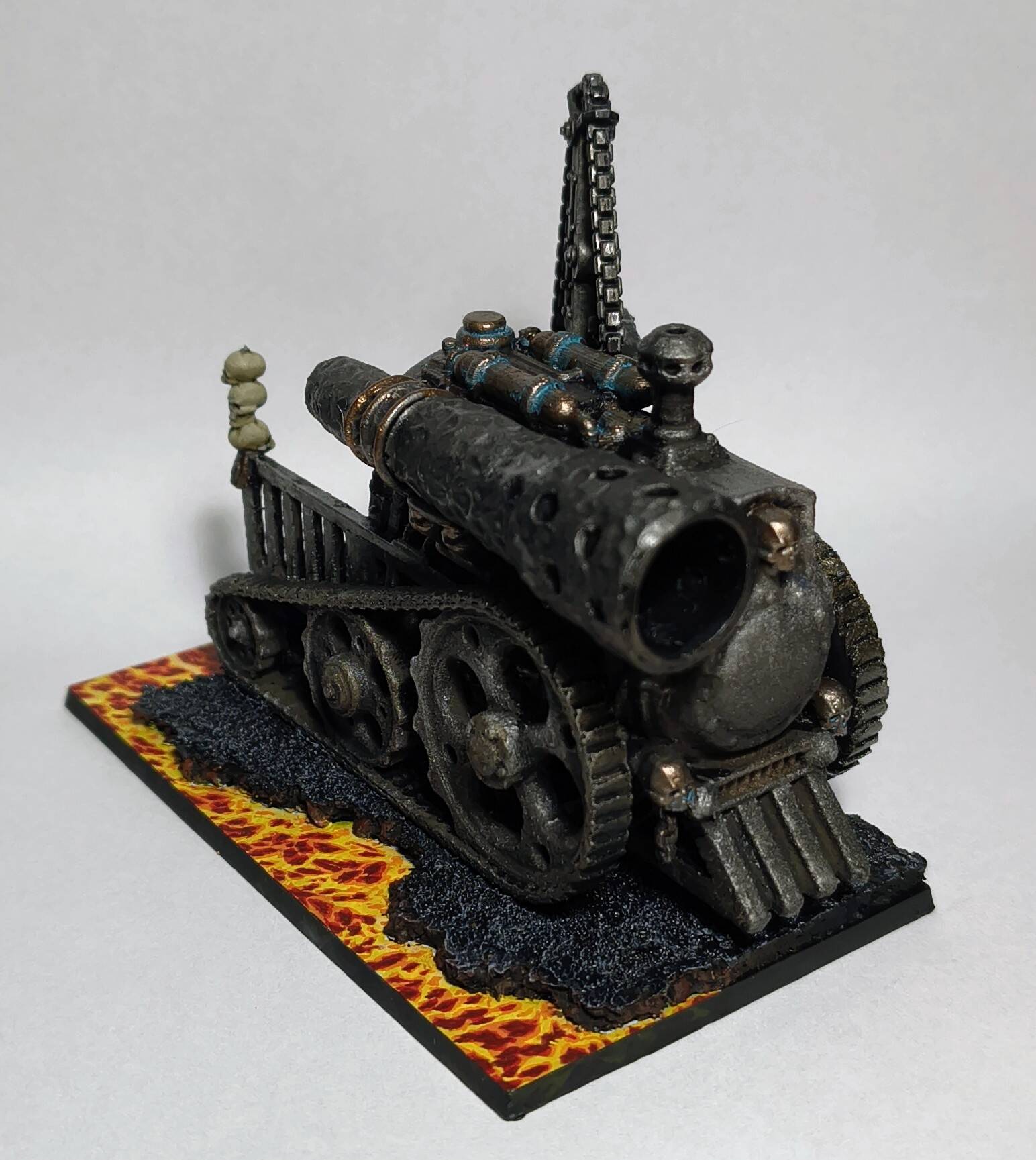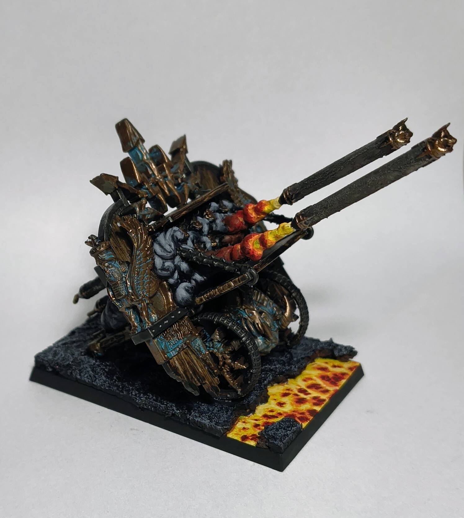 When I was done with blenderbuss infantry I wasn’t happy with my lava bases. But at the time I was finishing my hellcannon and as you probably know its base is hudge. So there was some space to make some experiments. I ended up with something like this :
