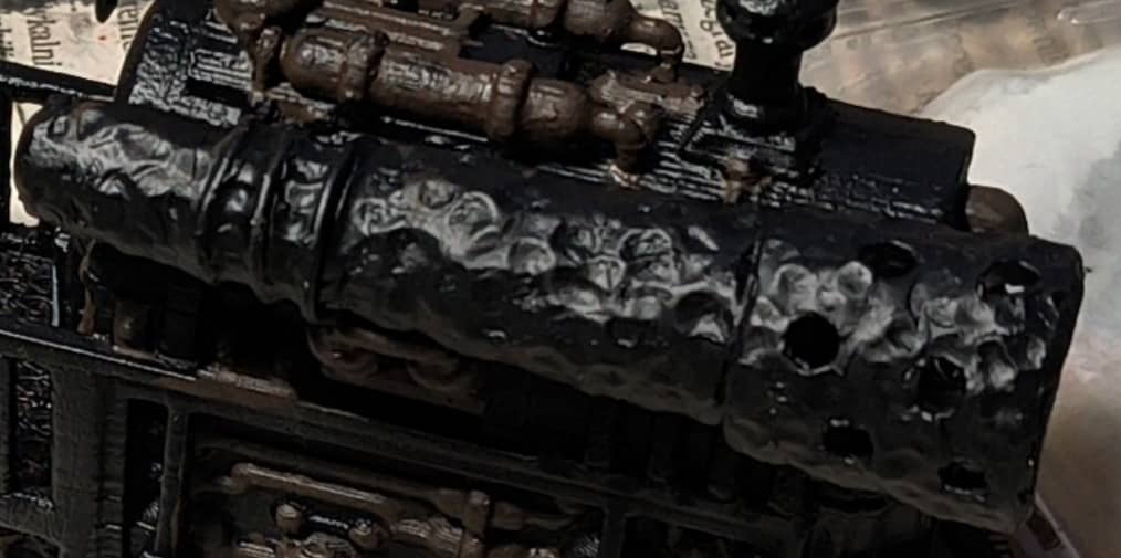 Because cannon had absolutely no texture, I put in it some greenstuff and made something like casting surface with rear end of paintbrush.