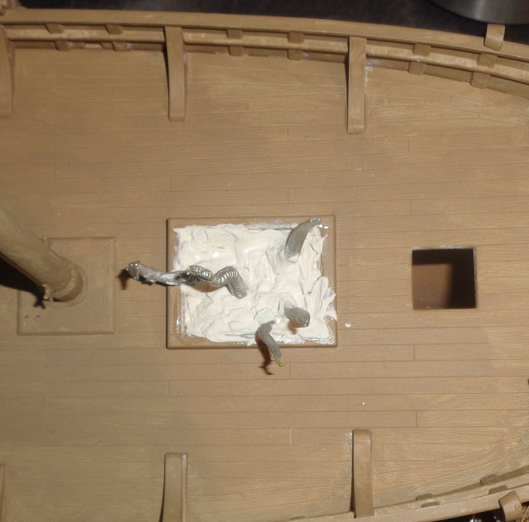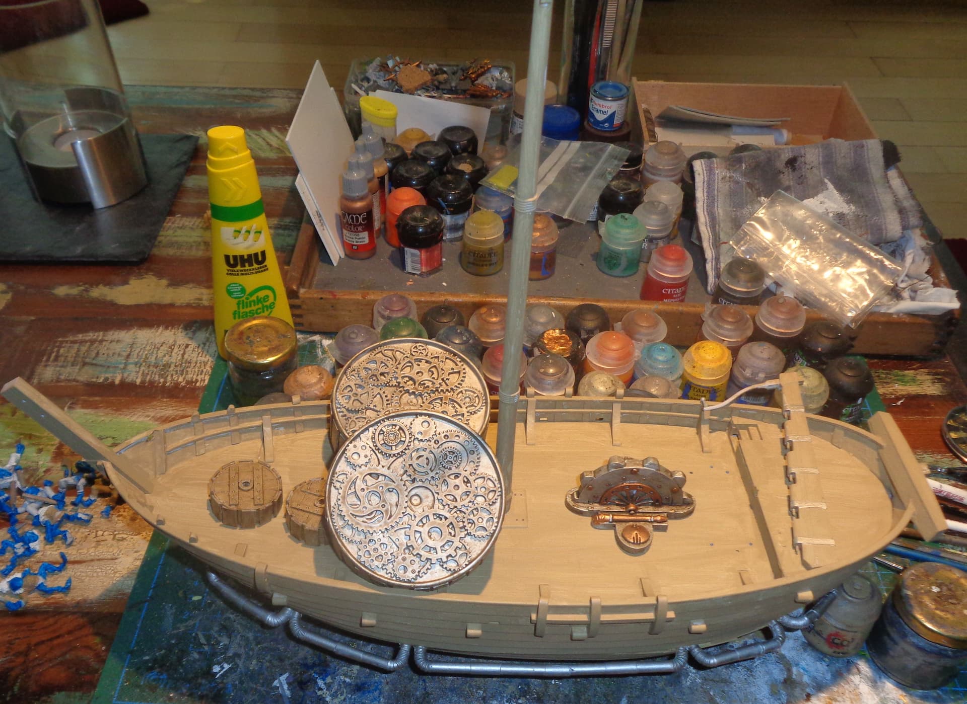 With the land ship it goes slowly but icher. To cover the gaps on the hull, pipes are now attached. Let’s see how it will look like finished …