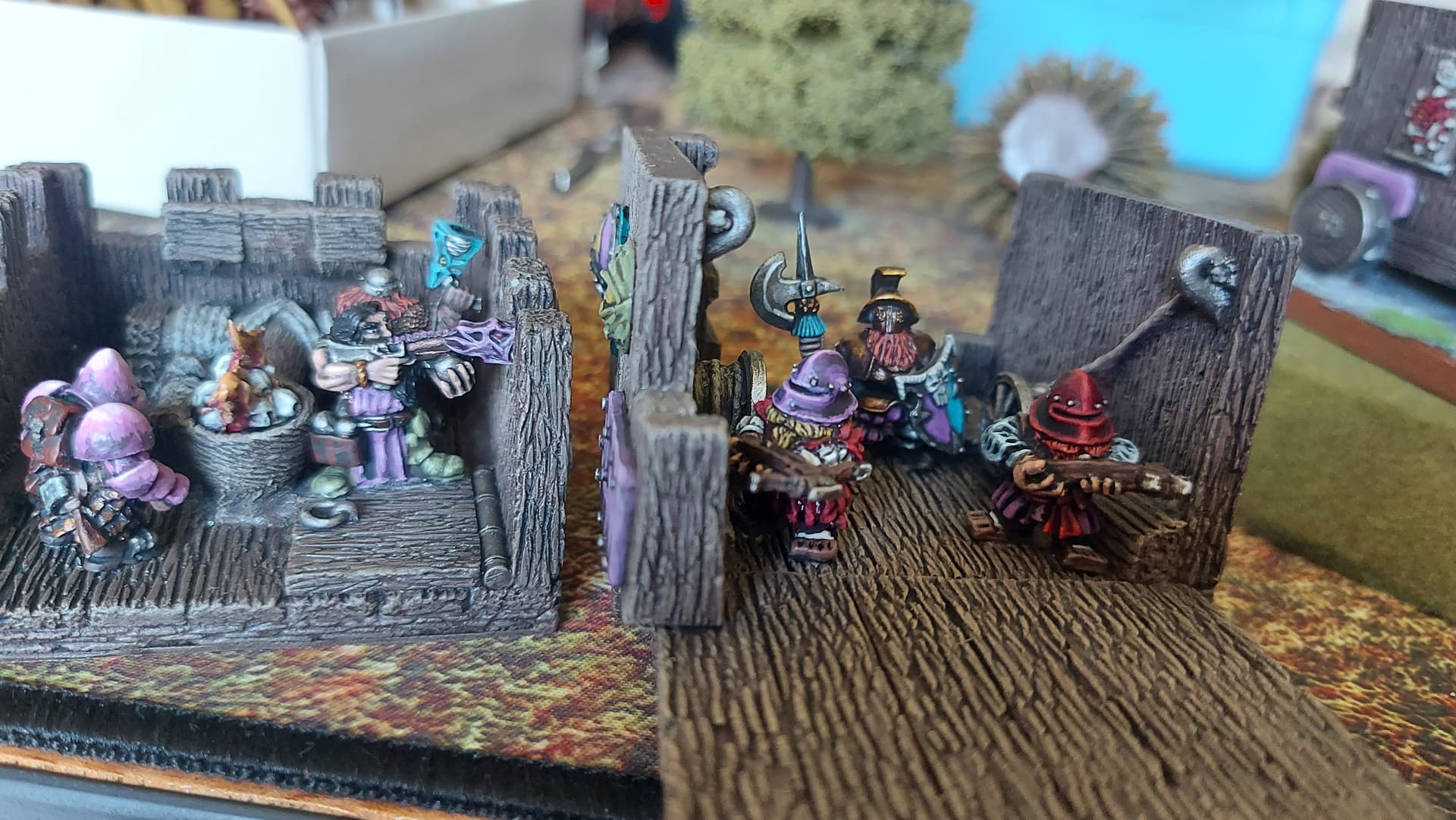 . The 2nd floor has some tag dwarf crossbowmen with a random drunken conversion of an empire halberdier cut up to hell and glued back together with a gladiator helmet. On the top floor there is the lovely old school miniatures wheelbarrow guy with a couple of ralparta blunderbusses and a flaming skull catapult
