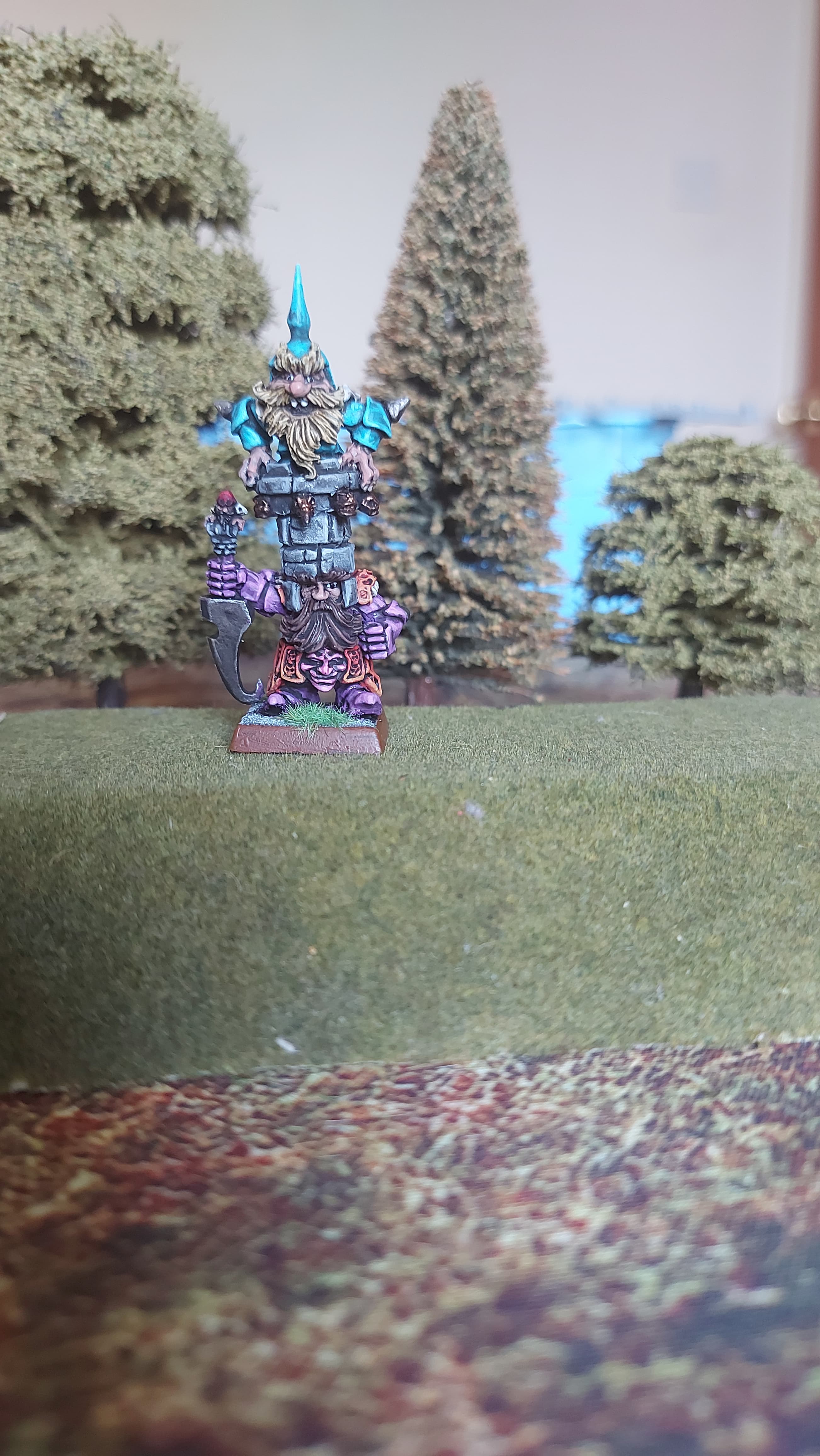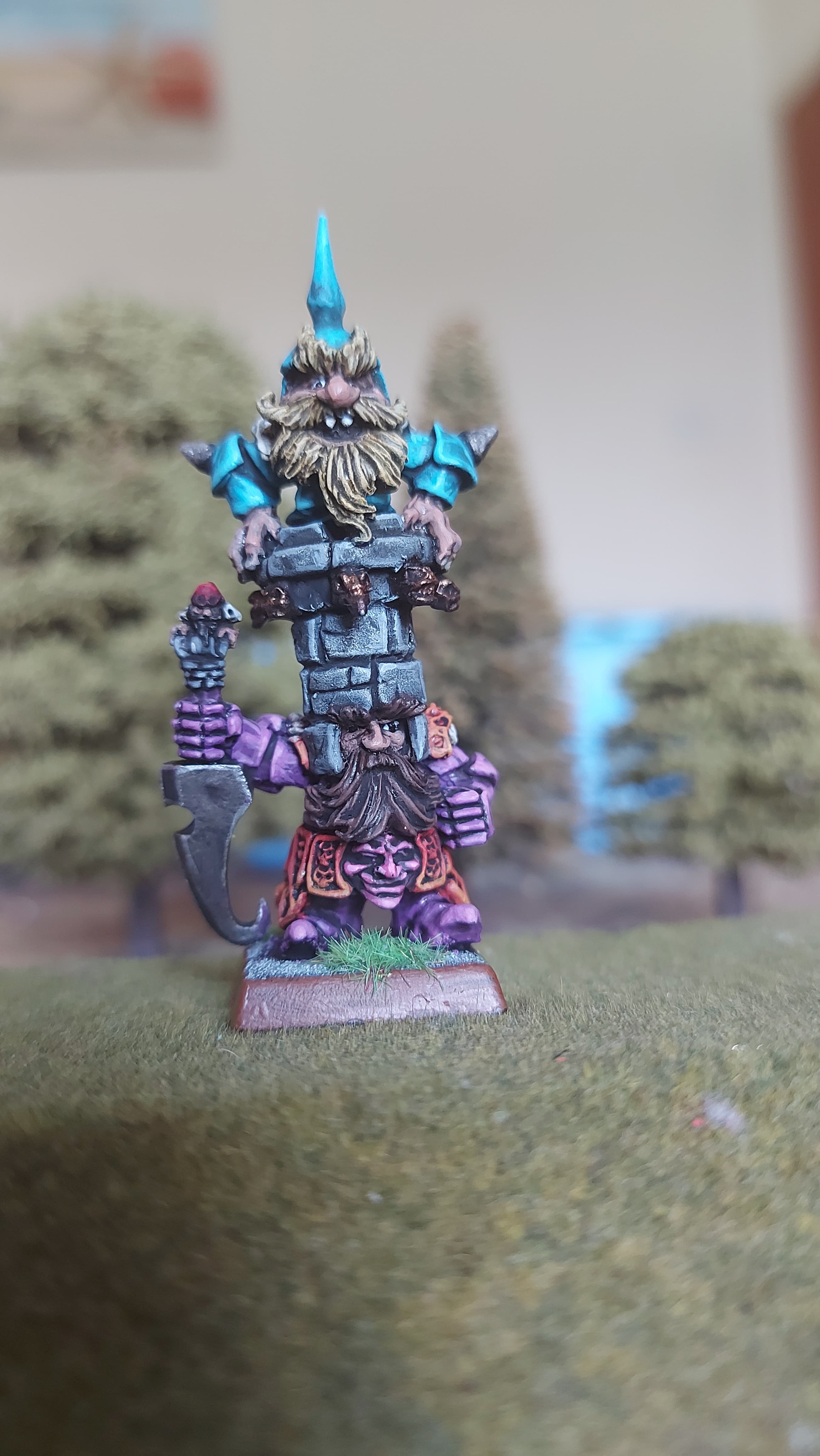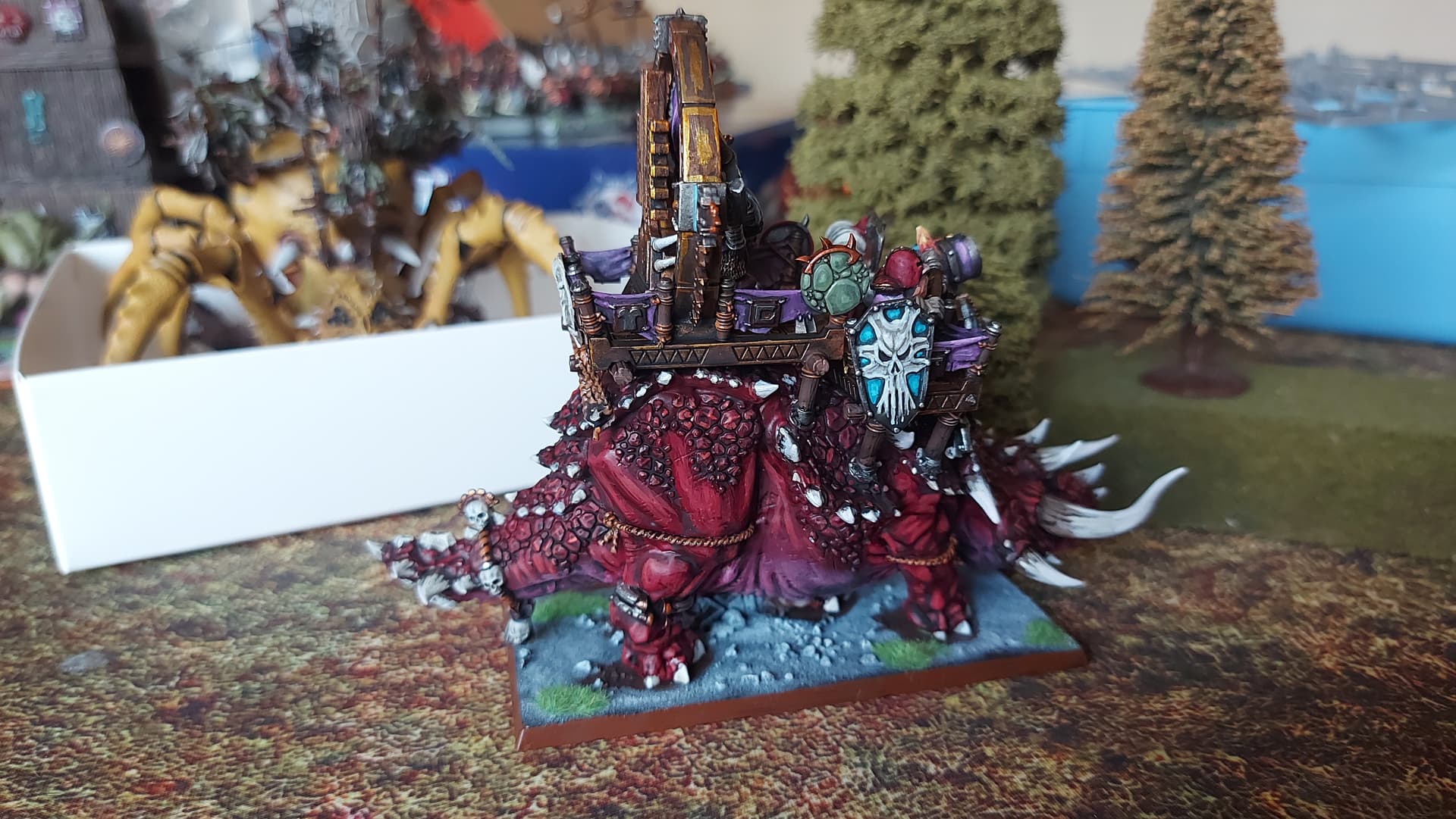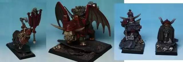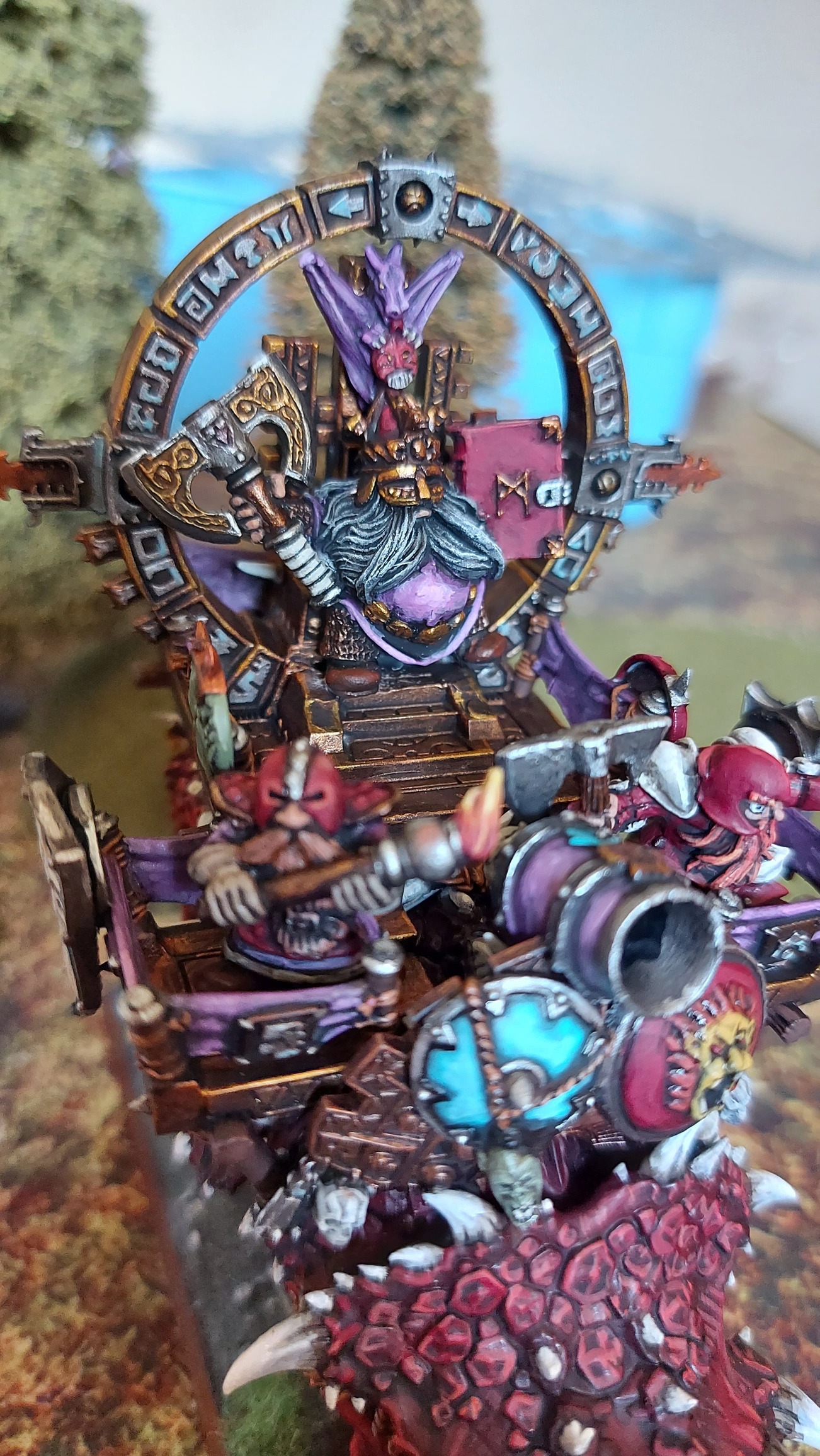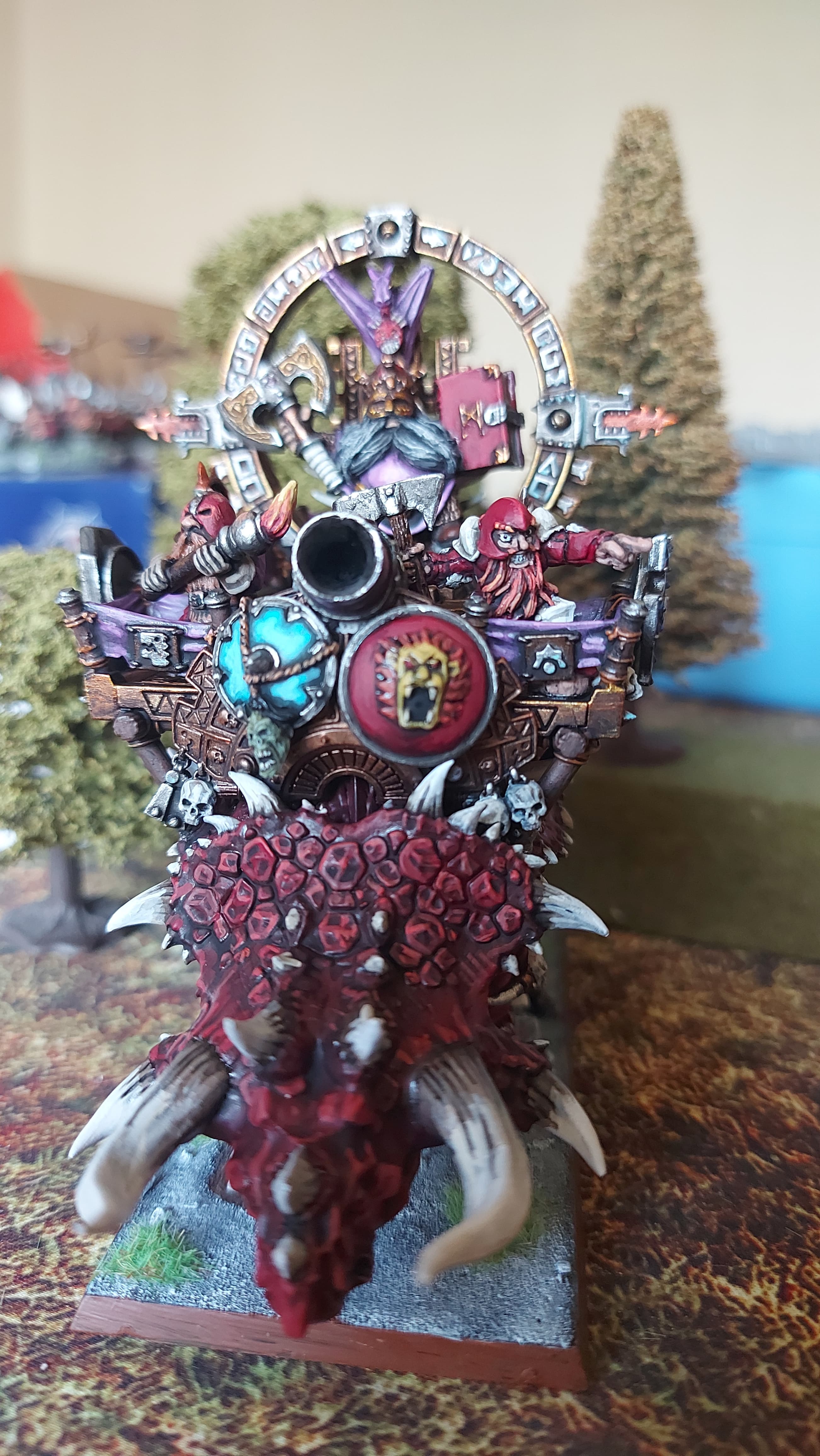 And lastly my fat baron ( this might actually be the dwarf high king…not sure) riding a big stegadon (colossus) with a lovely executioner style crewman also from zanko(i owe him) and a macrocosm dark dwarf. The dwarf was so fat i had to cut away alarming amounts of his throne. I was determined to use this high king guy in something. I tried to make him look as evil as possible to fit in