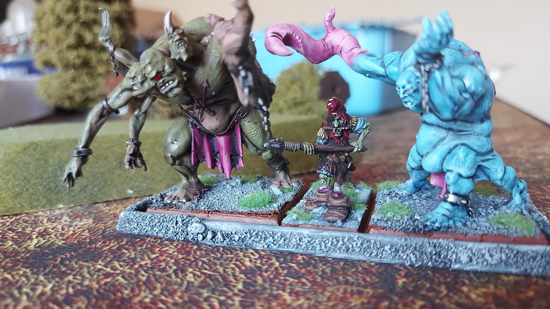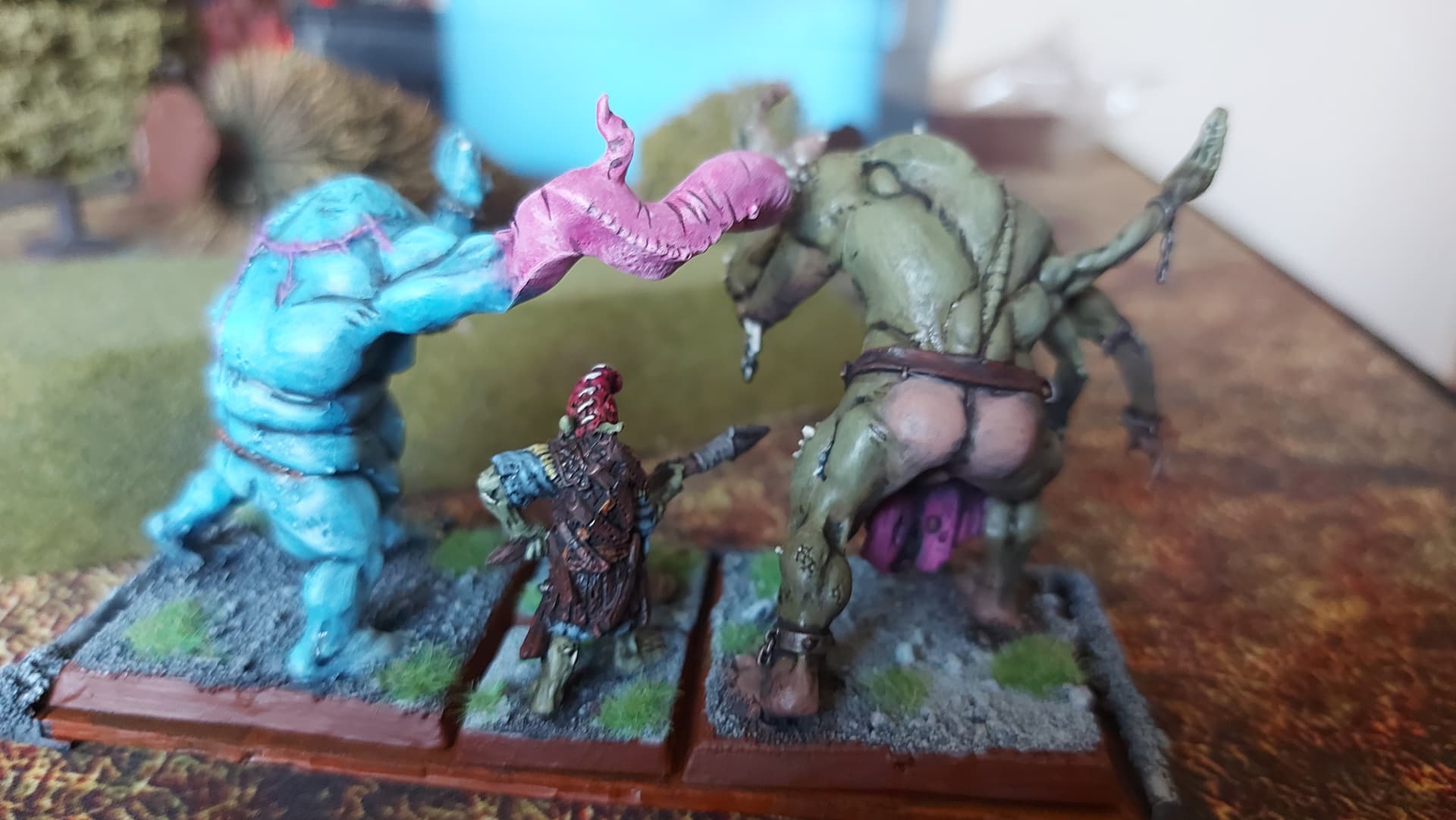 I had to think a bit how the siege tower would be pushed to came up with these chaos mutant demon ogre beasties prodded by a hobbo slave driver from admiralty miniatures and his best mate who accidently got eaten